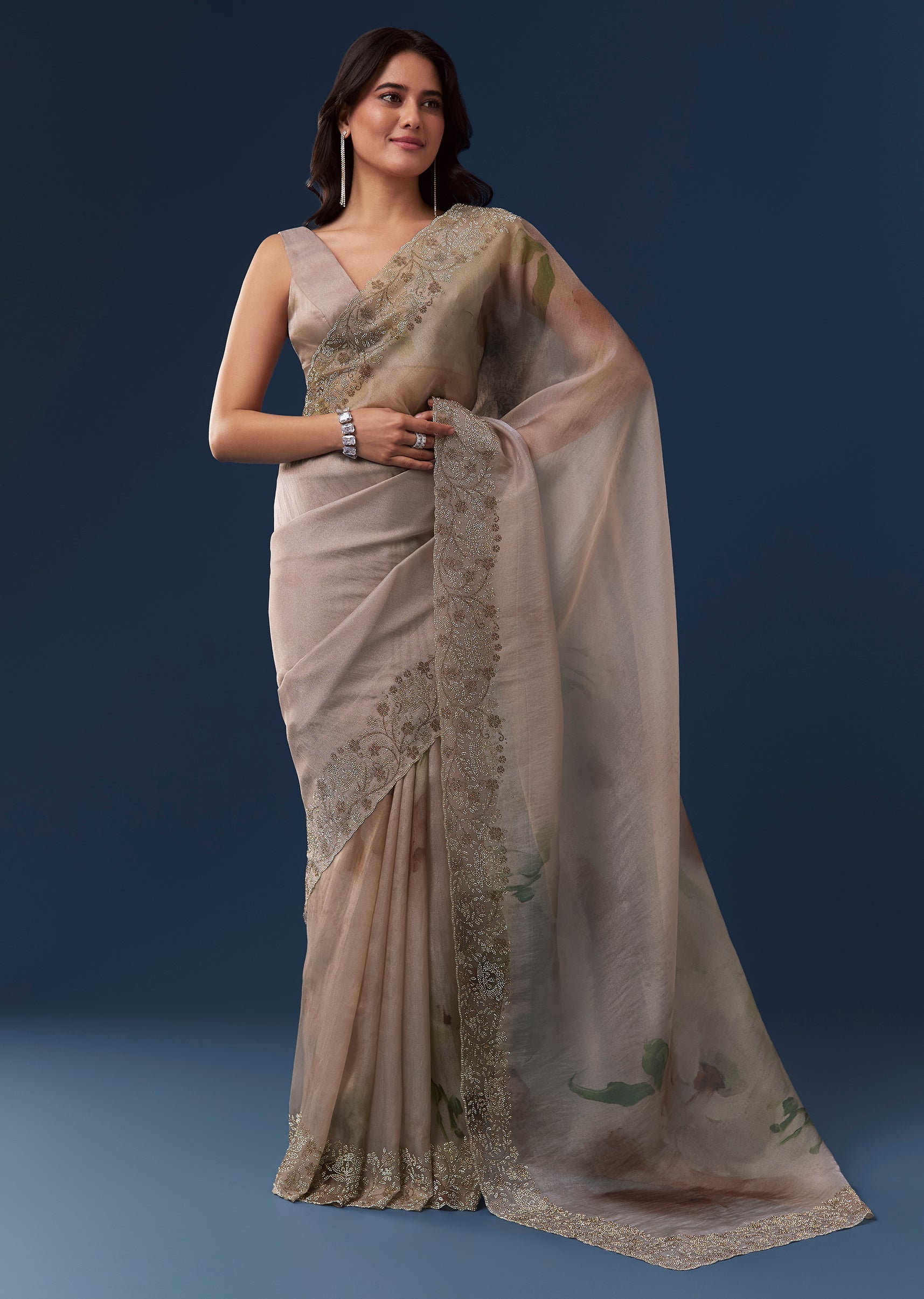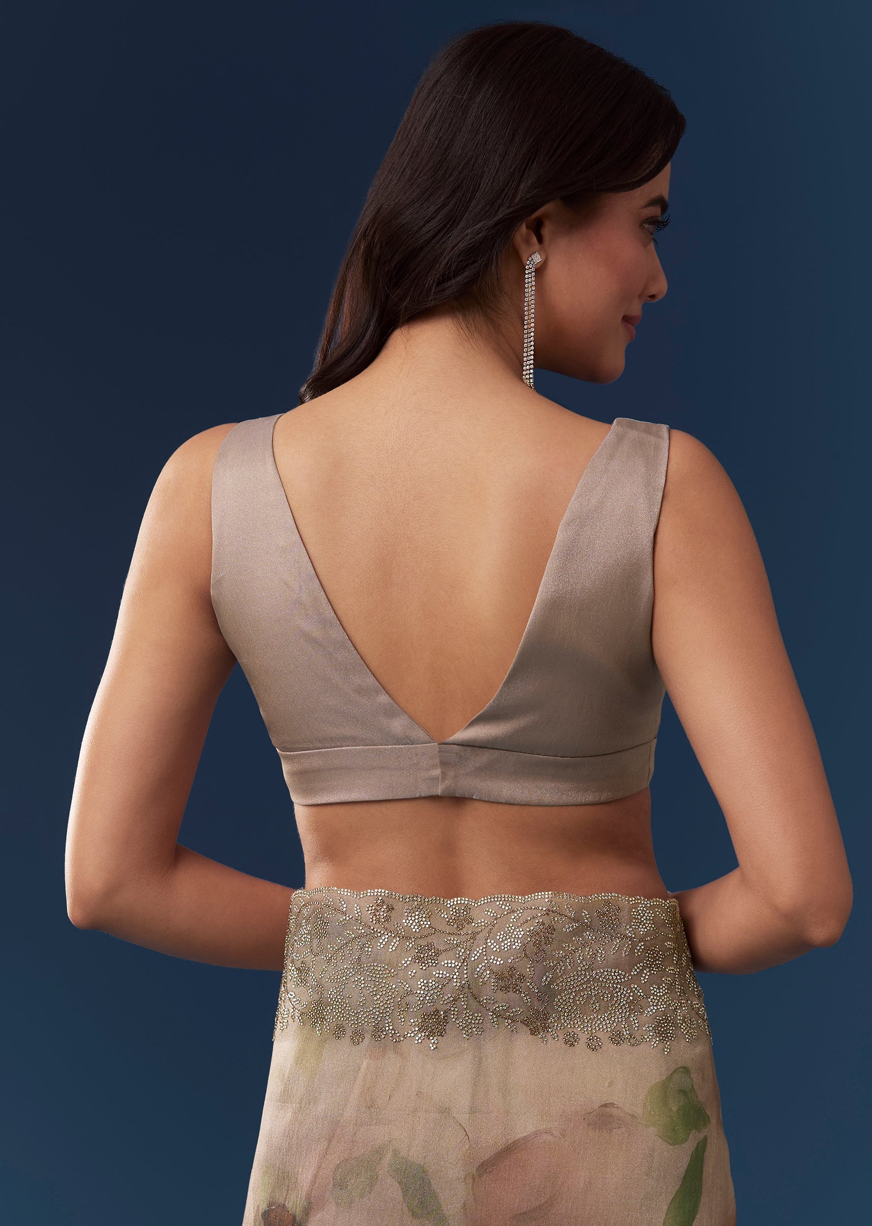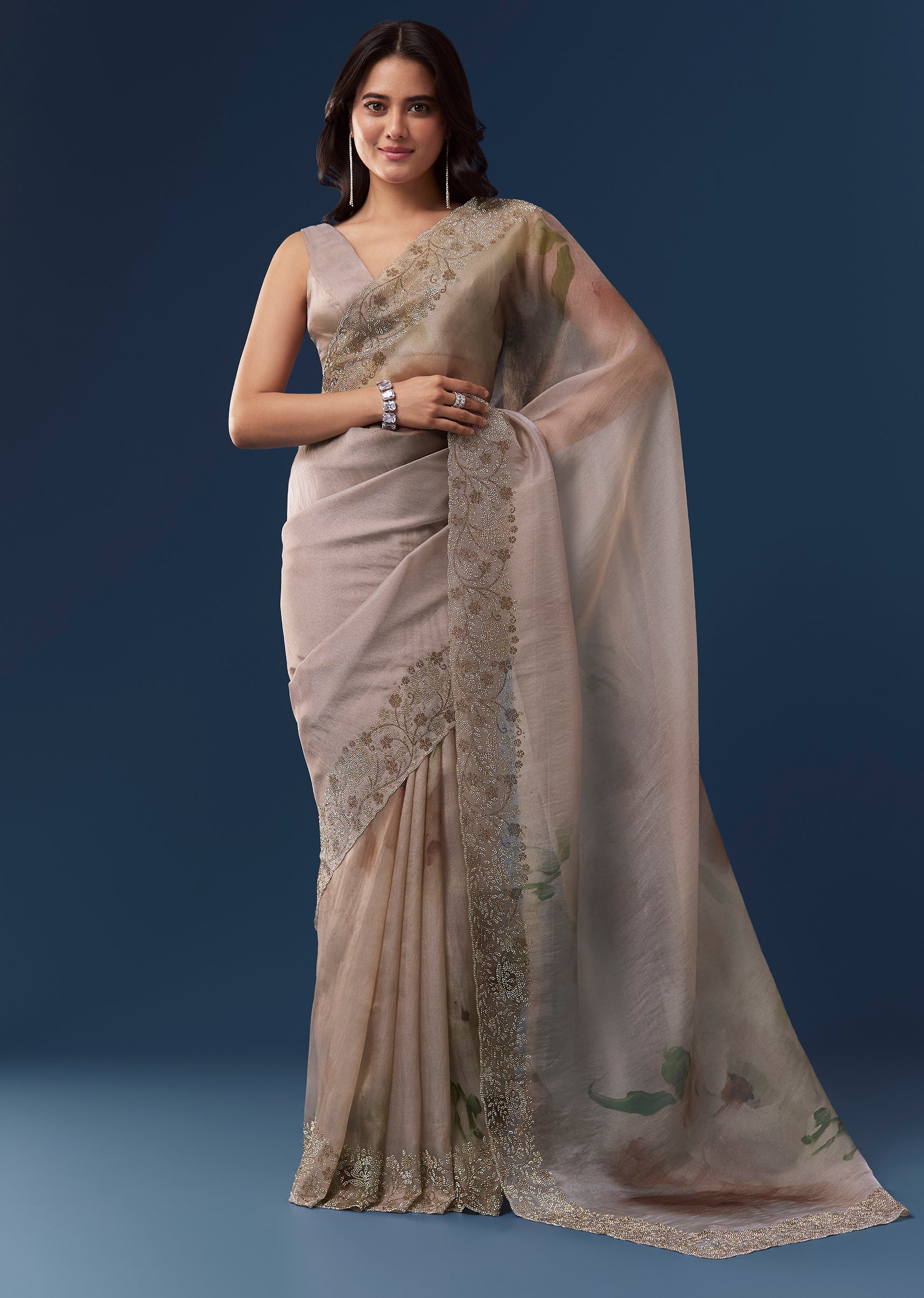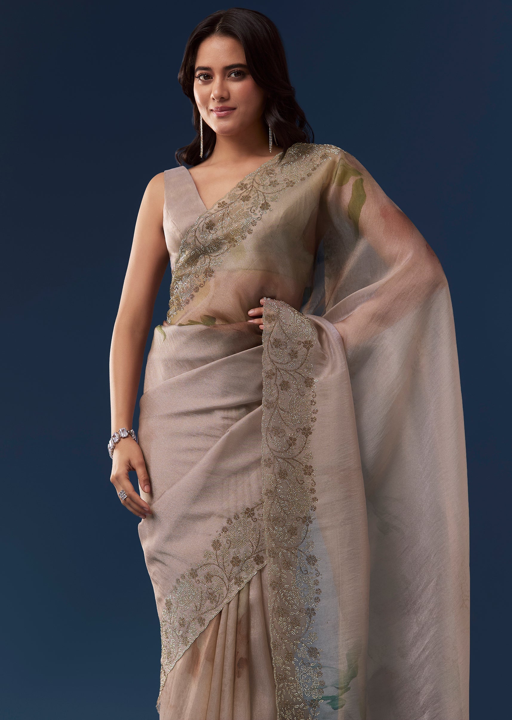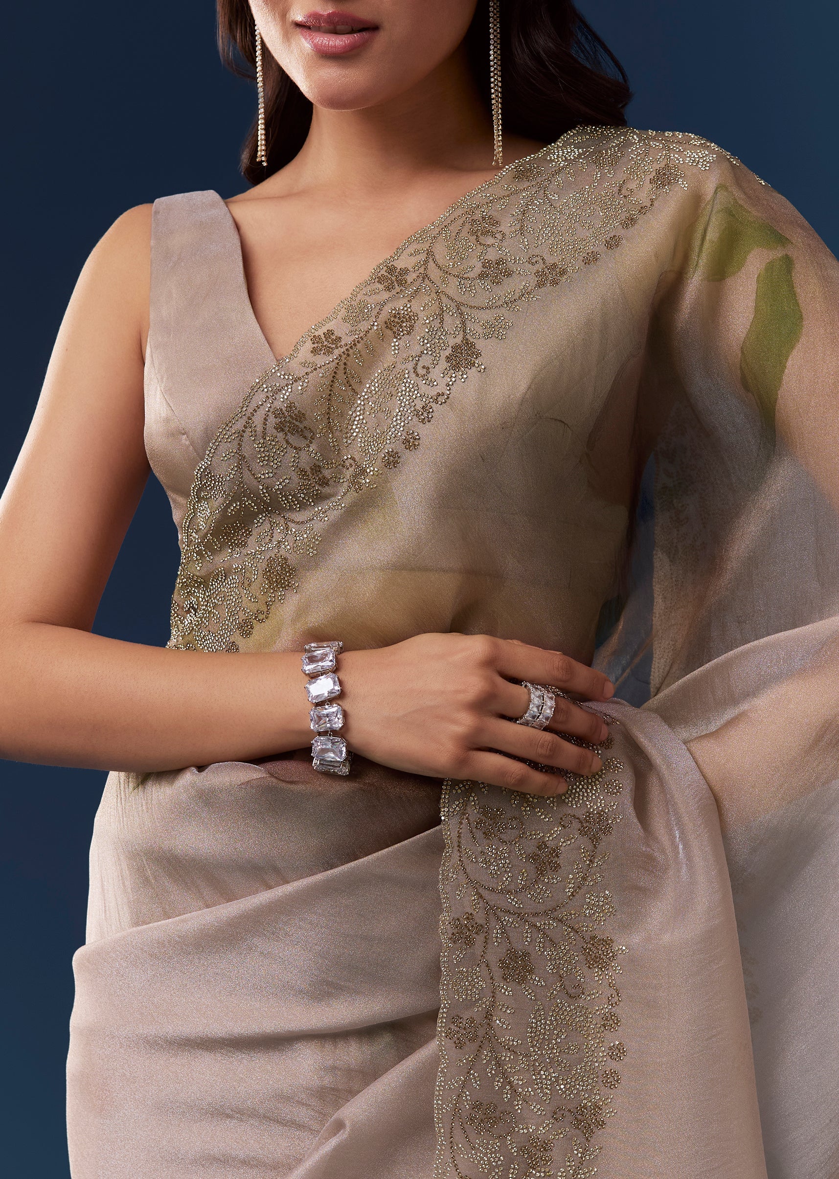 Fit Tips:Drape the saree so the stone embellished border falls evenly and the pallu drapes smoothly across the shoulder for an elegant finish.