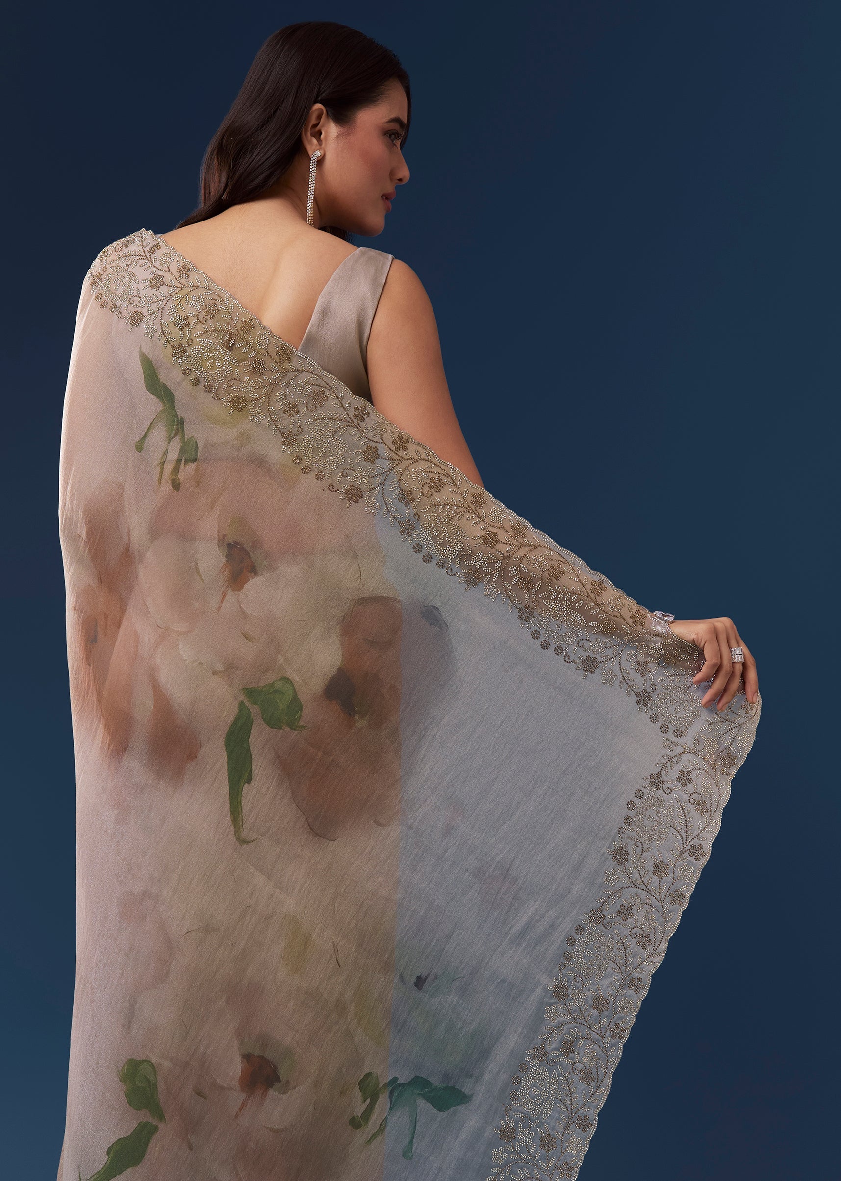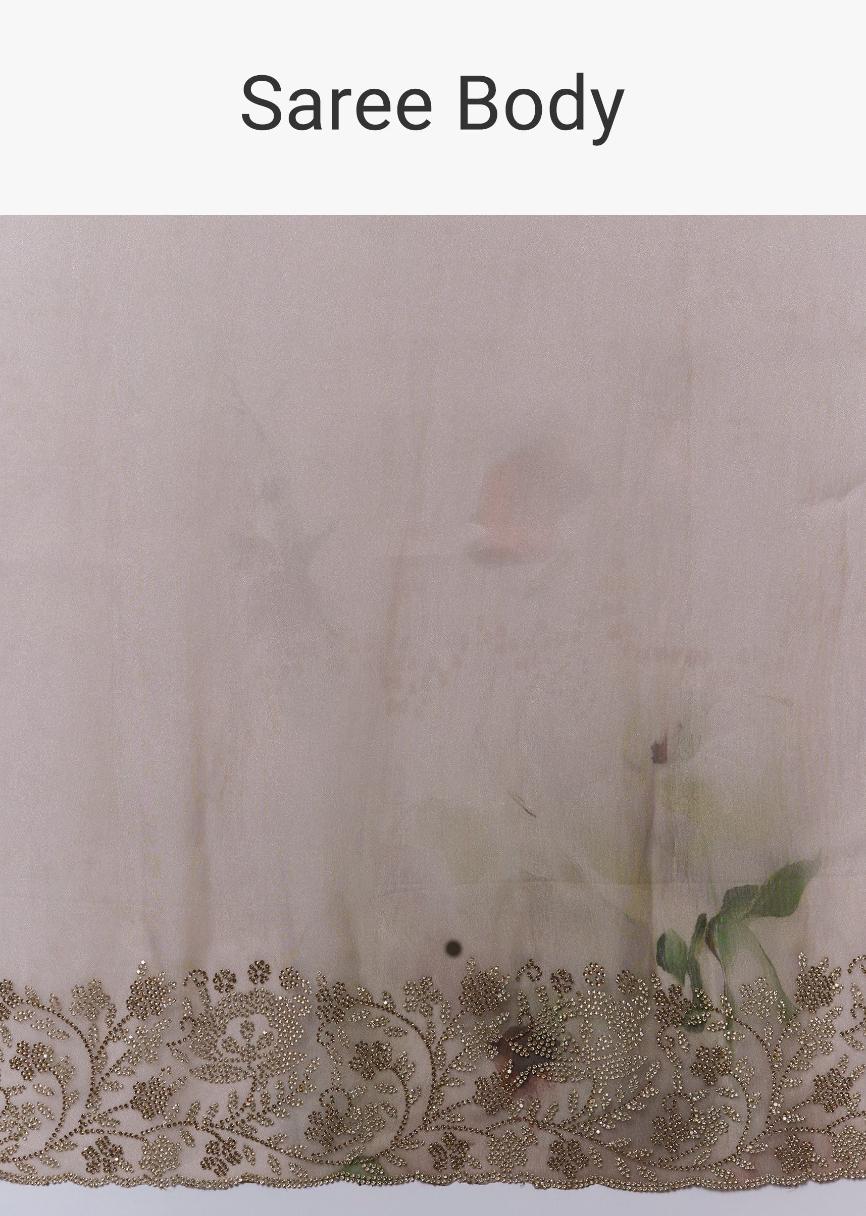 Grey Floral Printed Tissue Saree With Stone Embellished Border