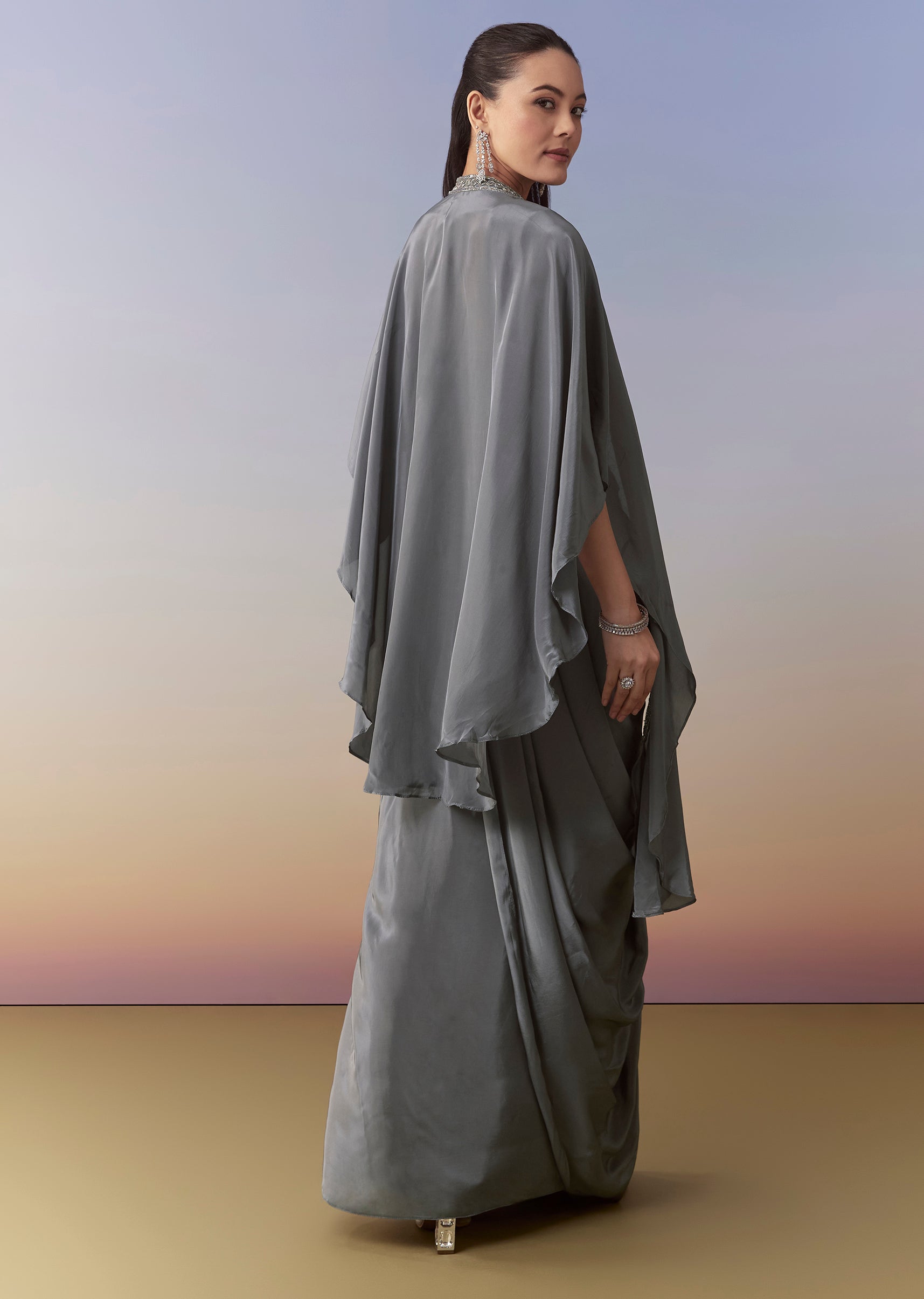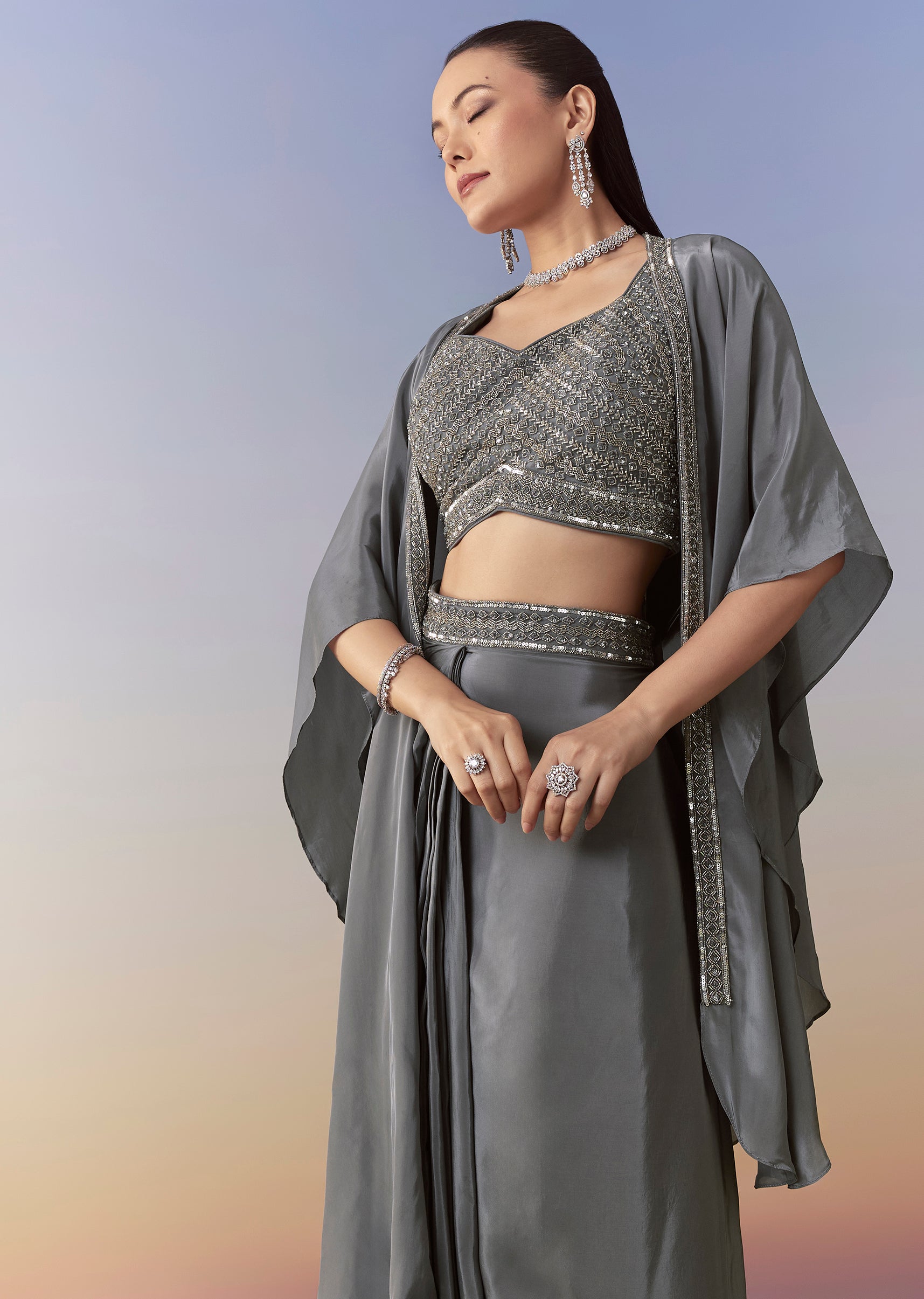 Step into contemporary elegance with this crepe cape-skirt set, featuring a stunning crop top embellished with cutdana, sequins, and bead work for a glamorous festive shimmer. The lightweight crepe cape... More Product Details