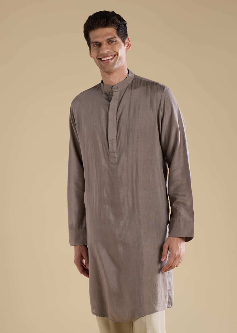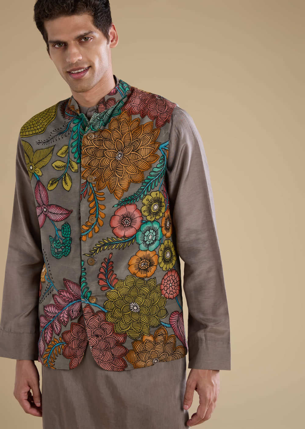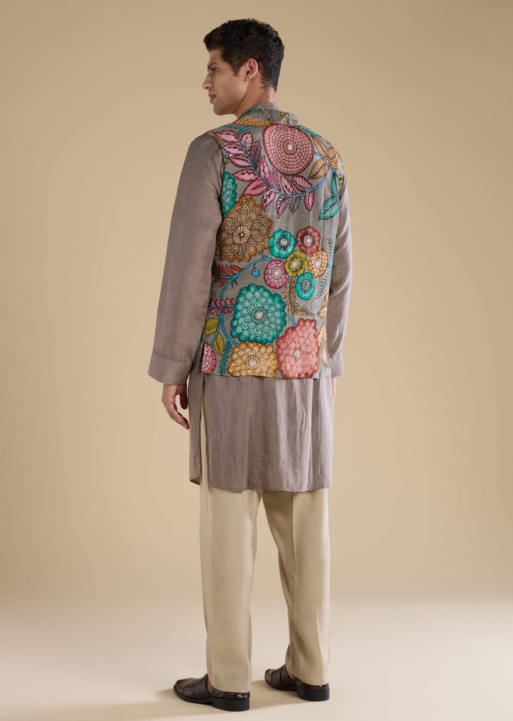 Grey Kalamkari Mens Jacket Kurta and Pant Set