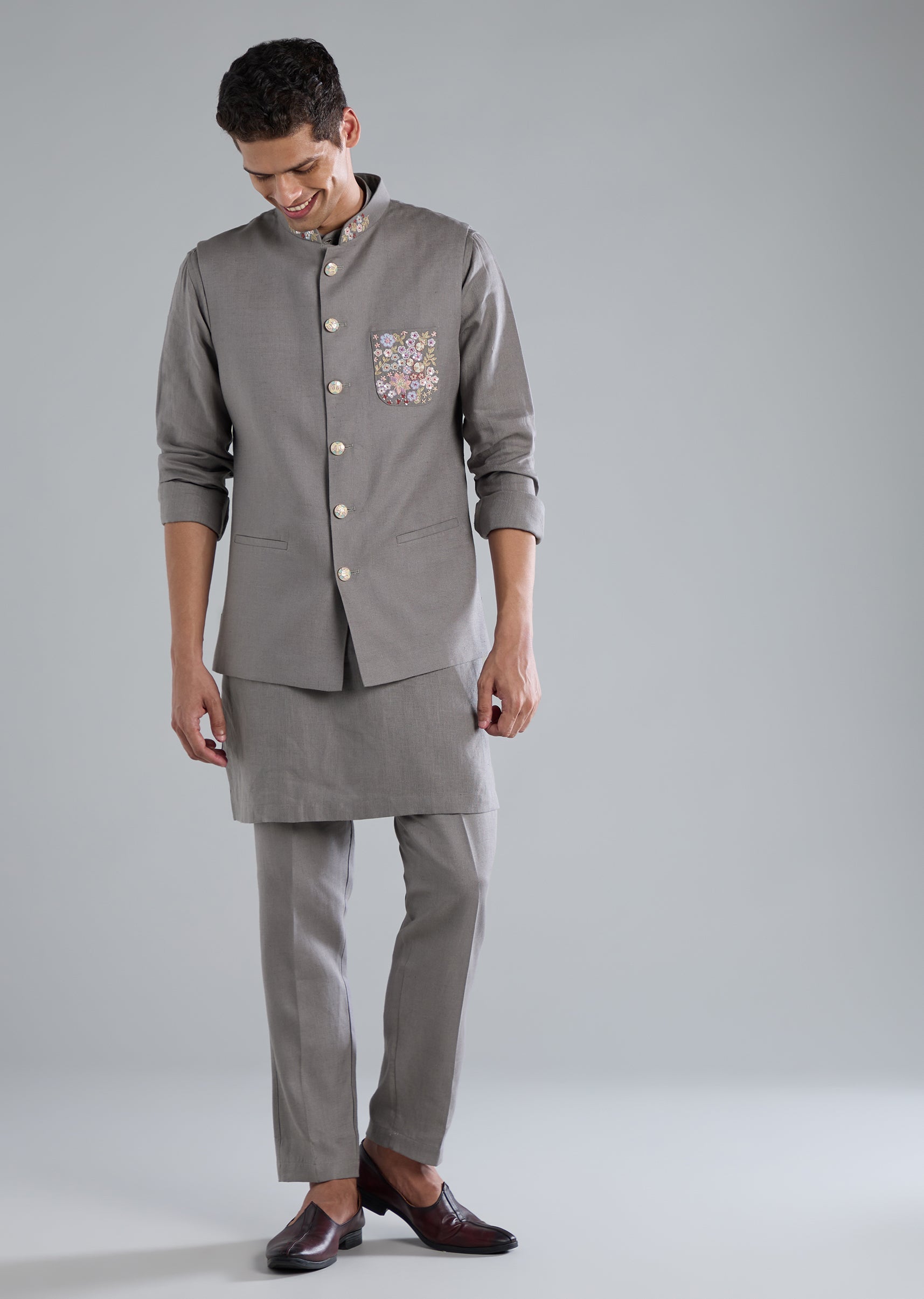 This grey kurta jacket set is crafted in soft pastel toned linen and highlighted with delicate thread resham work, making it an elegant choice for receptions and wedding celebrations. Designed with full sleeves and a mandarin collar, it features a front button top closure and a front hook eye bottom closure. The set includes a jacket, kurta, and pants, creating a refined and polished festive ensemble. Awarded as the Most Trusted Brand, we're delivering styles you love, just as promised.