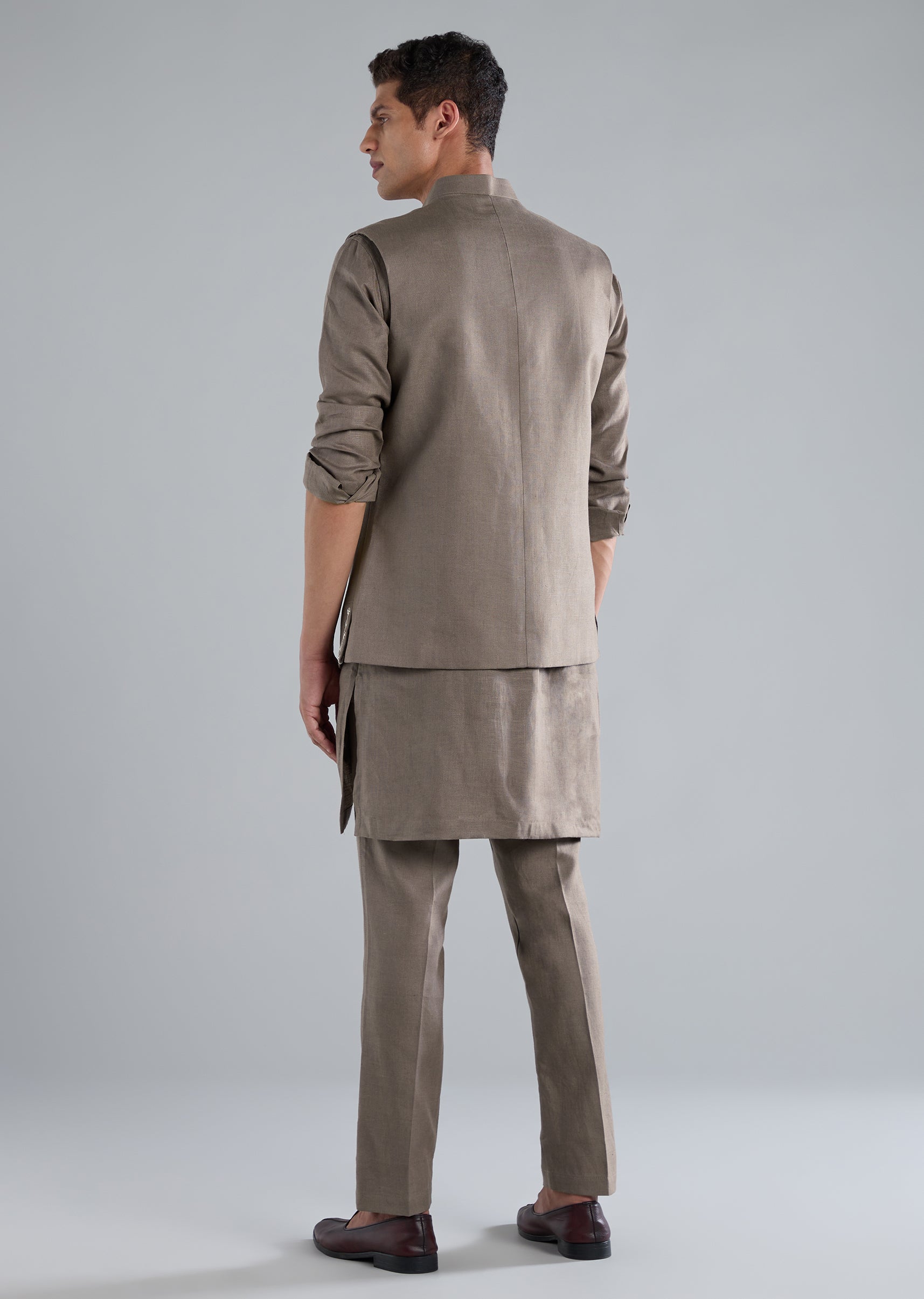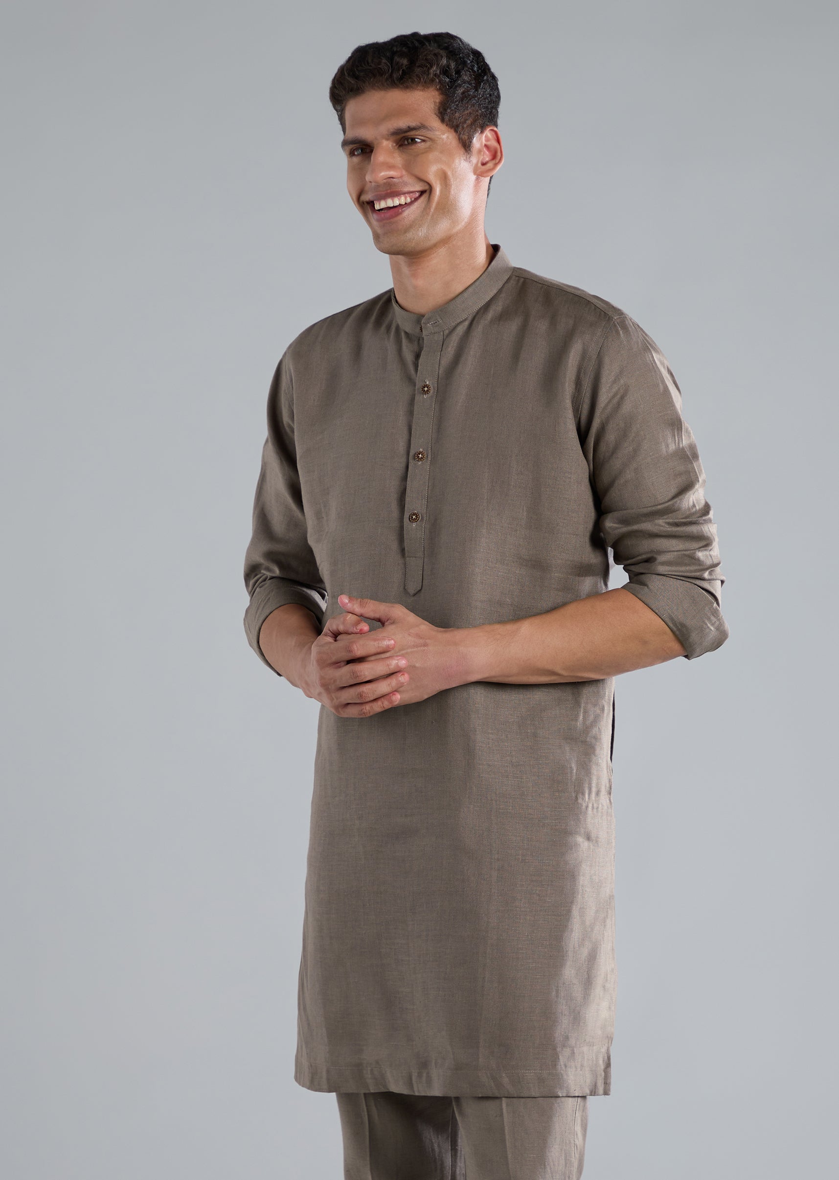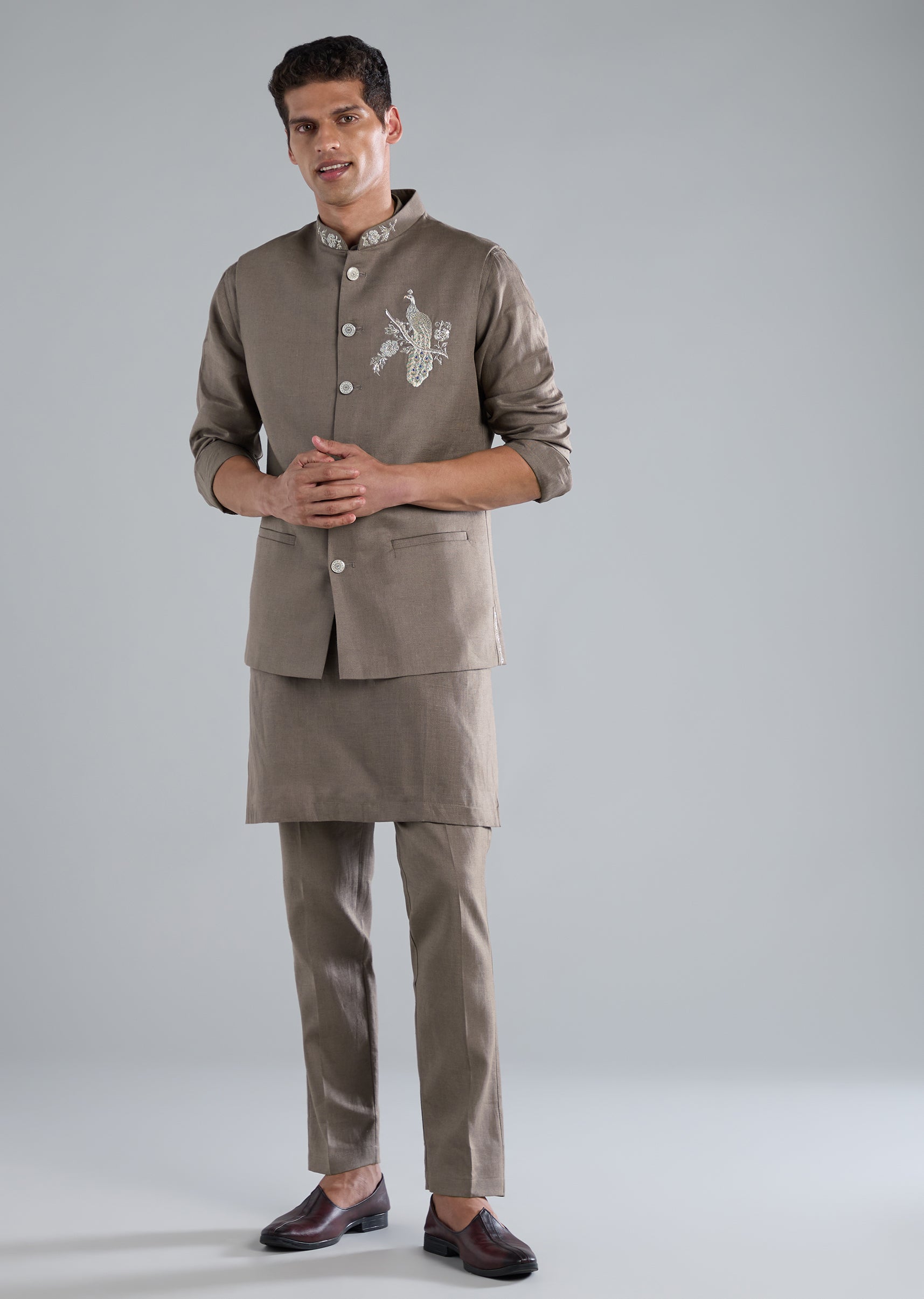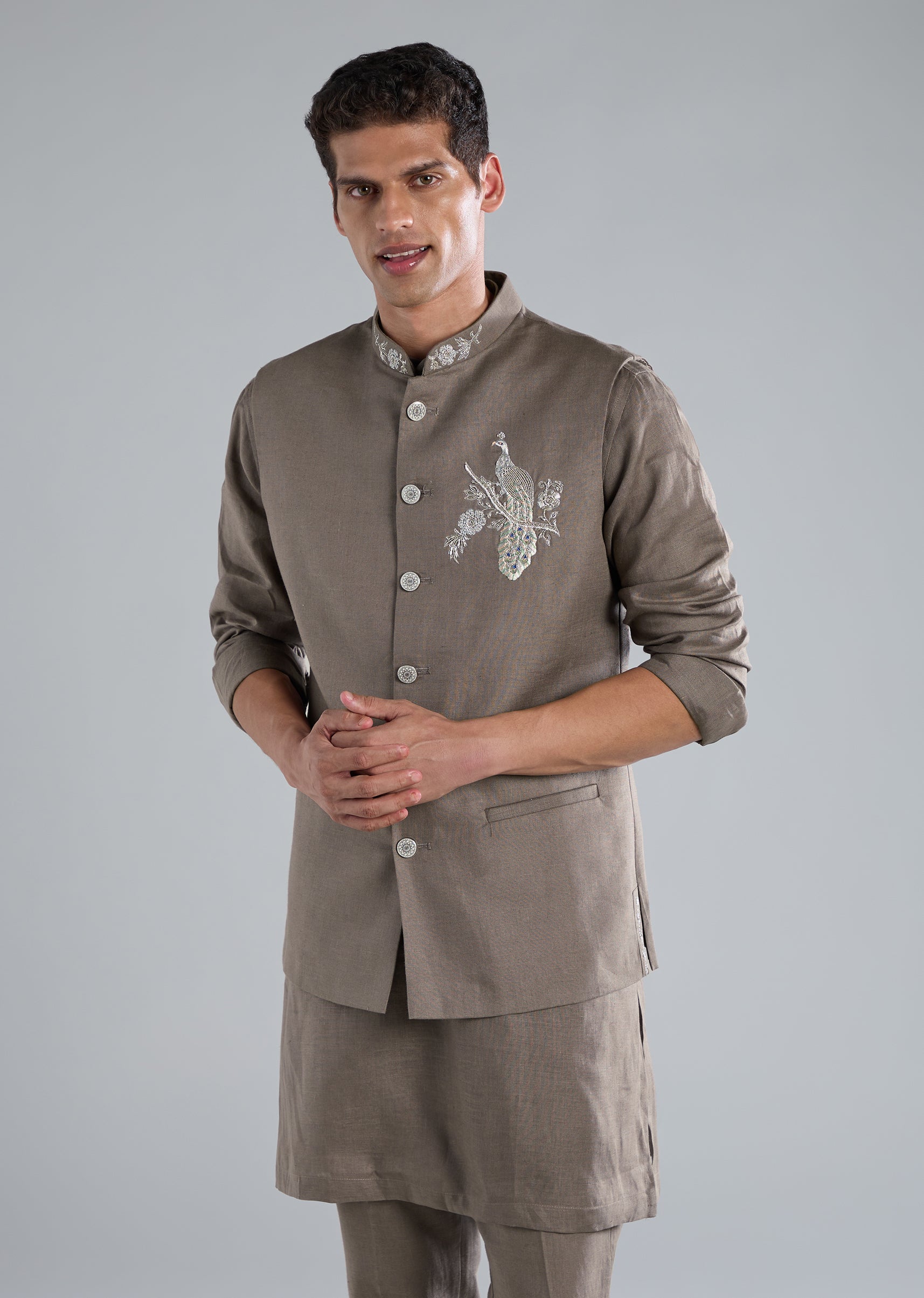 Soft and refined, this grey kurta jacket set is crafted in pure linen and highlighted with intricate zardosi hand work perfect for pastel festive themes. The full sleeve silhouette and mandarin collar add a sharp, structured finish, while the jacket is designed with a front button closure and the bottoms with a front hook eye fastening. A polished choice for daytime celebrations, wedding functions, or elegant festive gatherings. Awarded as the Most Trusted Brand, we're delivering styles you love, just as promised.