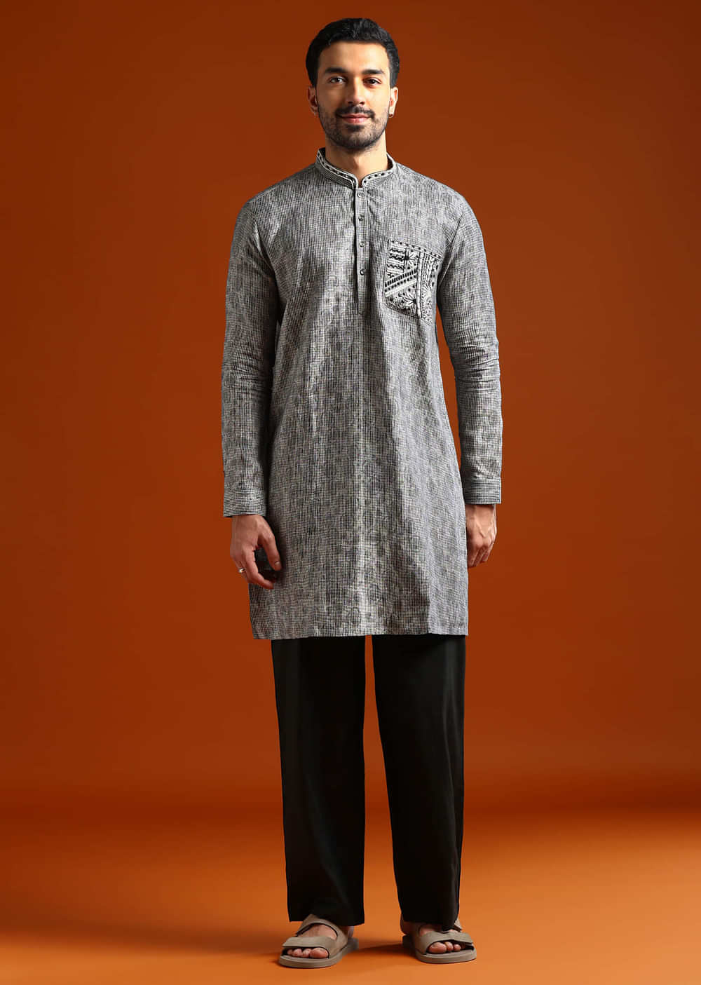 When the invite says festive, this grey linen jacquard men’s kurta set brings woven depth and a touch of resham for quiet shine. The pattern reads refined up close and... More Product Details