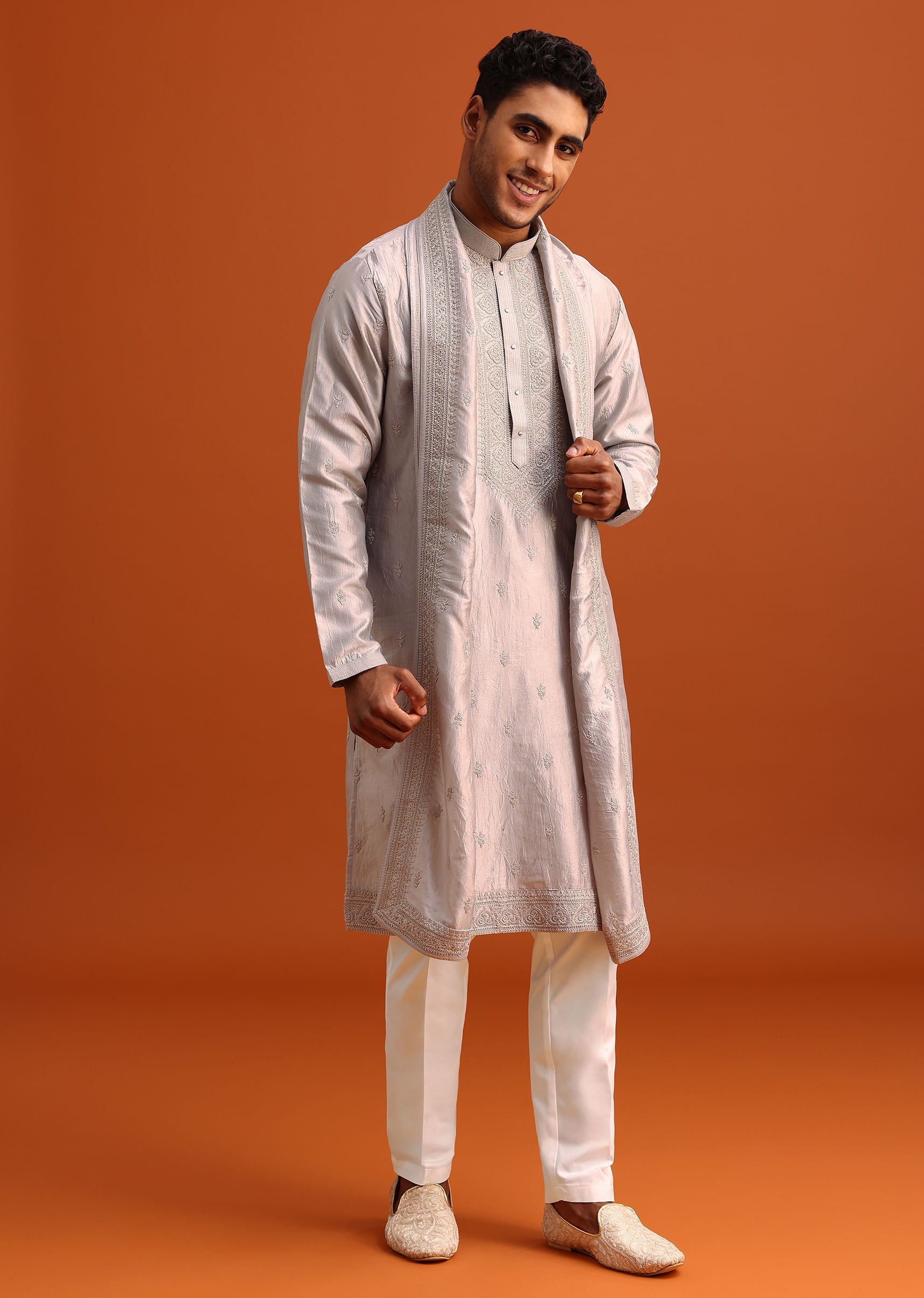Grey Kurta Set In Raw Silk With Thread Work Dupatta