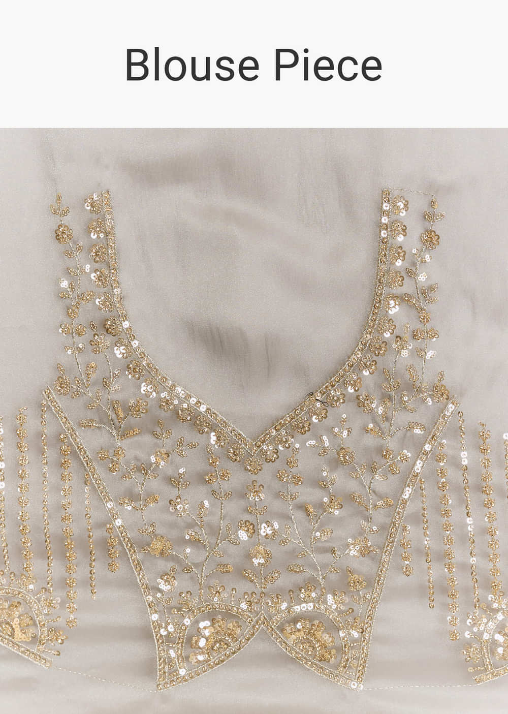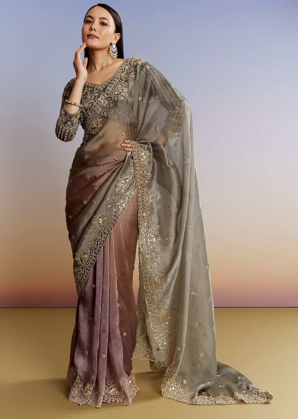 Grey Lavender Shaded Tissue Saree With Heavy Blouse Embroidery