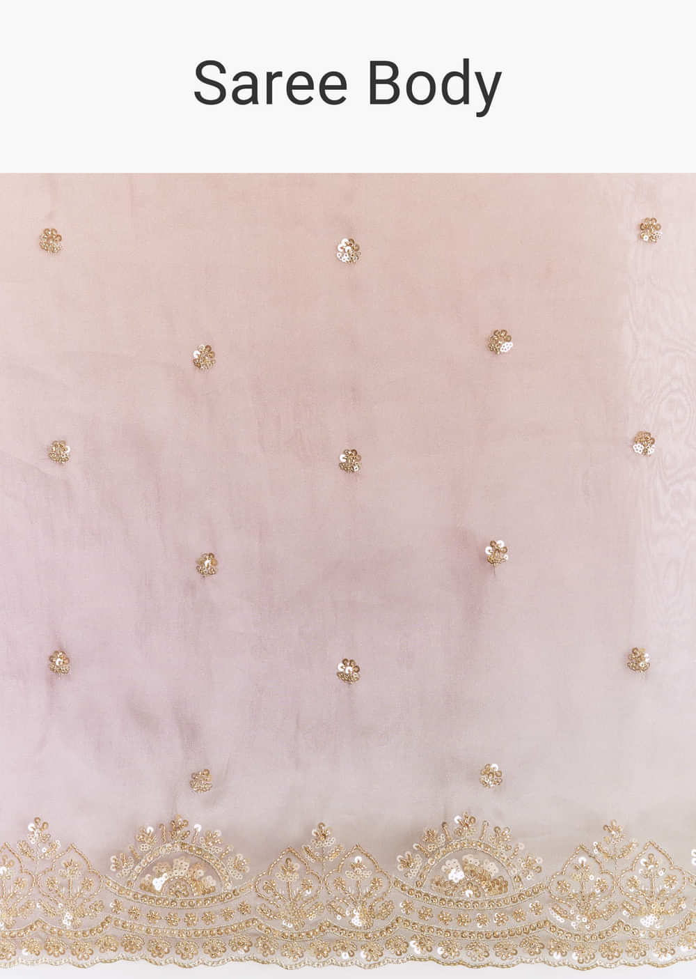 Shades of lavender dusk swirl through this tissue saree. Heavily embroidered scallops and a dreamy blouse catch the light in sequins, beads, and cutdana – like a pastel dream draped... More Product Details