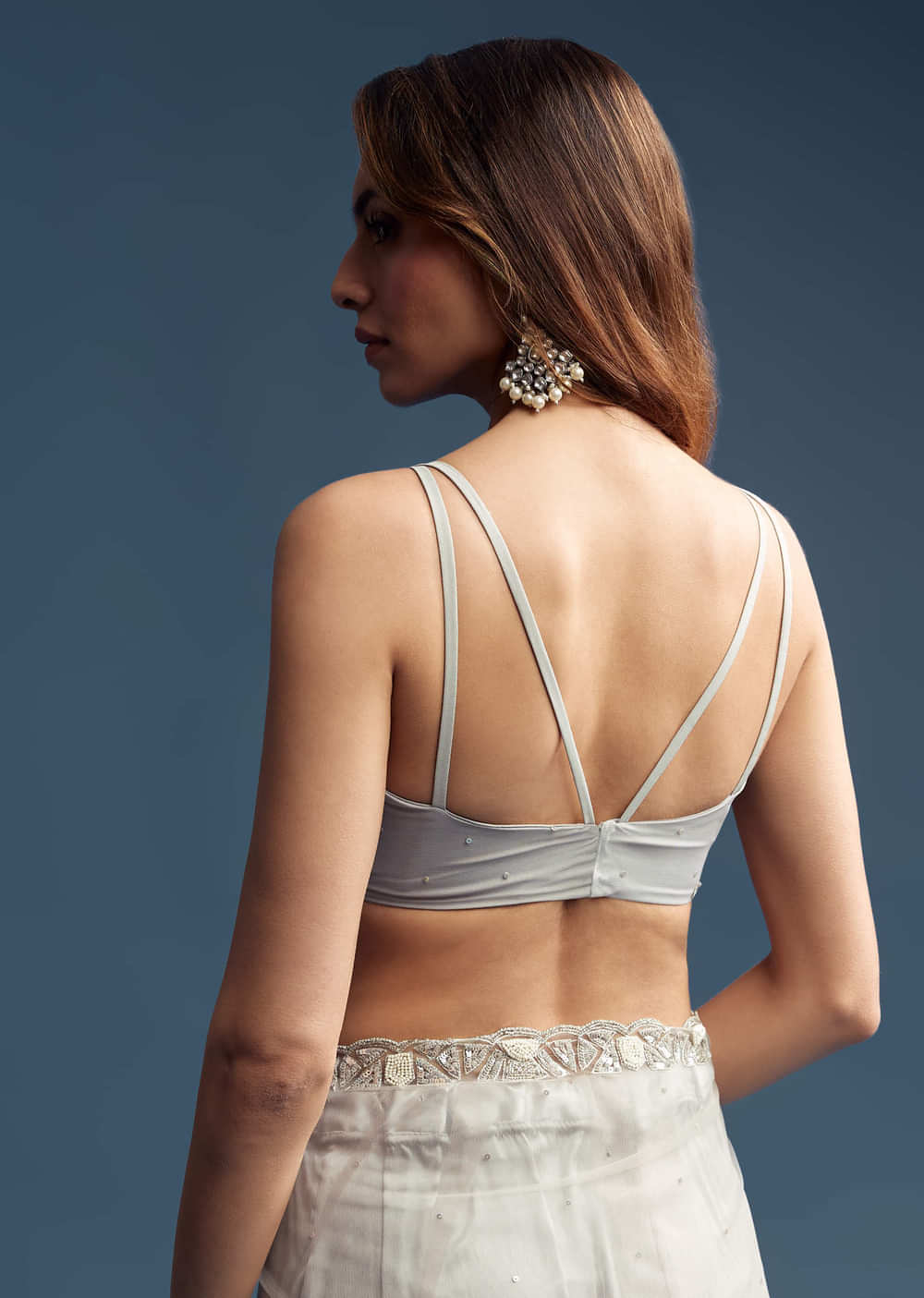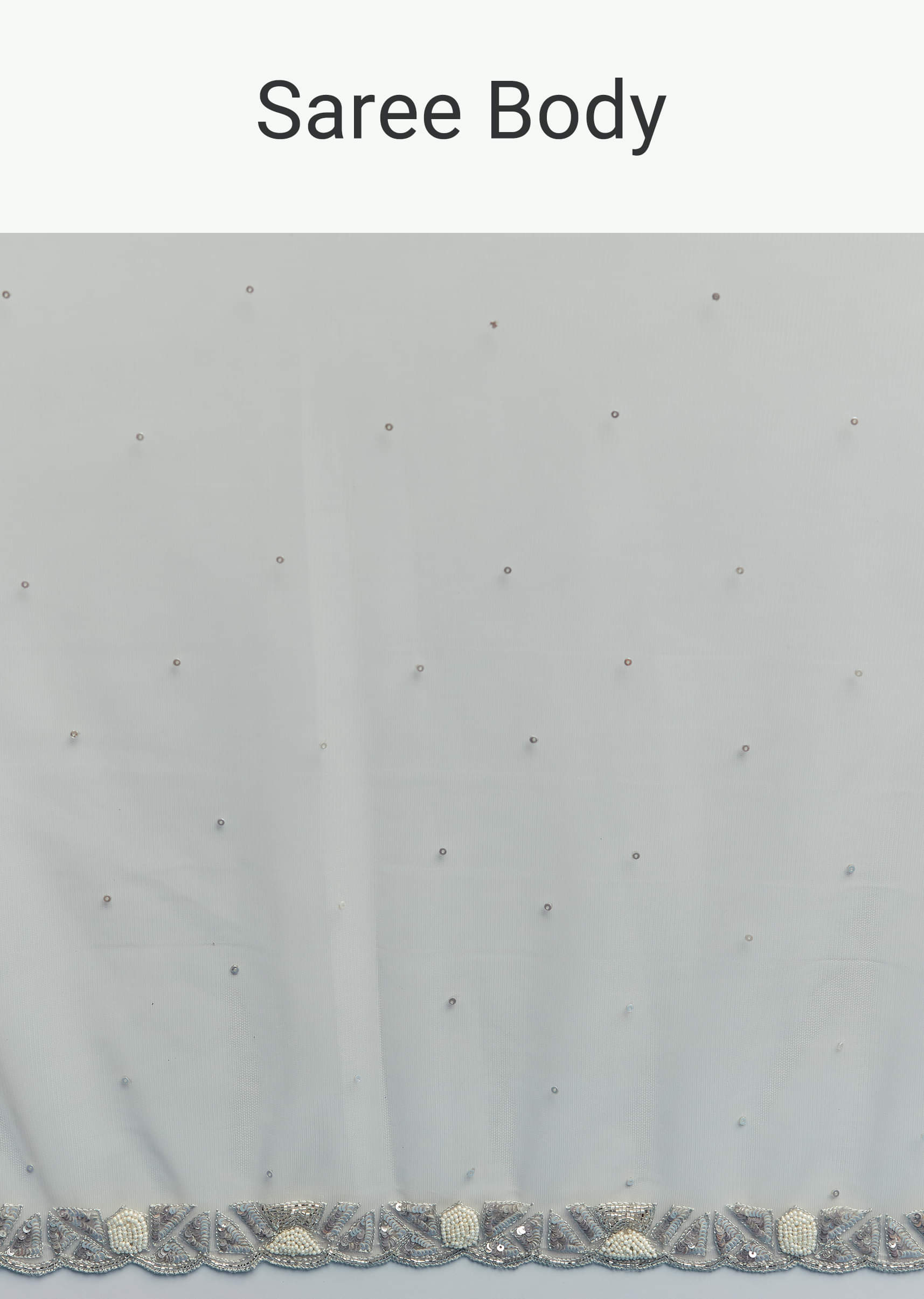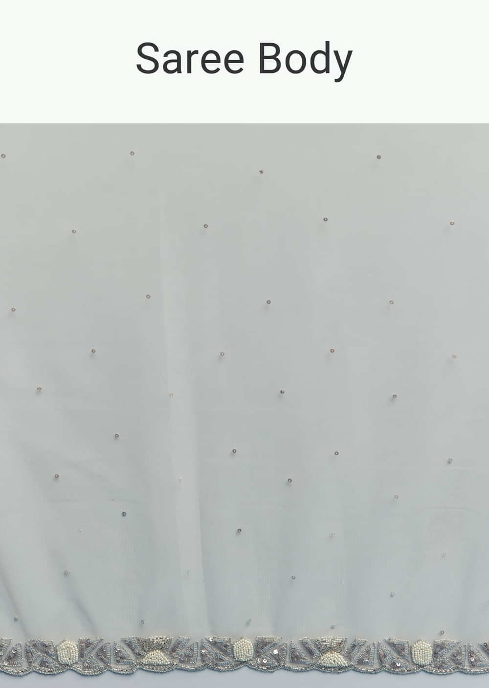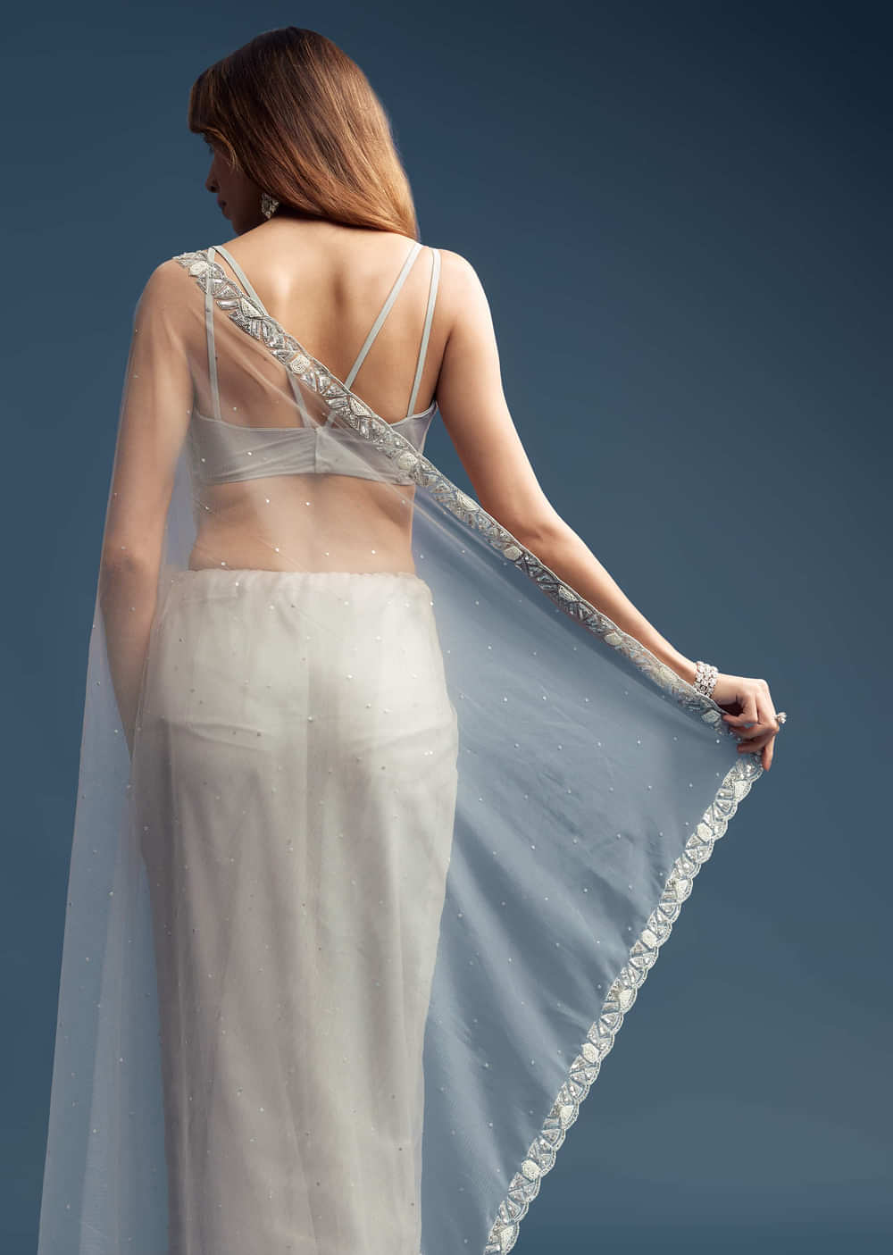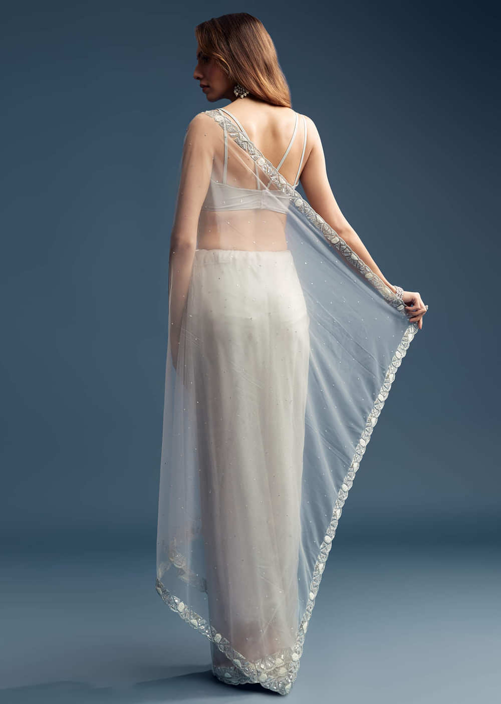 A silver-grey net saree drenched in sequins creates an almost liquid sparkle with every move. The scalloped edges, hand-detailed with beads and sequins, bring a delicate contour to this gleaming... More Product Details