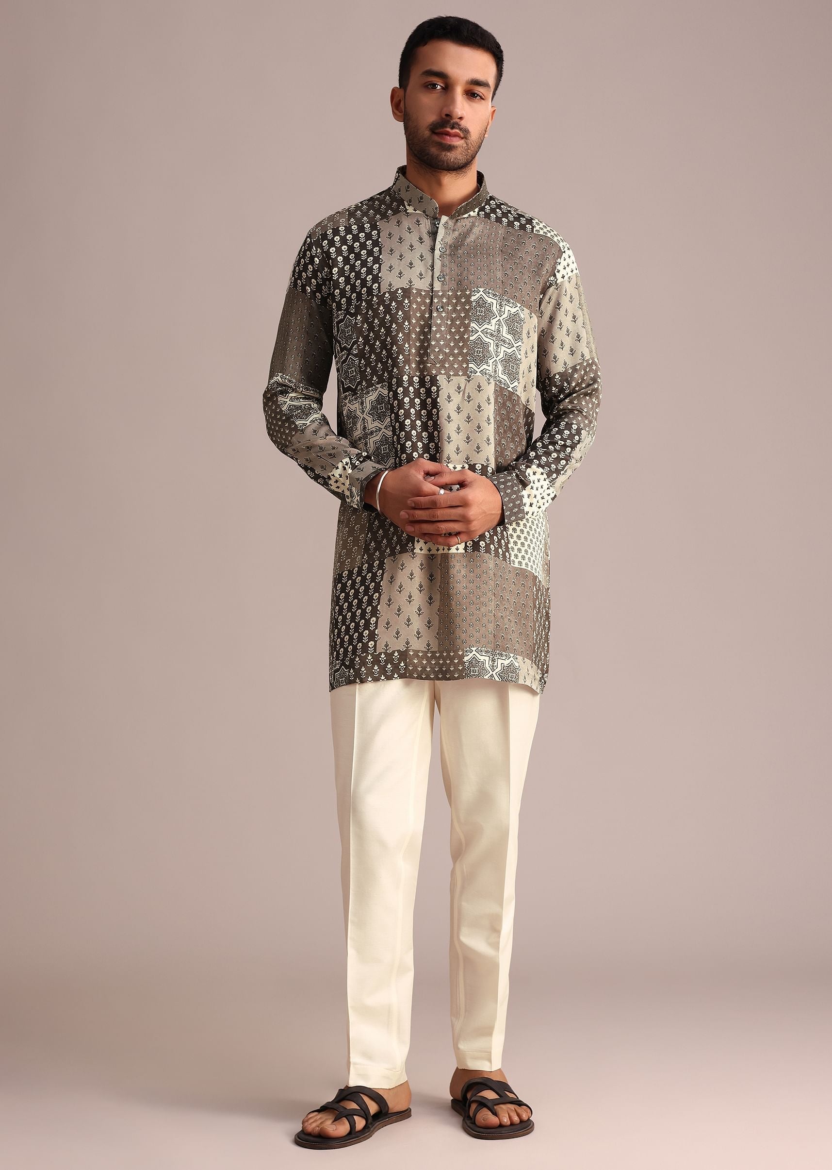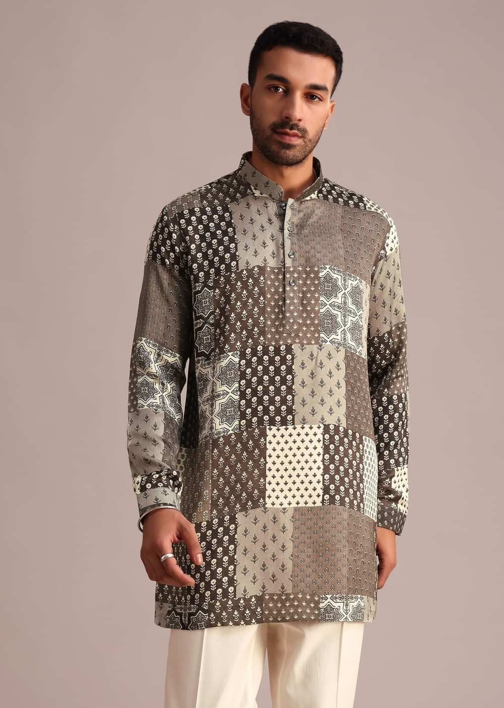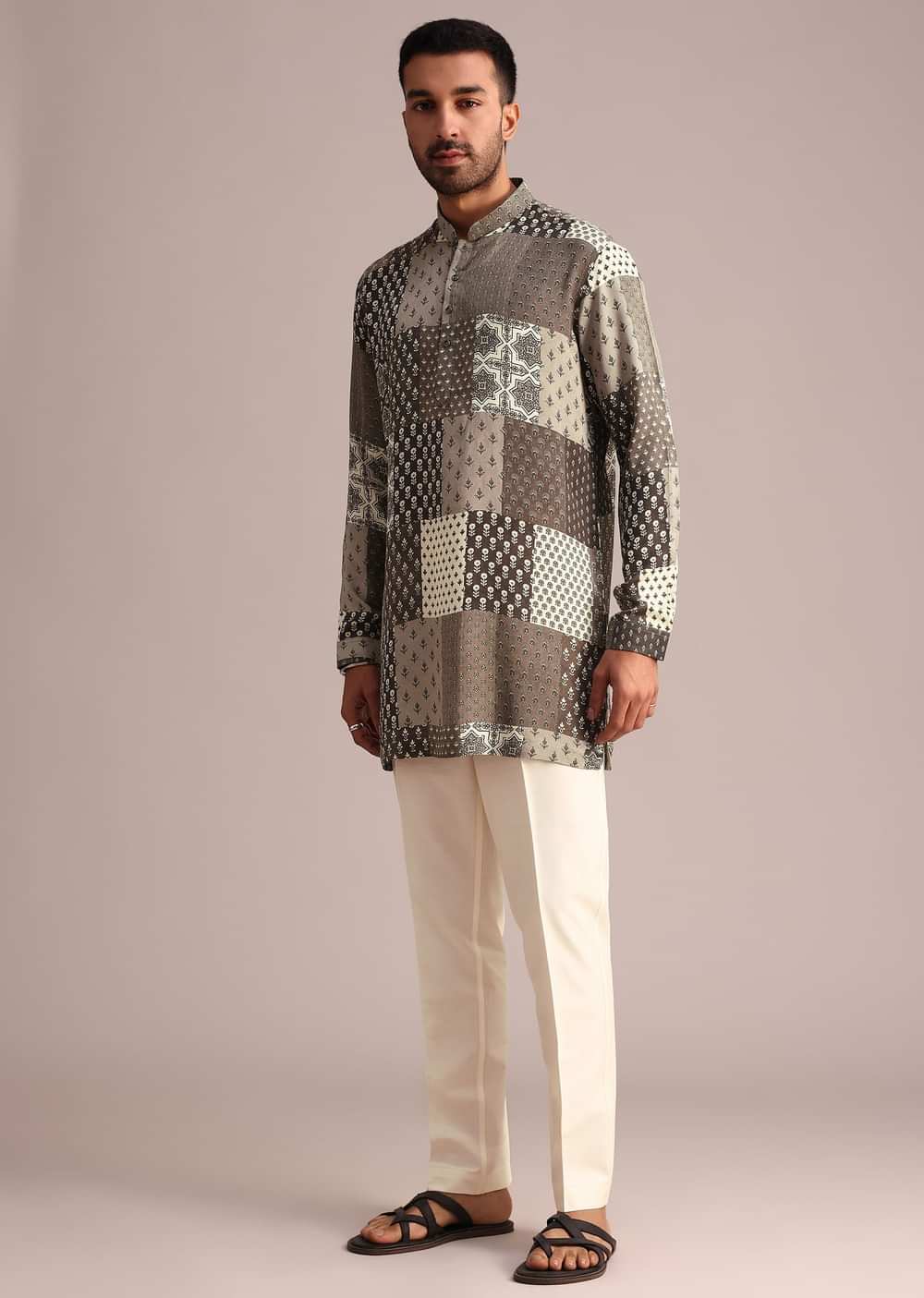 - A stunning showcase of bold prints and rich textures is this beautiful grey kurta.