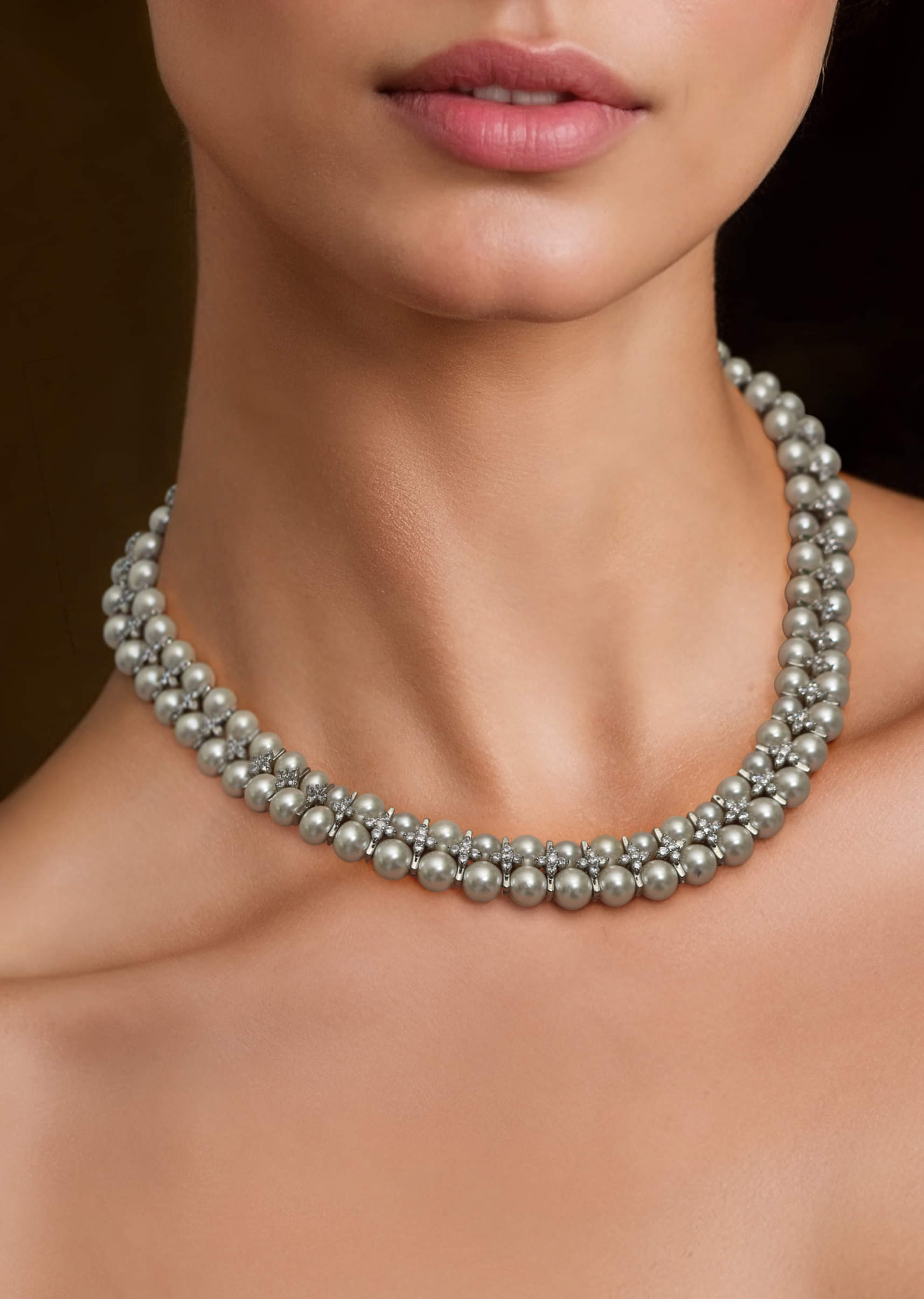 A grey pearl layered necklace featuring multiple strands of lustrous pearls and elegant detailing, exuding contemporary sophistication. Perfect for adding a refined touch to bridal, festive, or ethnic ensembles. Awarded as the Most Trusted Brand, we're delivering styles you love, just as promised.