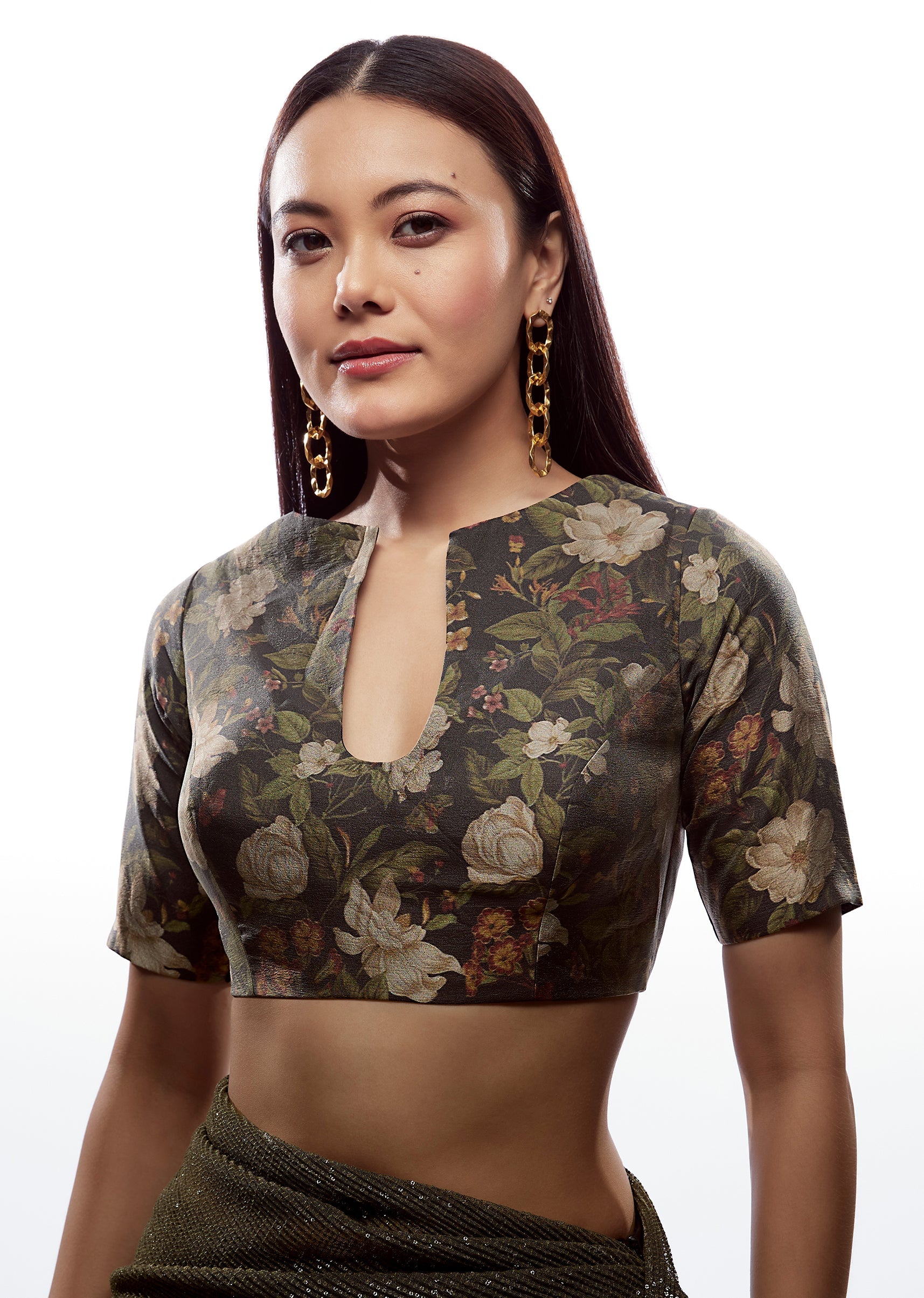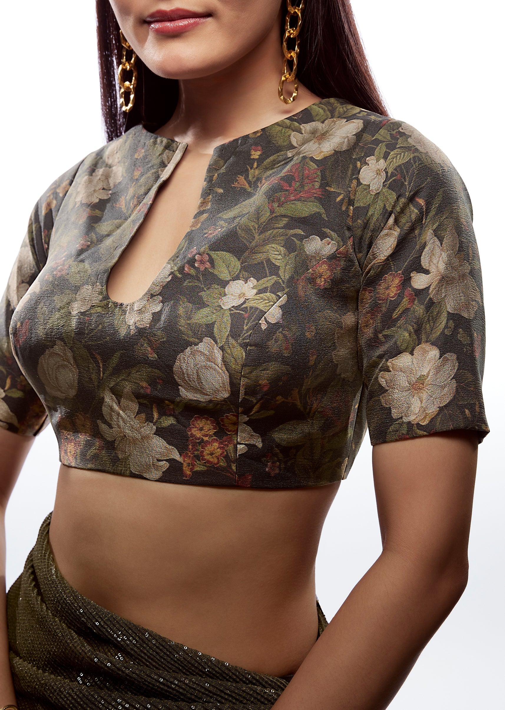 Pair with a plain black or pastel saree and add a messy bun to showcase the back detail.