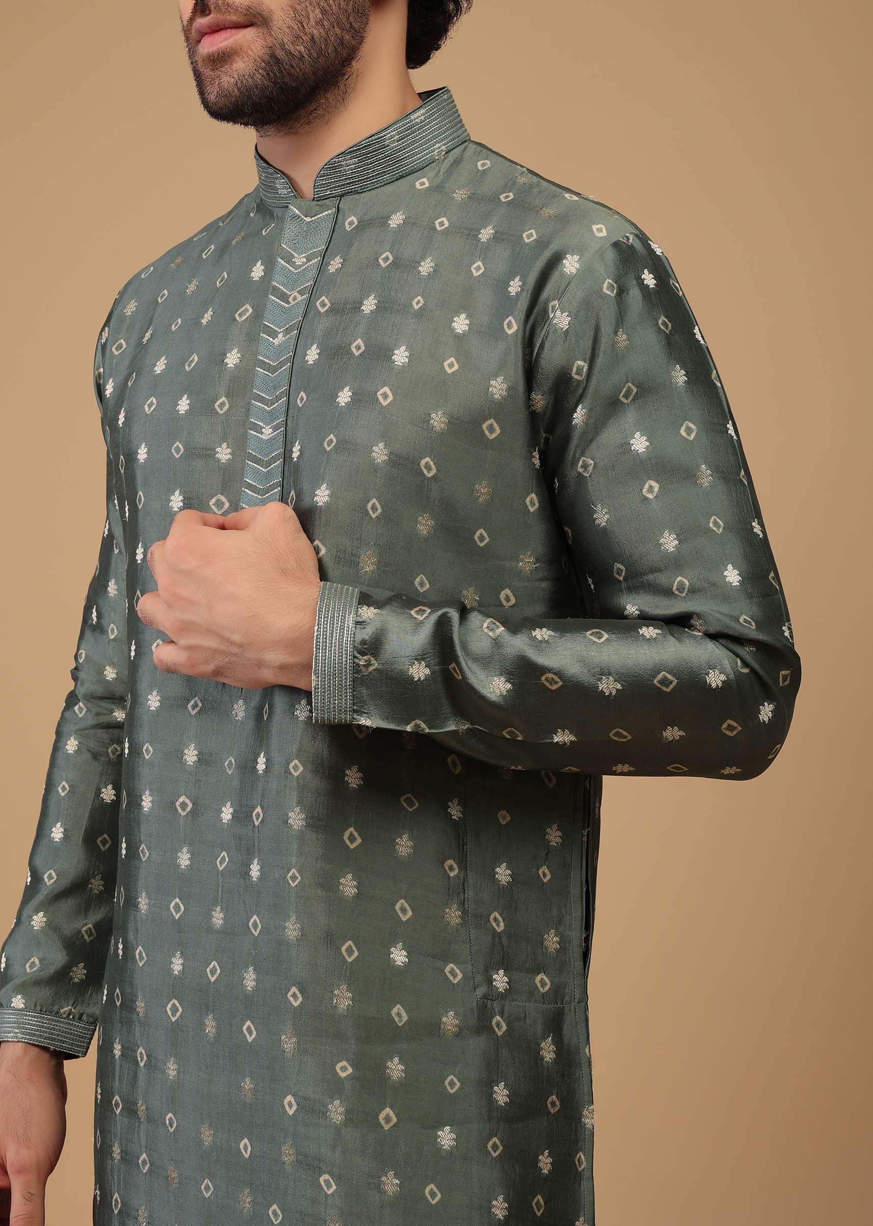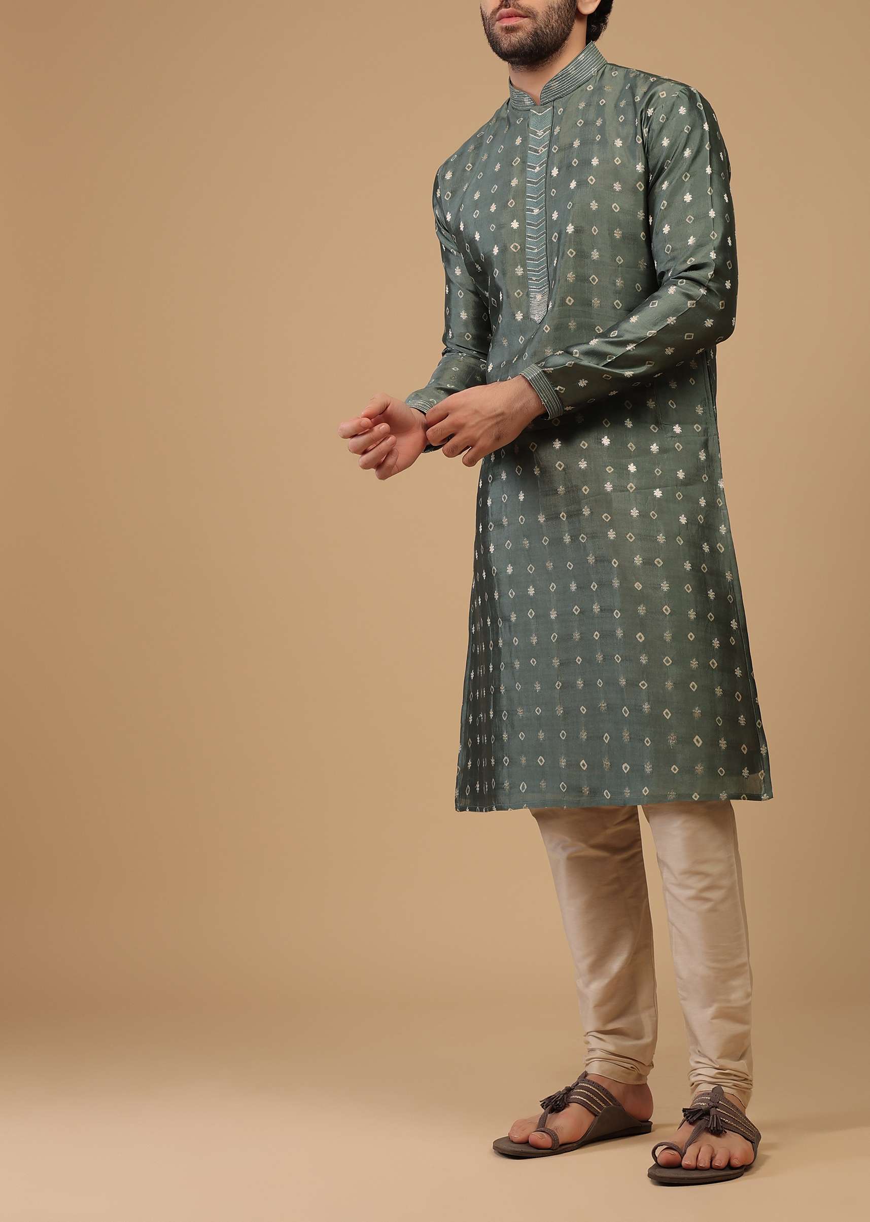 Grey kurta fabricated in handwoven silk. Designed in an exquisite printed butti design. It comes in full sleeves and a mandarin collar neckline. It has a front hook closure. Paired with matching churidar. Awarded As The Most Trusted Brand We'Re Delivering Styles You Love Just As Promised.