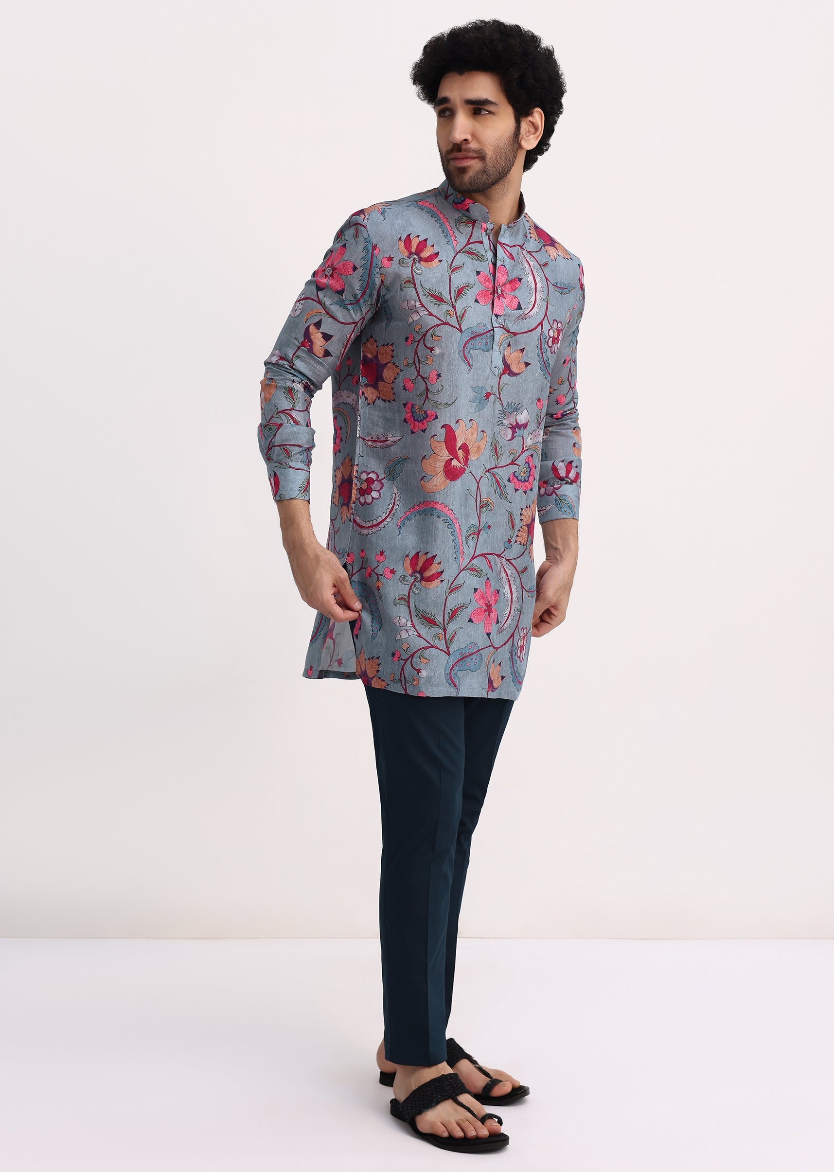 Evoke a sense of contemporary sophistication with this graphite grey art silk kurta pant set. The luxurious fabric drapes elegantly, while the kurta boasts a captivating printed motif. This ensemble... More Product Details