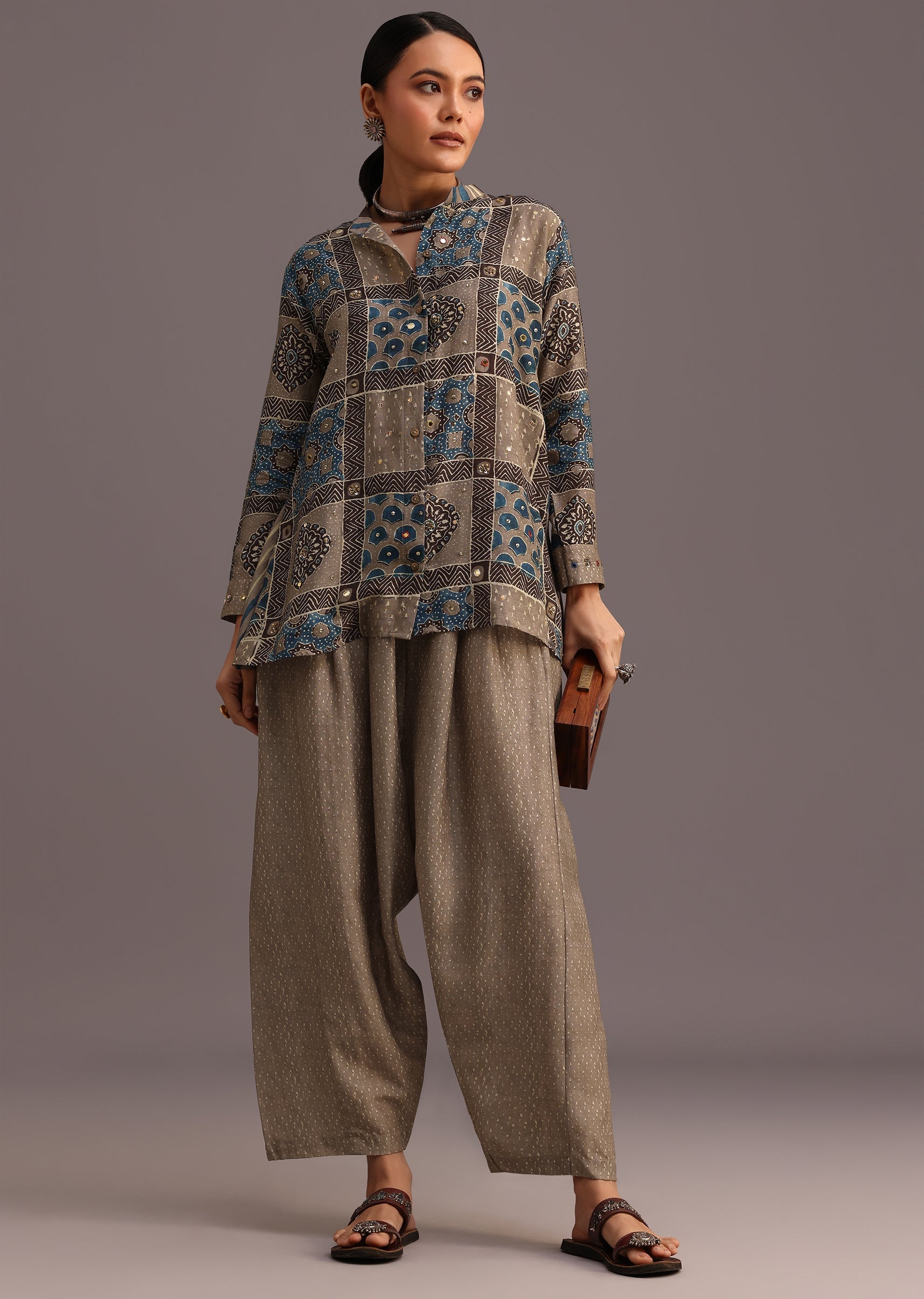 Surrender to the captivating charm of this grey printed shirt and salwar set. The kurta is adorned with detailed mirror and sequin work infusing it with a glamorous flair while the whimsical print offers an alluring contrast. Its contemporary shirt style cut provides a fashionable edge. The matching printed salwar rounds off the outfit ensuring a polished and elegant appearance ideal for any festive event. Awarded as the Most Trusted Brand, we're delivering styles you love, just as promised.