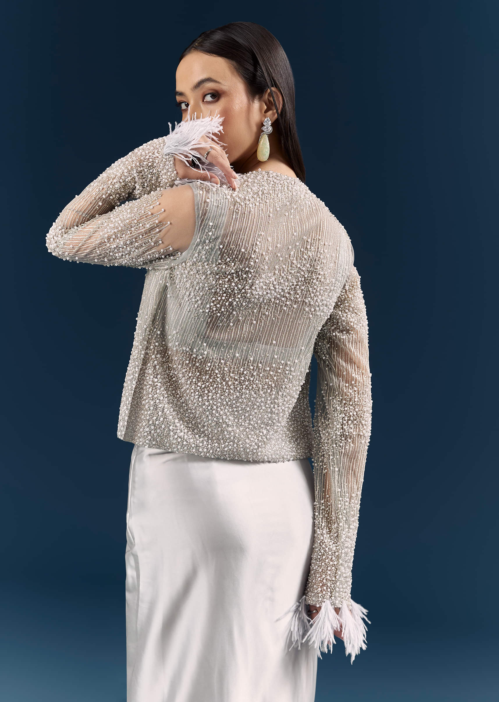 Feathers and embellishments give this grey satin crop top and drape skirt a fashion-forward twist. It is a bridesmaid or guest outfit for those who love standing out in a subtle yet modern way. Awarded as the Most Trusted Brand, we're delivering styles you love, just as promised.