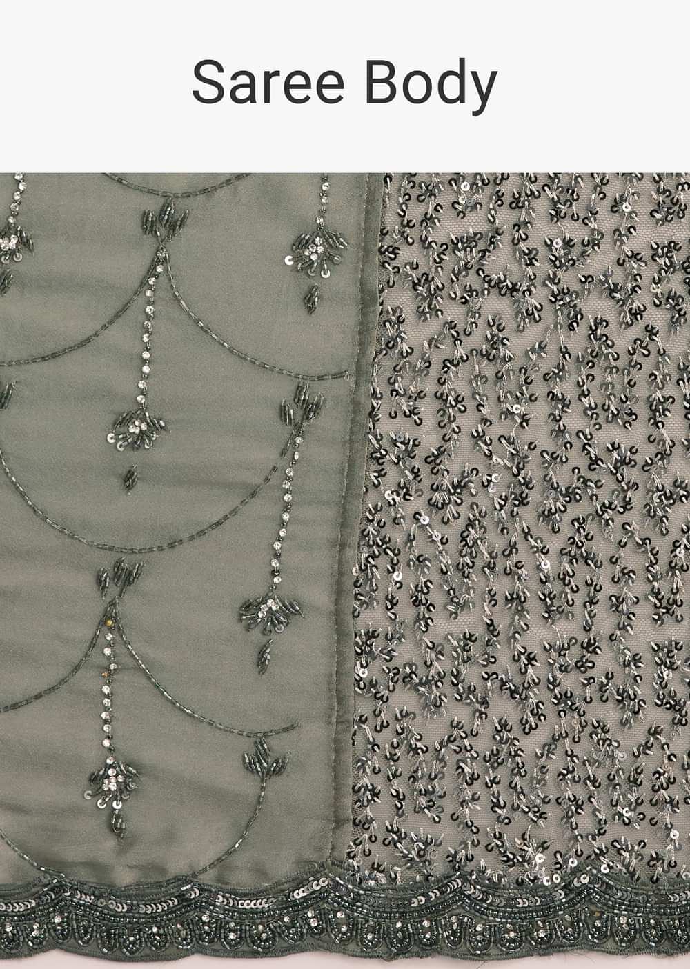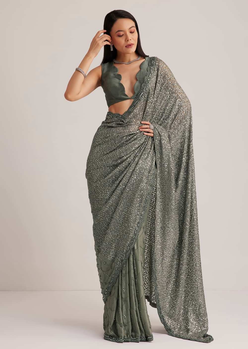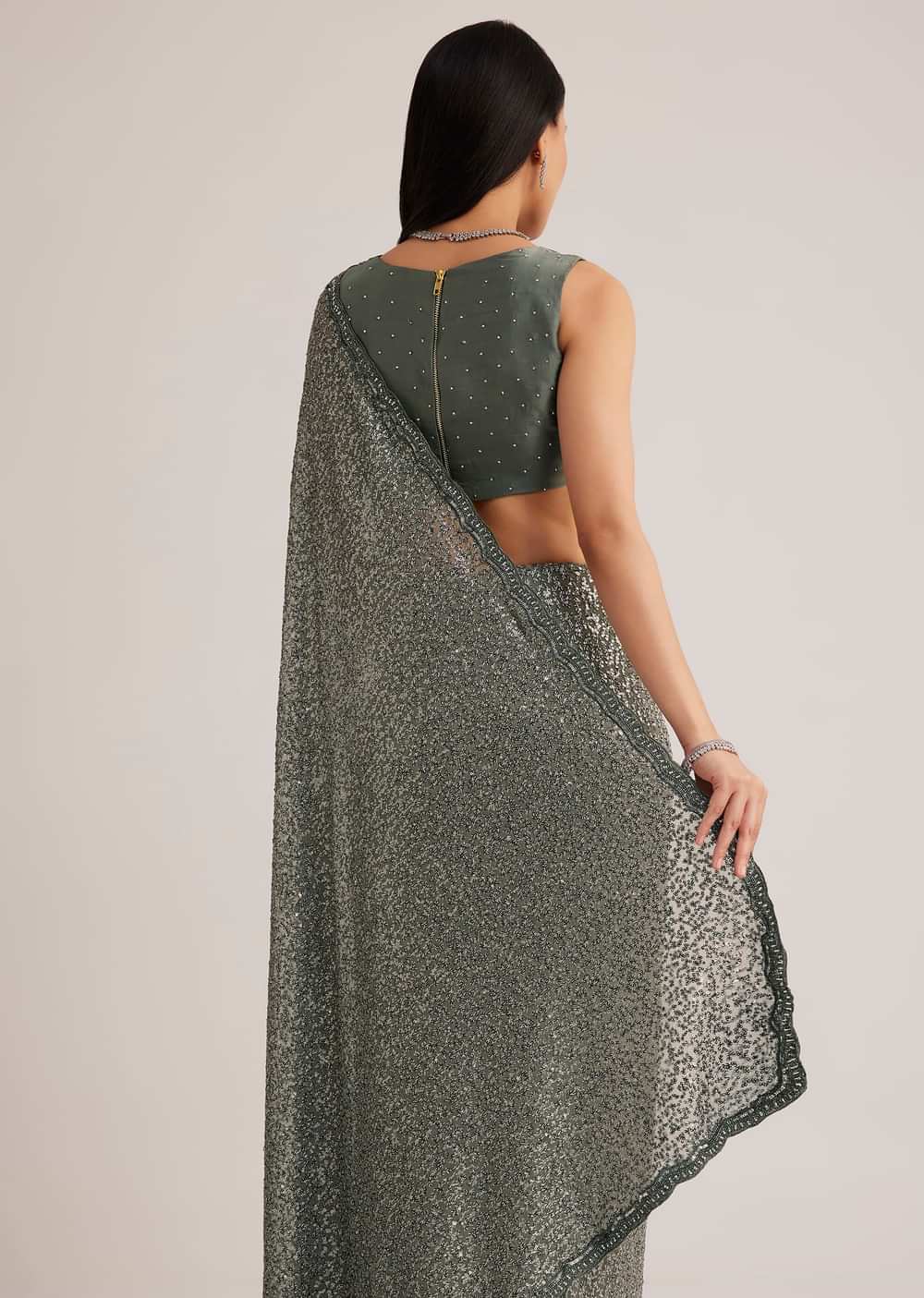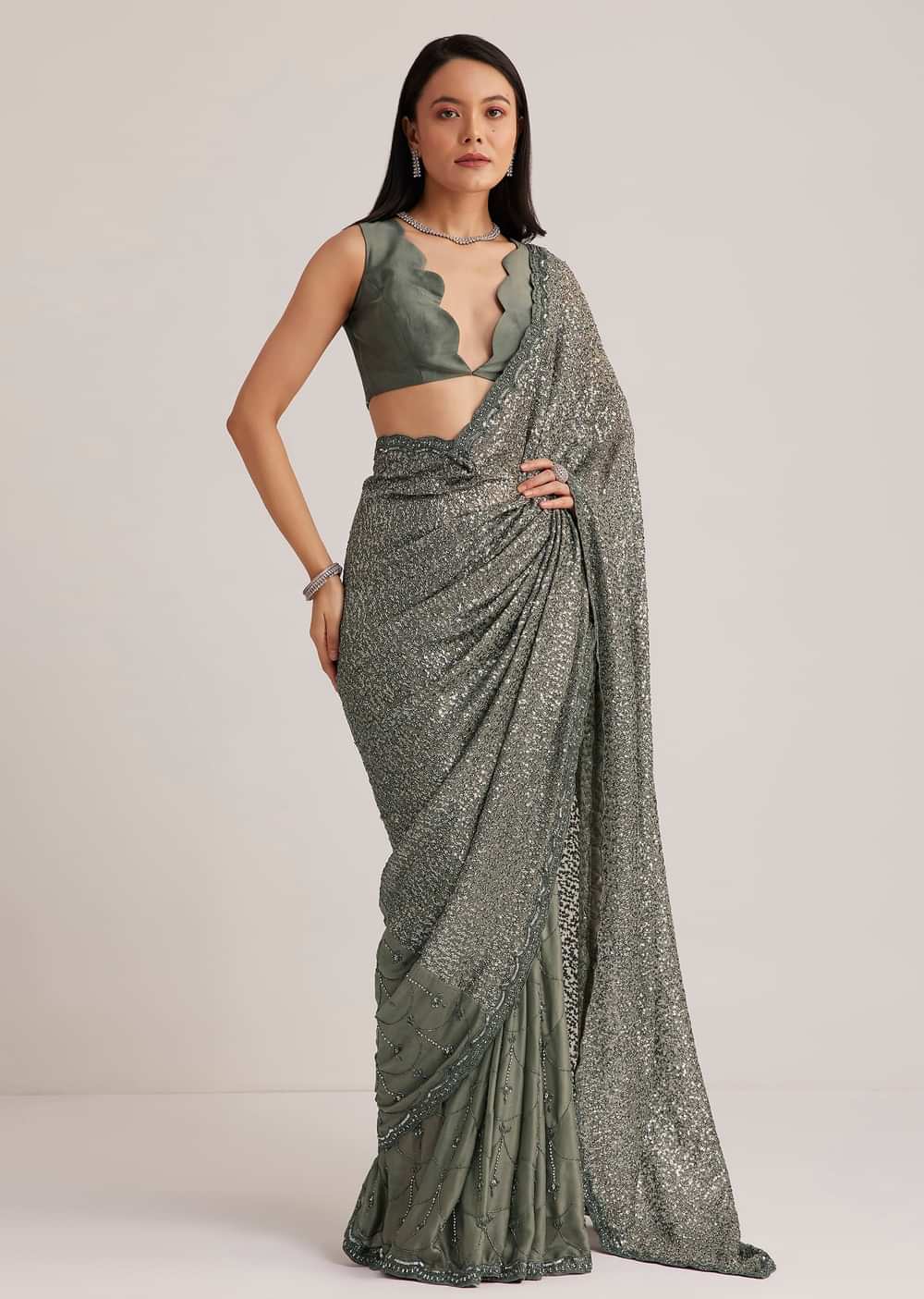 - This grey sequins saree is a stunning blend of shimmering elegance and intricate craftsmanship.