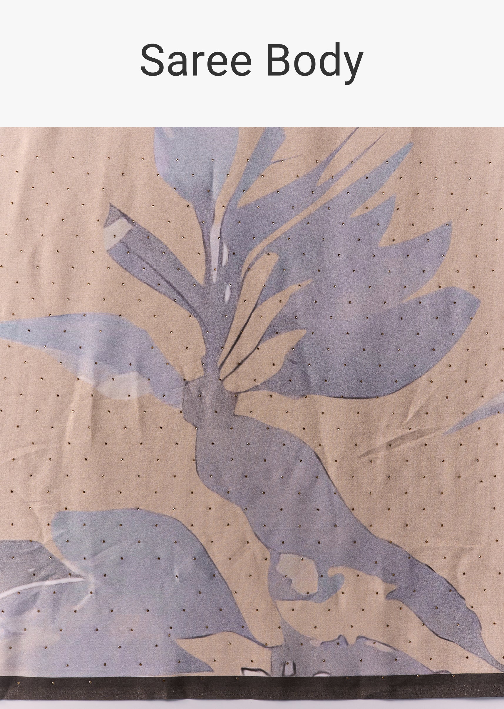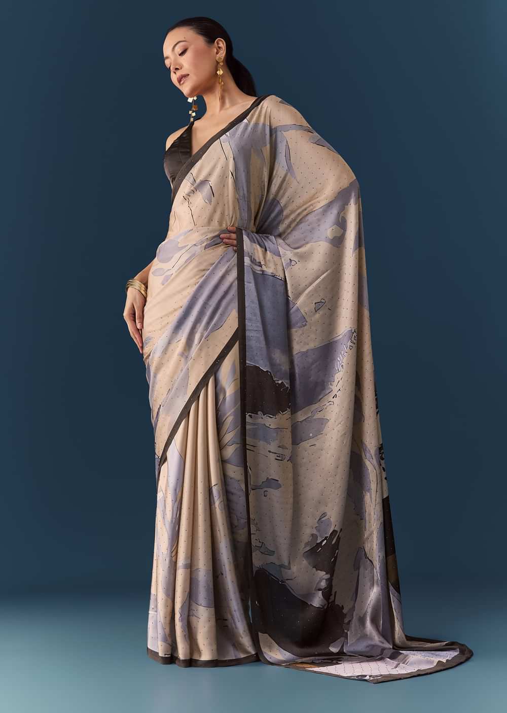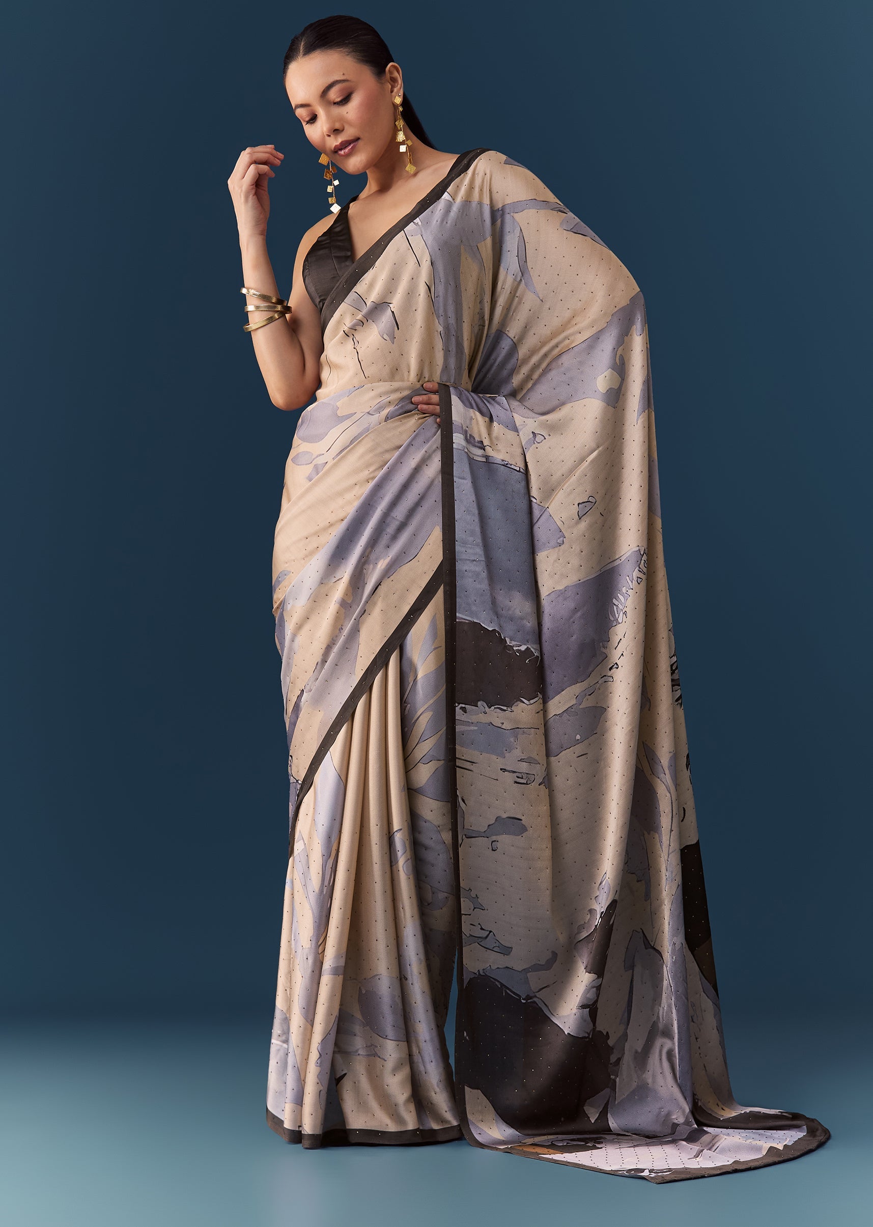 Step into modern elegance with this grey shaded satin saree, featuring vibrant multi-color prints and delicate stone embellishments all over. The lustrous satin fabric offers a smooth, graceful drape, while the contrasting stone black blouse fabric adds a striking touch of sophistication. Perfect for festive occasions, evening events, or special gatherings, this saree blends contemporary design with timeless appeal. Awarded as the Most Trusted Brand, we're delivering styles you love, just as promised.
