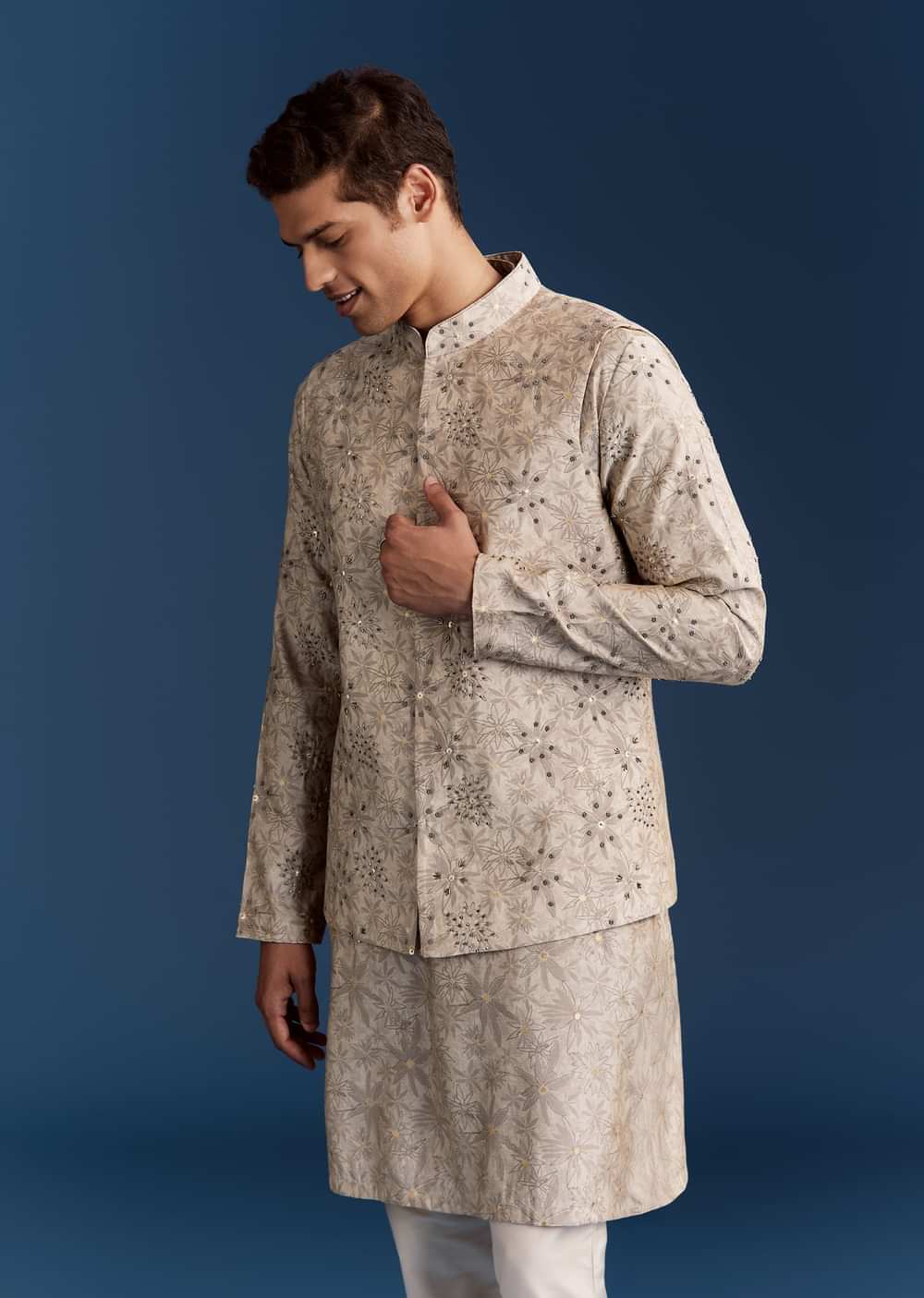 Ideal for mehendi celebrations, this grey silk kurta jacket set combines sequins and moti detailing for a subtle yet elegant look. The mandarin collar and button-front jacket keep it timelessly... More Product Details