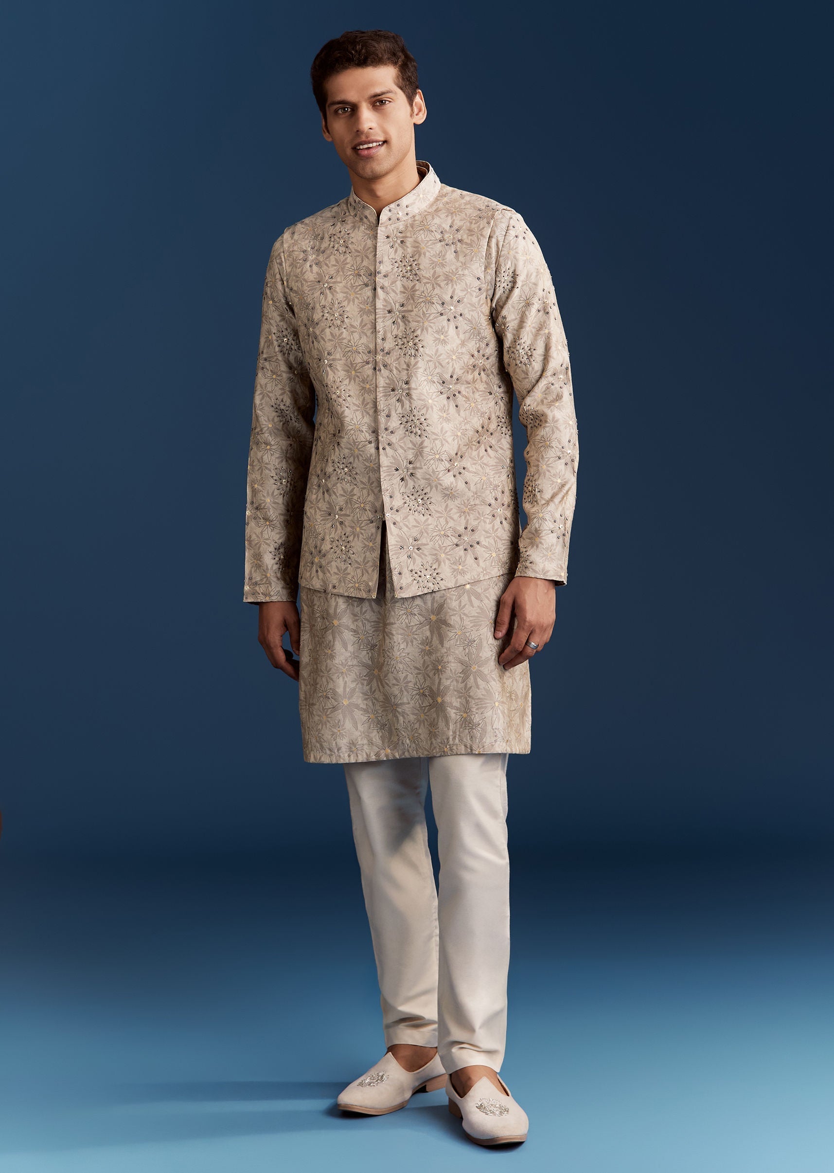 Grey Silk Kurta Jacket Set With Sequins And Moti Detailing