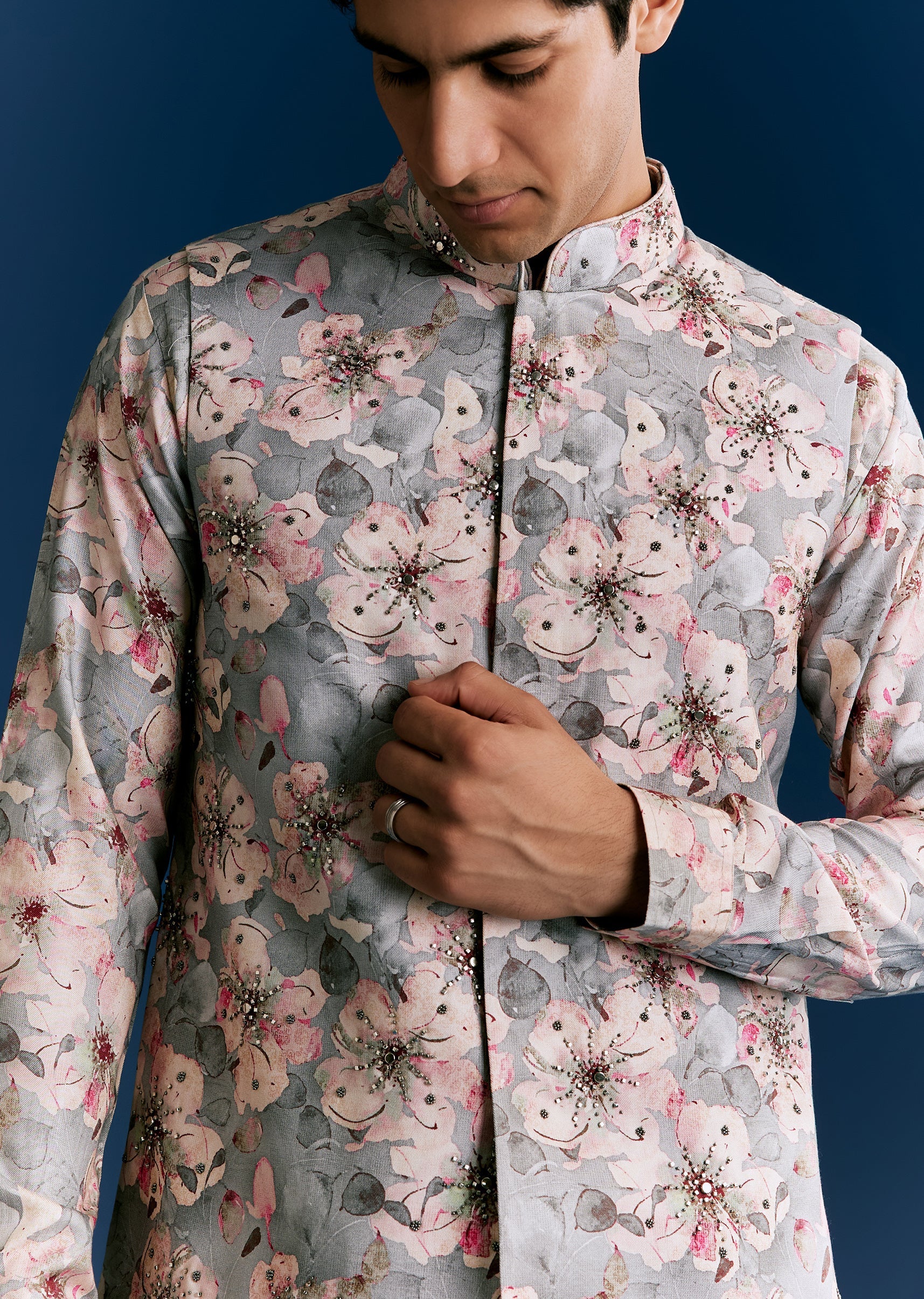 Grey Silk Kurta Jacket Set With Sequins And Thread Embroidery