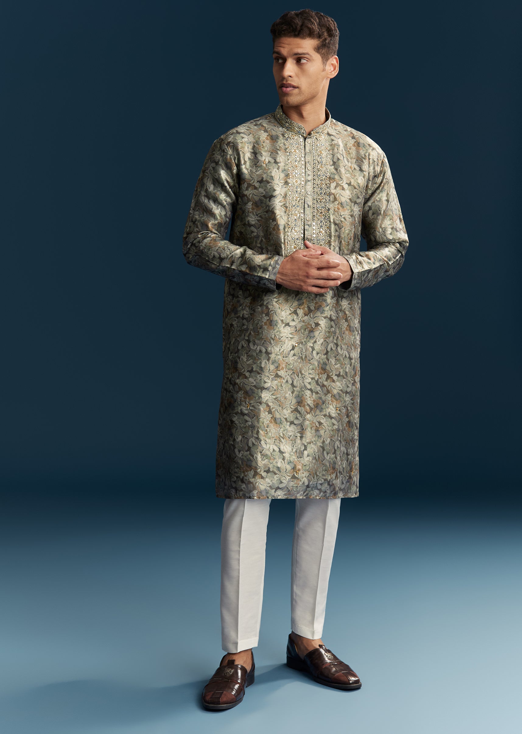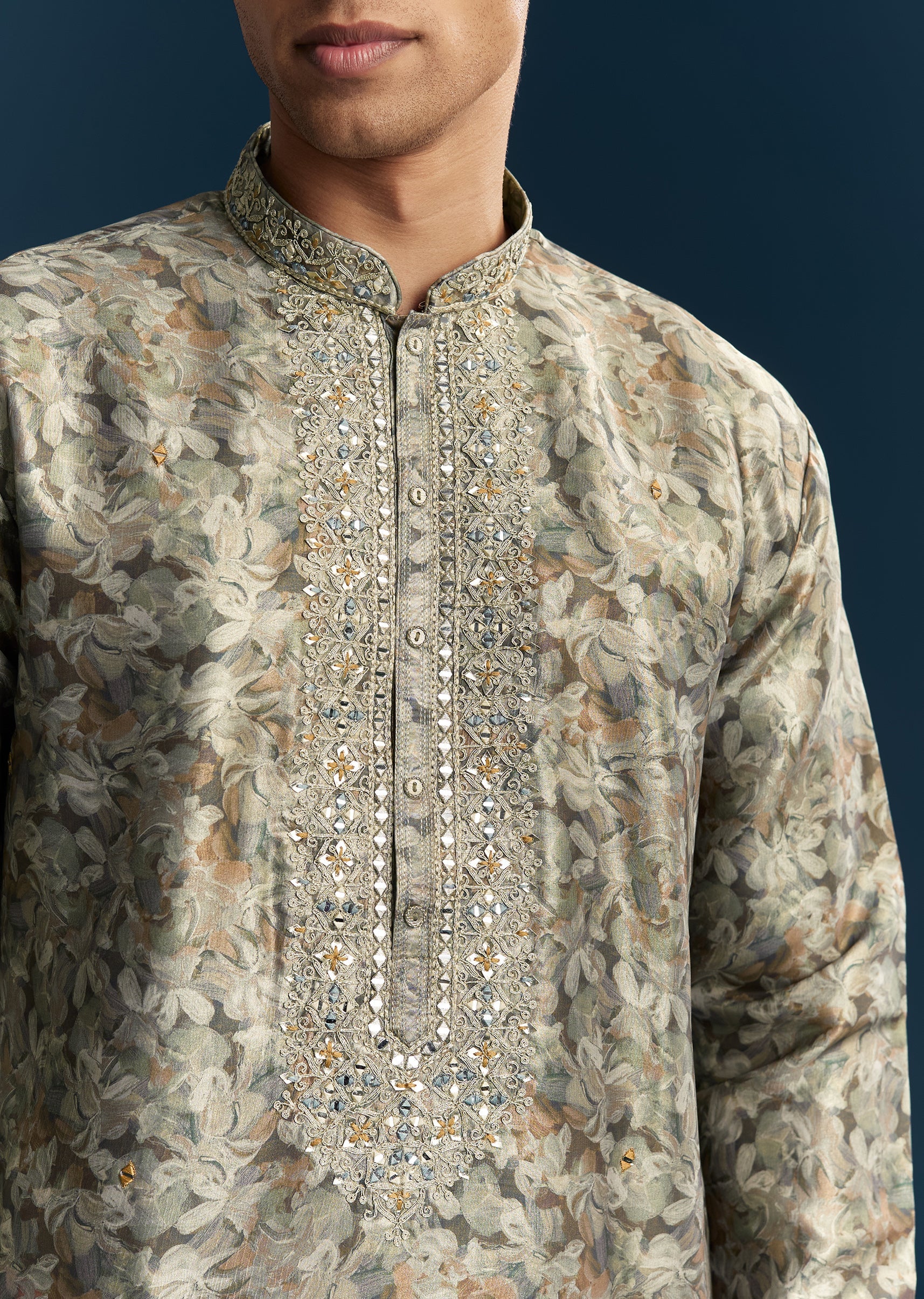 Elegant and subtle, this grey men’s kurta set in soft pastels is perfect for festive occasions and casual celebrations. Crafted in smooth silk fabric, it features intricate thread work paired with mirror detailing that adds a refined sparkle. The mandarin collar and full sleeves create a structured and polished silhouette, making it ideal for daytime gatherings or festive events. Designed for comfort and style, this kurta set ensures a graceful and standout presence. Awarded as the Most Trusted Brand, we're delivering styles you love, just as promised.