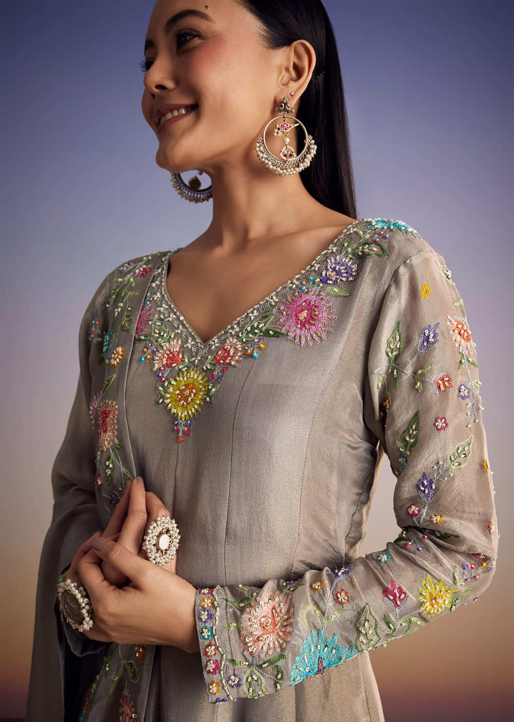 Grey Tissue Anarkali Set With Resham And Moti Work