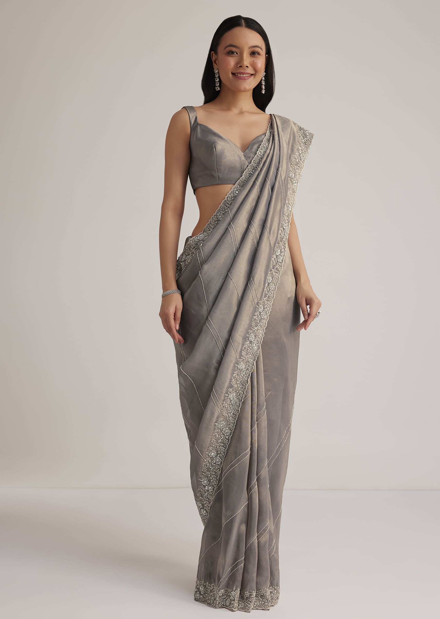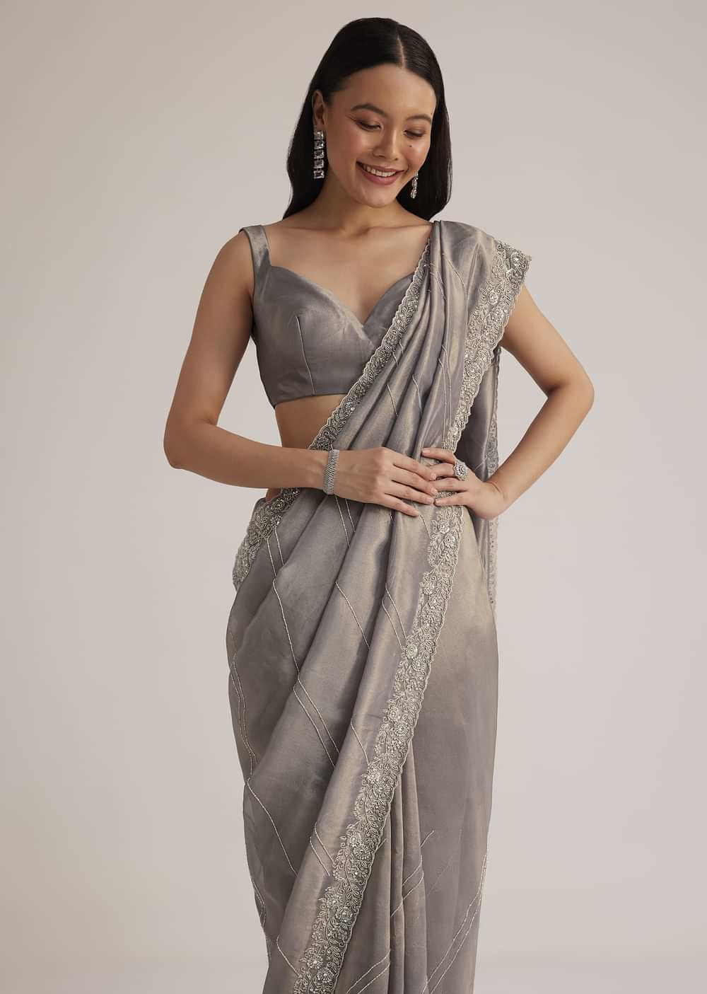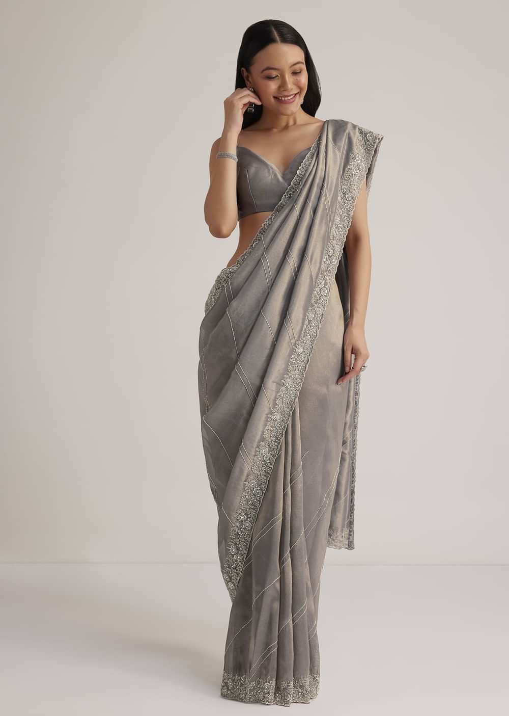 - Drape Yourself In The Timeless Elegance Of This Grey Tissue Saree, Adorned With Intricate Cutdana And Stone Embroidery That Sparkles With Sophistication.