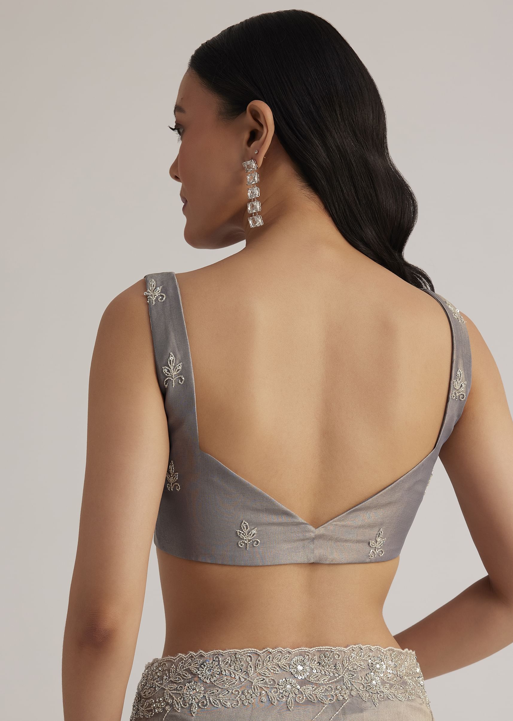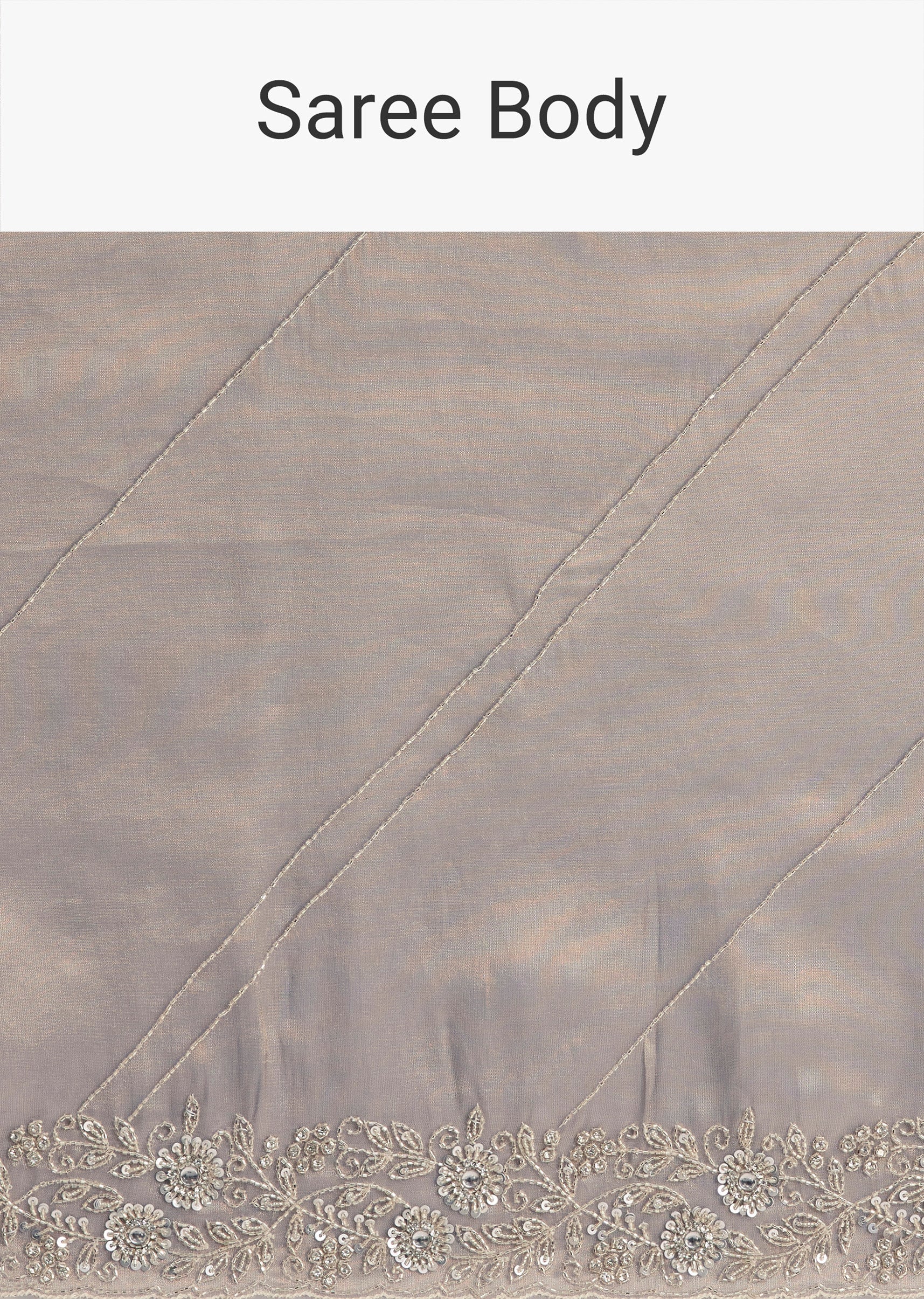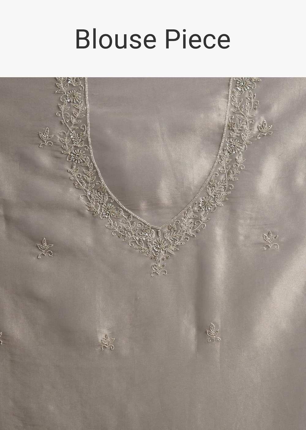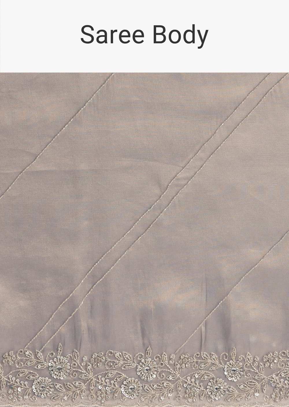 - Drape Yourself In The Timeless Elegance Of This Grey Tissue Saree, Adorned With Intricate Cutdana And Stone Embroidery That Sparkles With Sophistication.