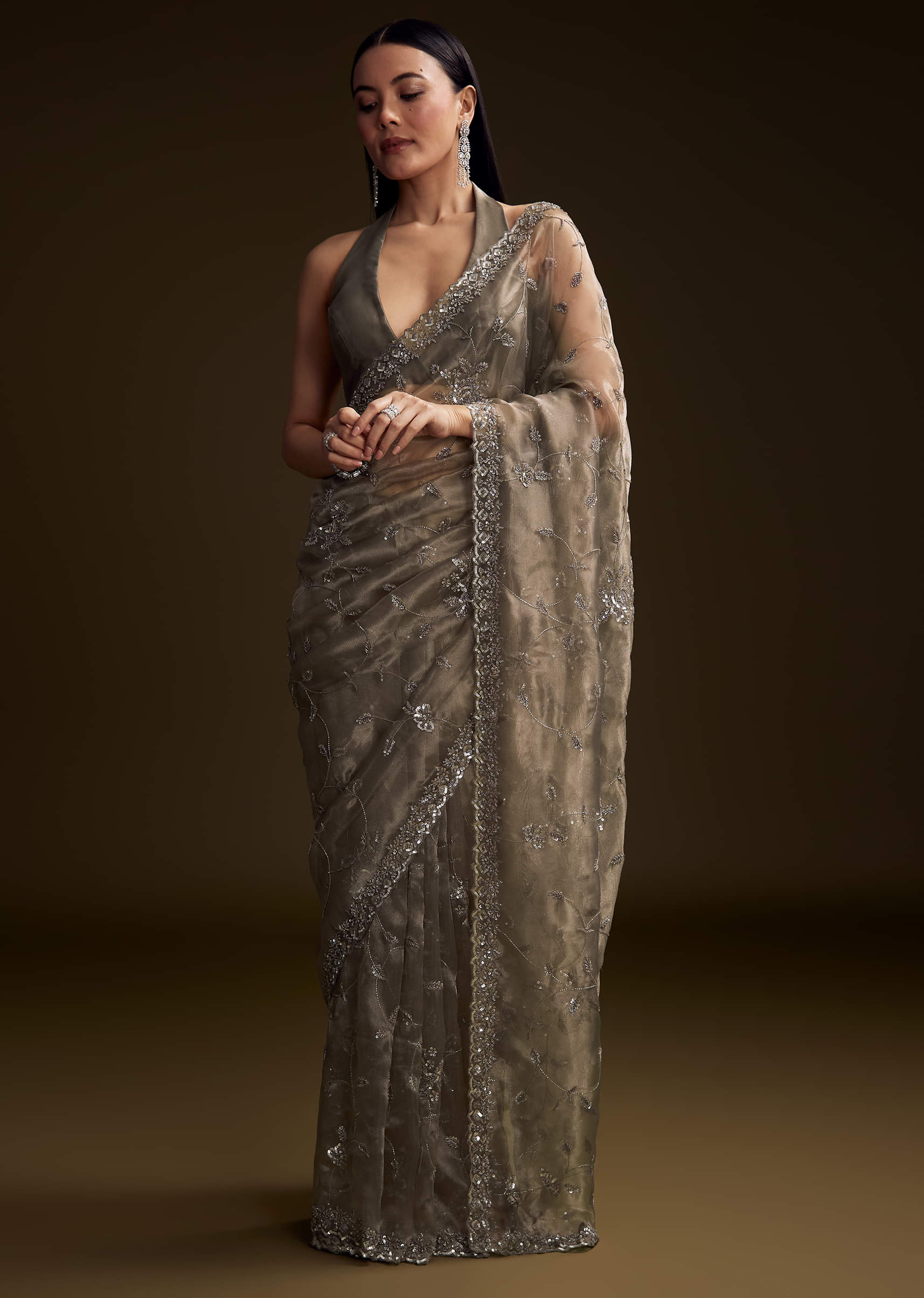 Grey Tissue Saree With Floral Jaal And Sequin Embroidery