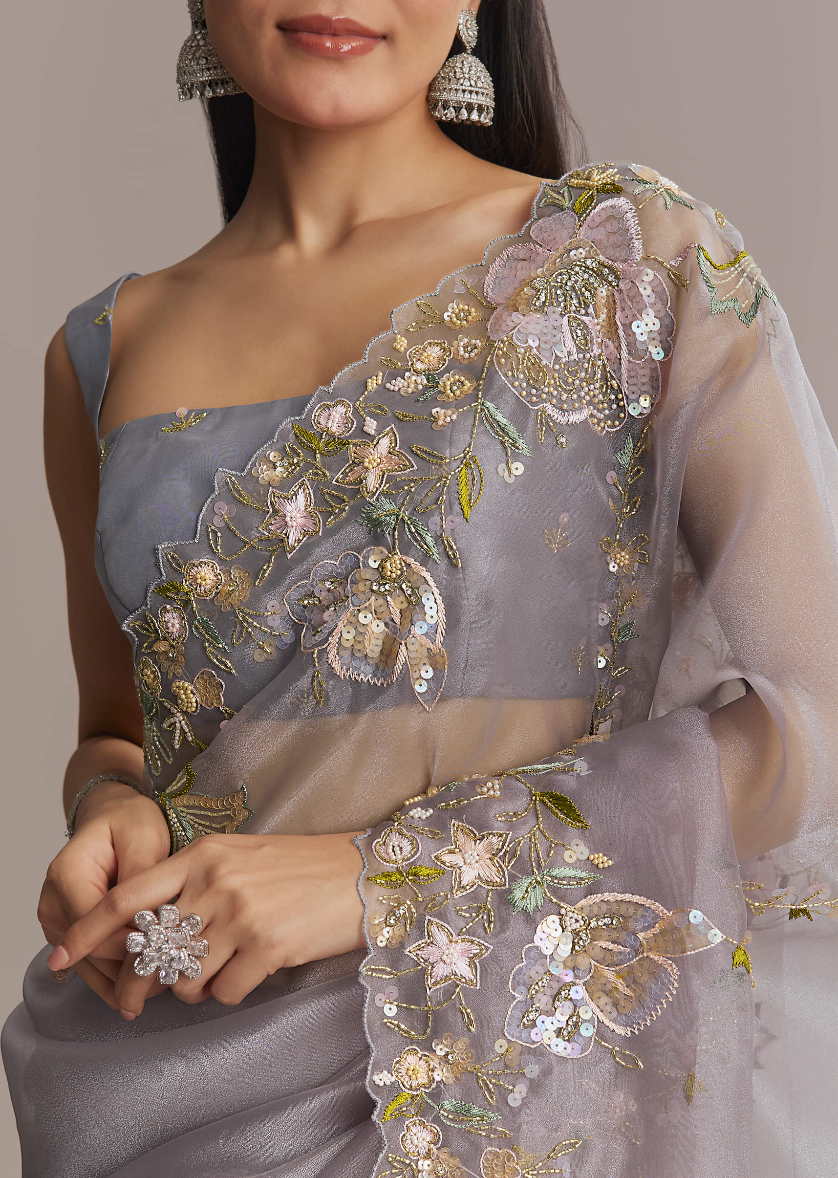 Grey Tissue Saree With Resham And Moti Embroidery