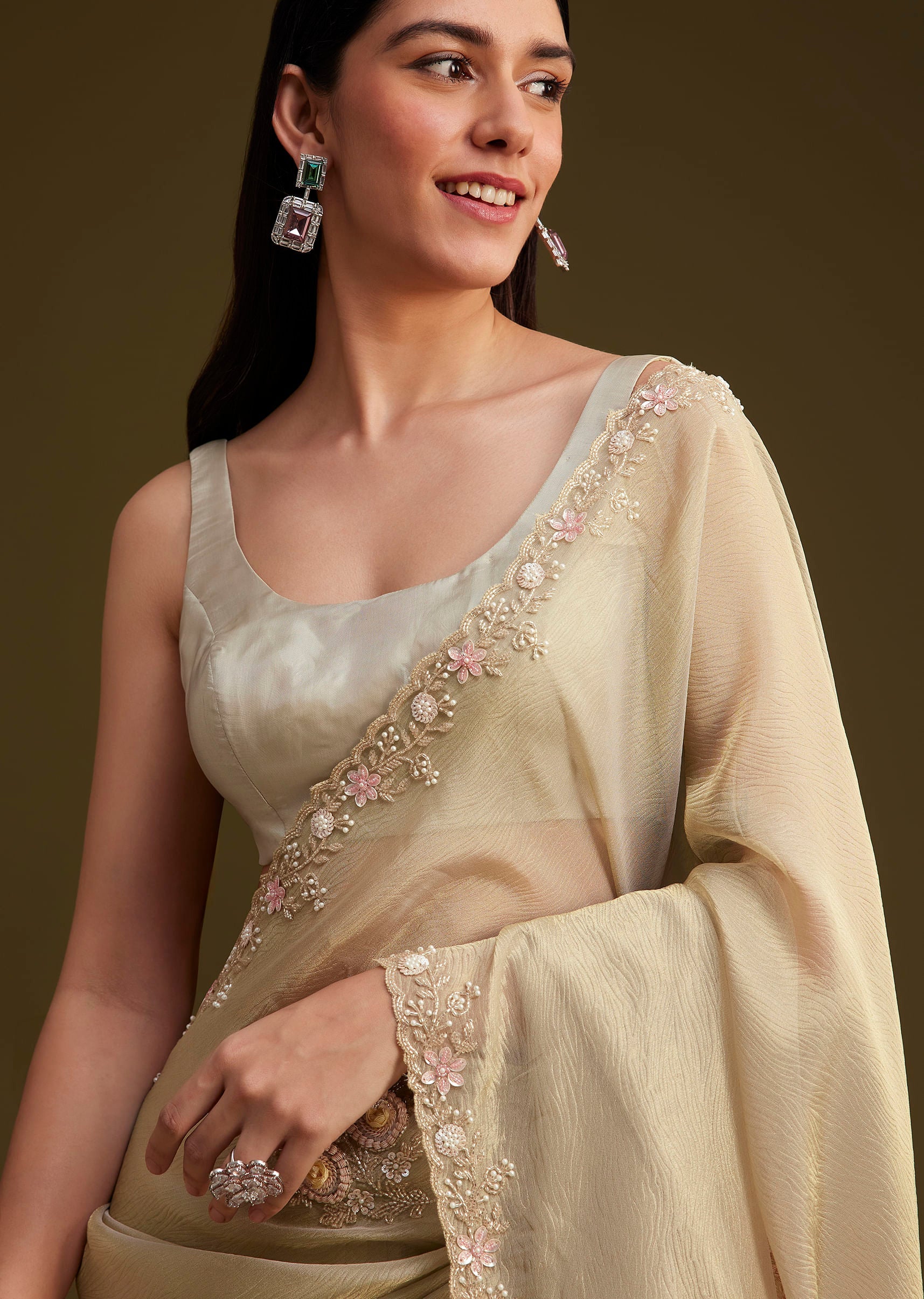 Pair it with a sleek metallic clutch and delicate silver jewelry to highlight the embroidery and shimmer of the saree.