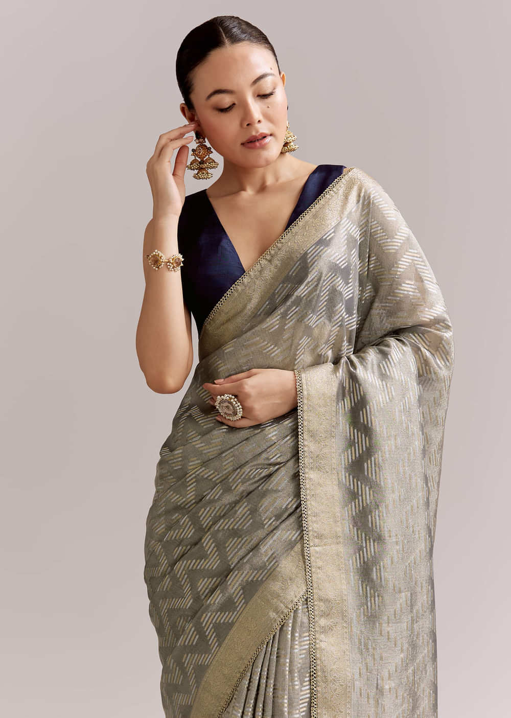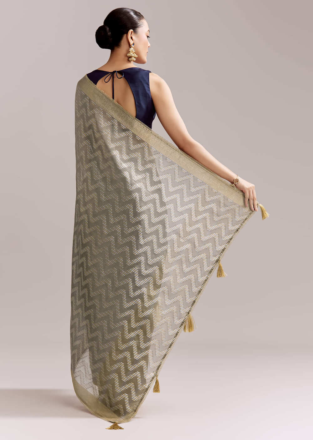 Grey Tissue Silk Woven Saree With Zig Zag Motif And Zari Border