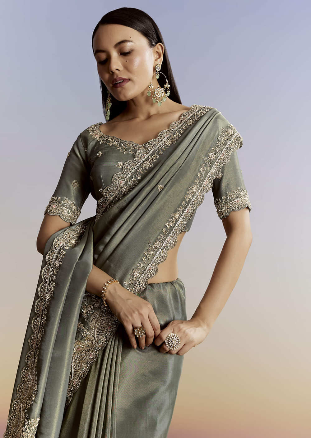 Greyish blue like a twilight sky, this tissue saree is edged with resham-thread French knots and beads that glimmer like stars. An embroidered blouse makes the ensemble celestial. Awarded as... More Product Details