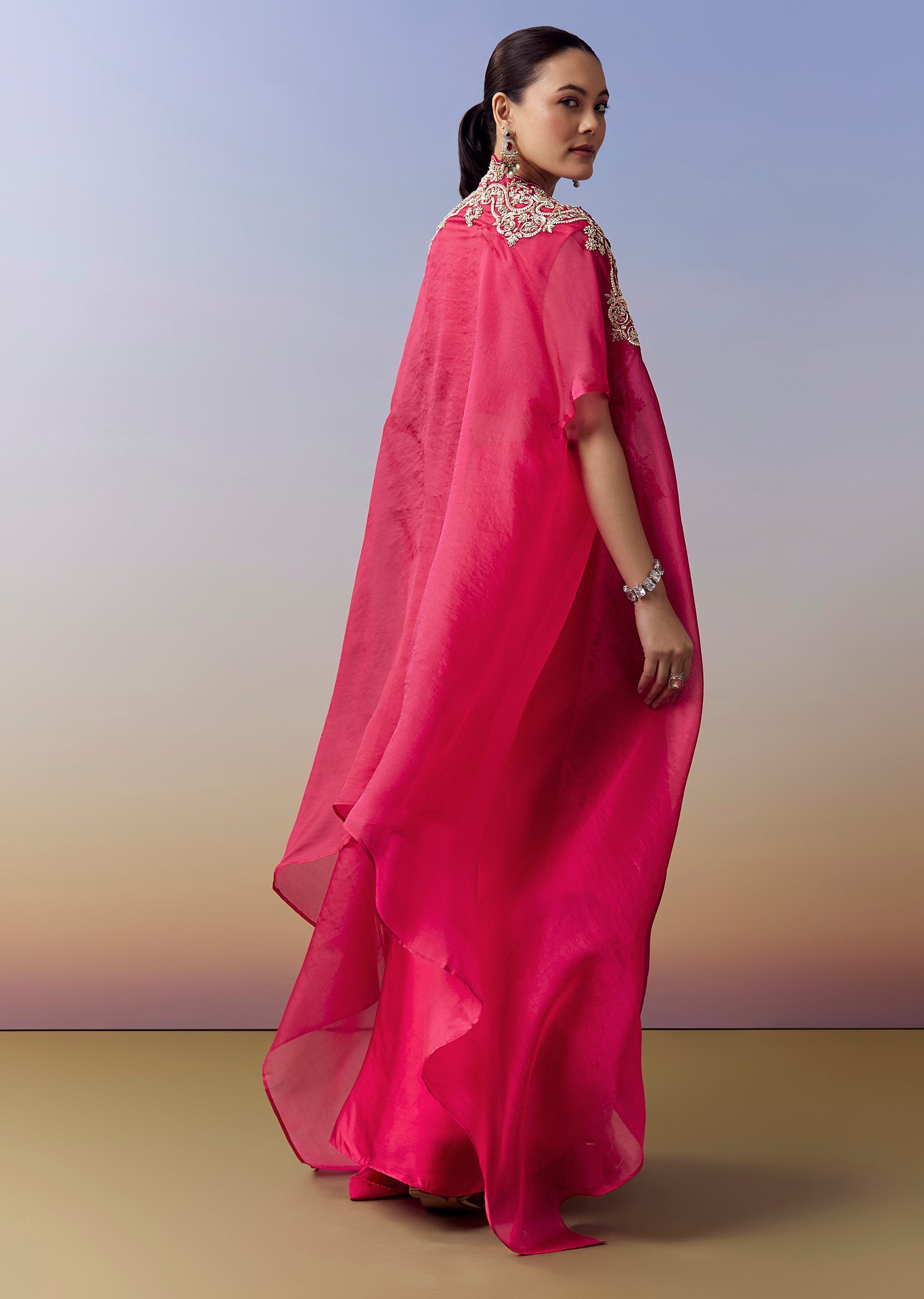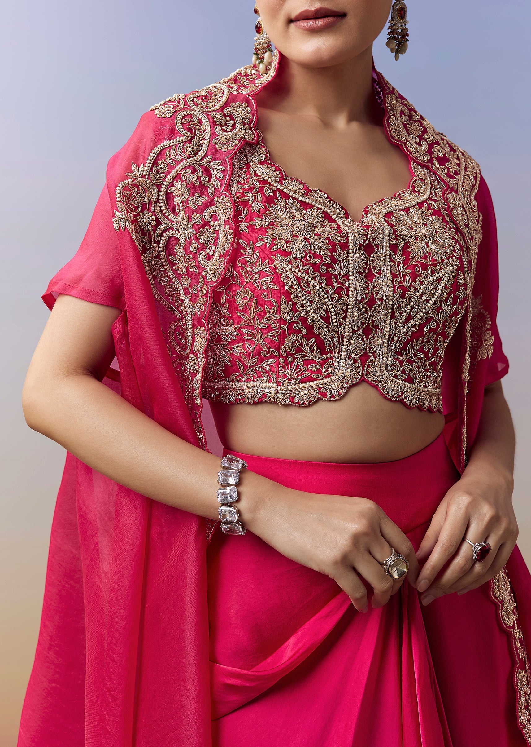Hot Pink Indo Western Crop Top Skirt Set With Zardosi Work And Organza Cape
