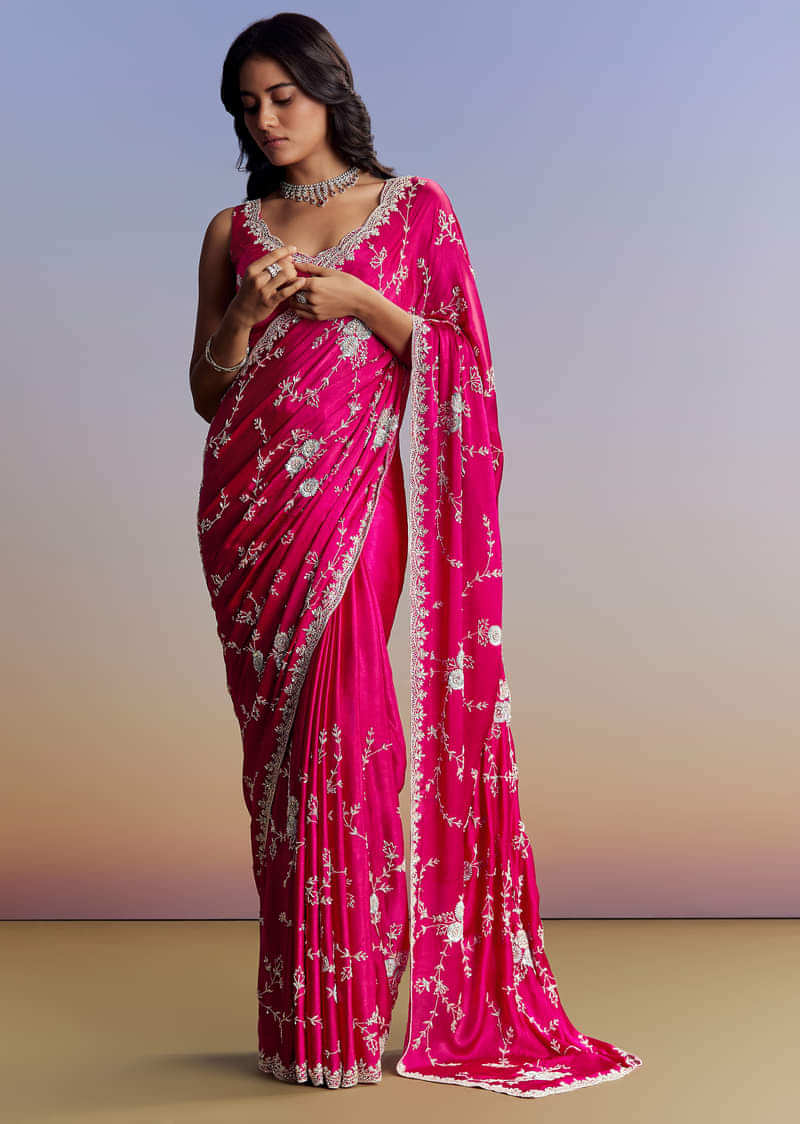 This vibrant pink satin saree dazzles with all-over jaal floral embroidery using cutdana, sequins, and beads. Includes a matching embroidered blouse fabric, ideal for a trousseau or festive family event. Includes An Unstitched Blouse Awarded as the Most Trusted Brand, we're delivering styles you love, just as promised.