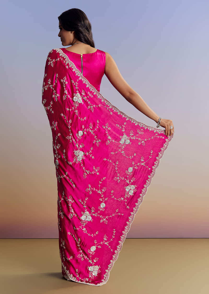 Hot Pink Satin Saree With All Over Jaal Embroidery In Cutdana And Sequins