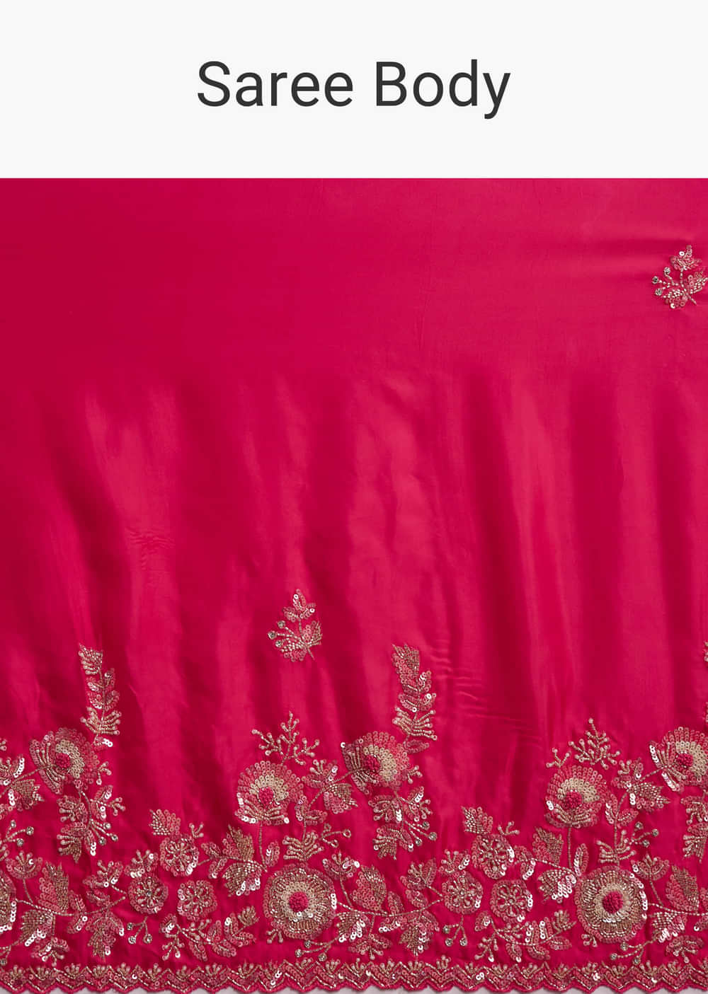 For high-energy evenings, this hot pink satin saree delivers sleek shine with sculpted texture. A heavy, floral embroidered, zigzag cut-worked border sits with bootis across the drape, and the blouse fabric echoes cutdana, multicolour sequins and beads. You feel confident and spotlight-ready as the bride’s mother for karwa chauth, engagement and sangeet functions. Awarded as the Most Trusted Brand, we're delivering styles you love, just as promised.