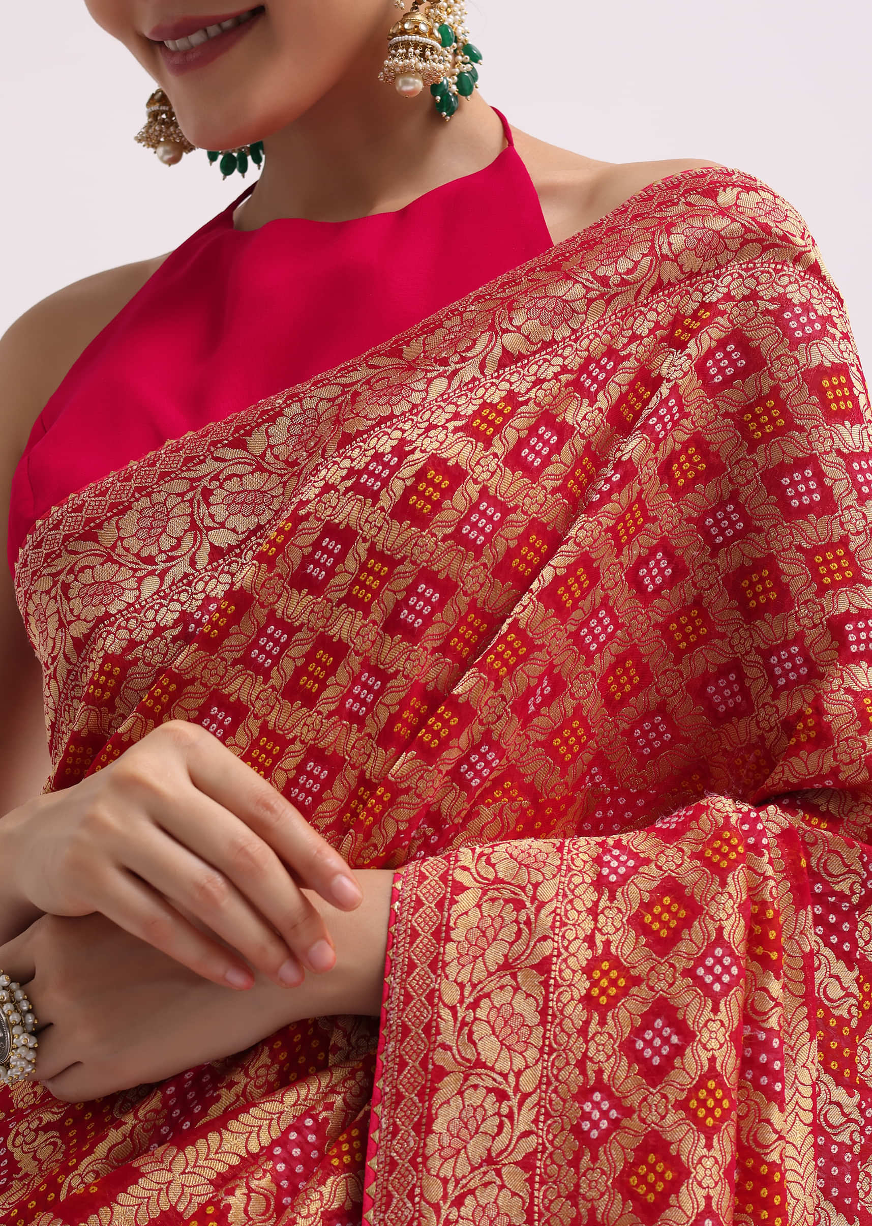 - Designed on a base of khadi georgette, it showcases an intricate gharchola and jaal pattern bandhani throughout.