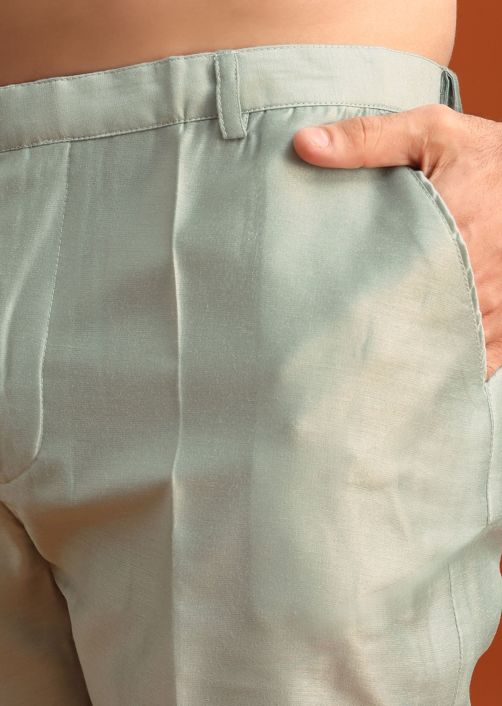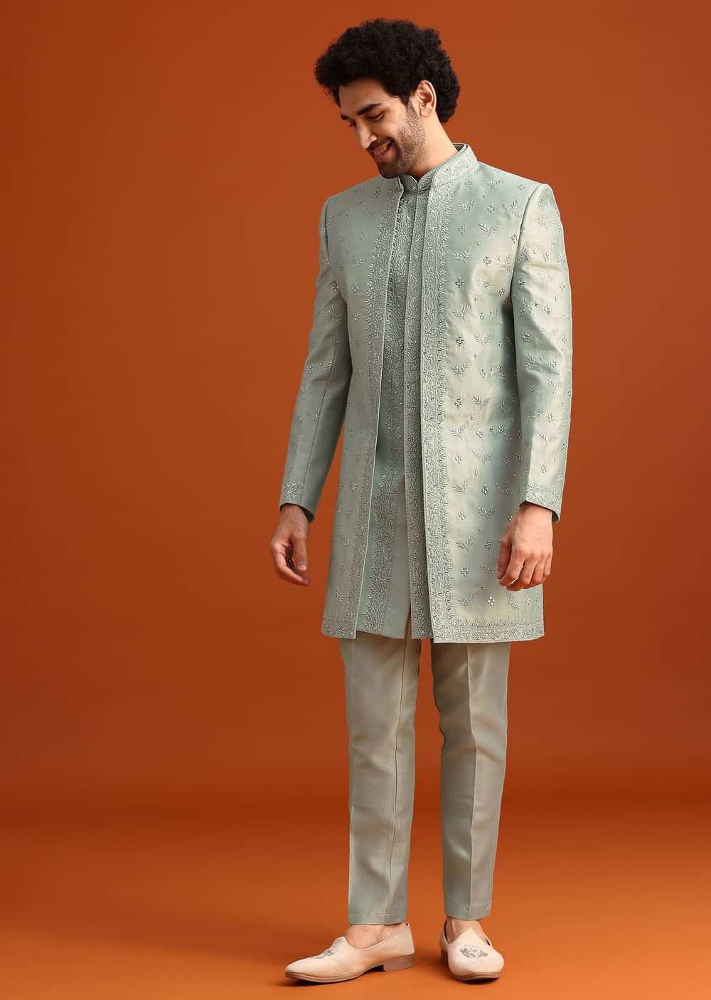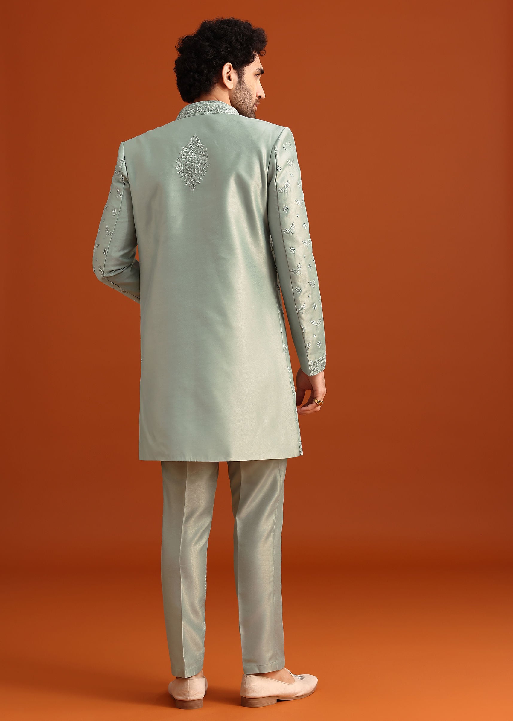 Ice Blue Cotton Silk Embroidered Sherwani Set