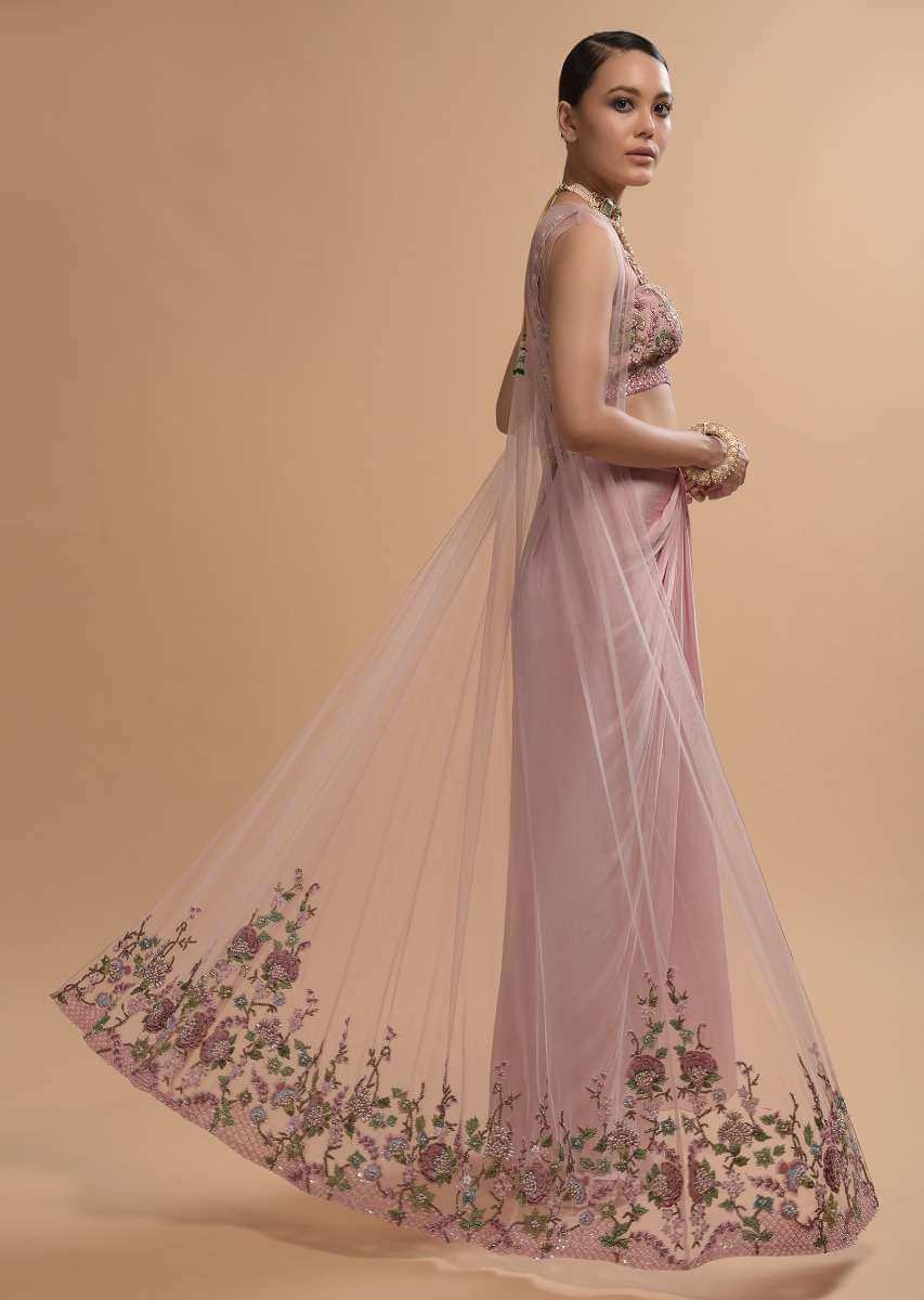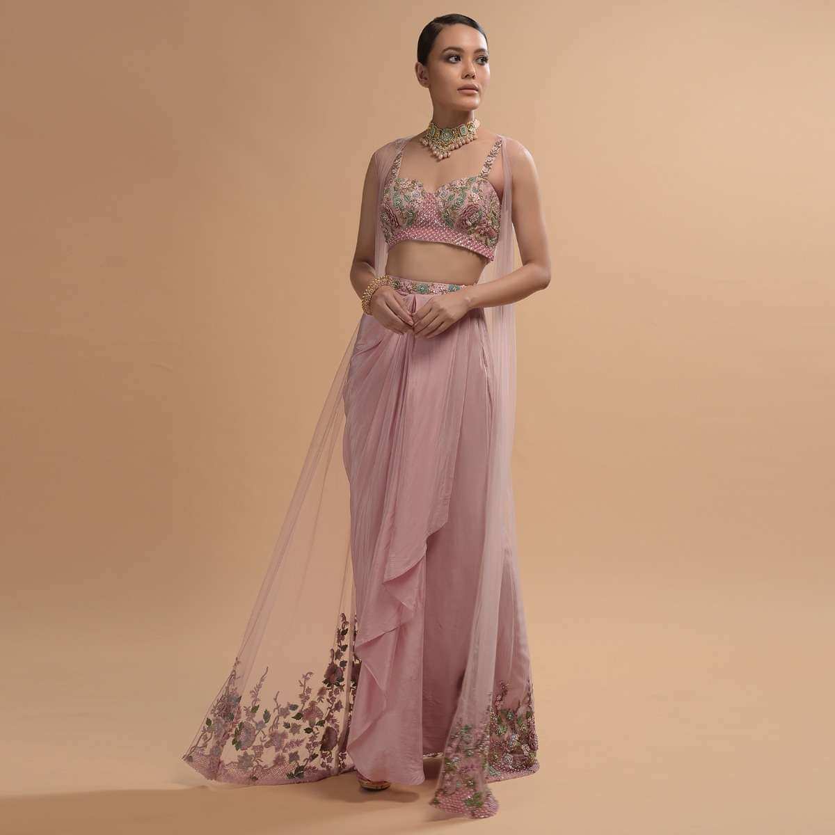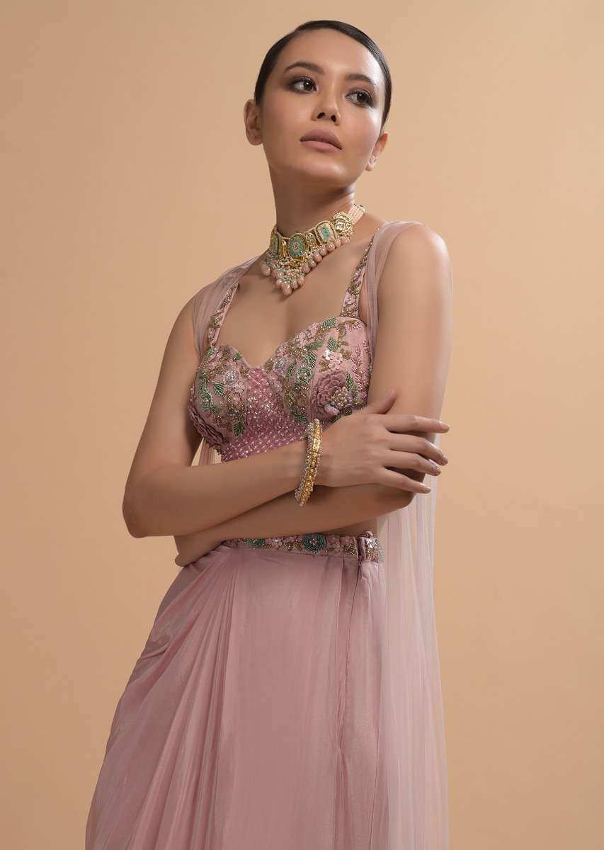 Icy pink draped skirt in crepe with pleated drape in the front. Accompanied with a matching crop top in raw silk with 3D resham flowers, beads, flower shaped sequins and... More Product Details