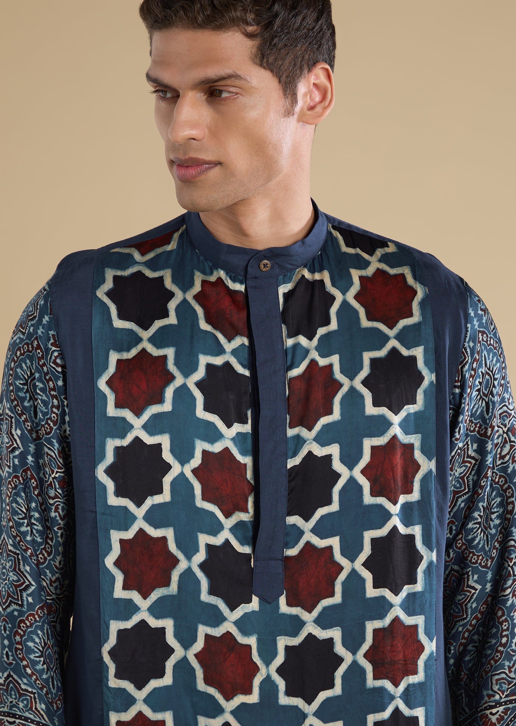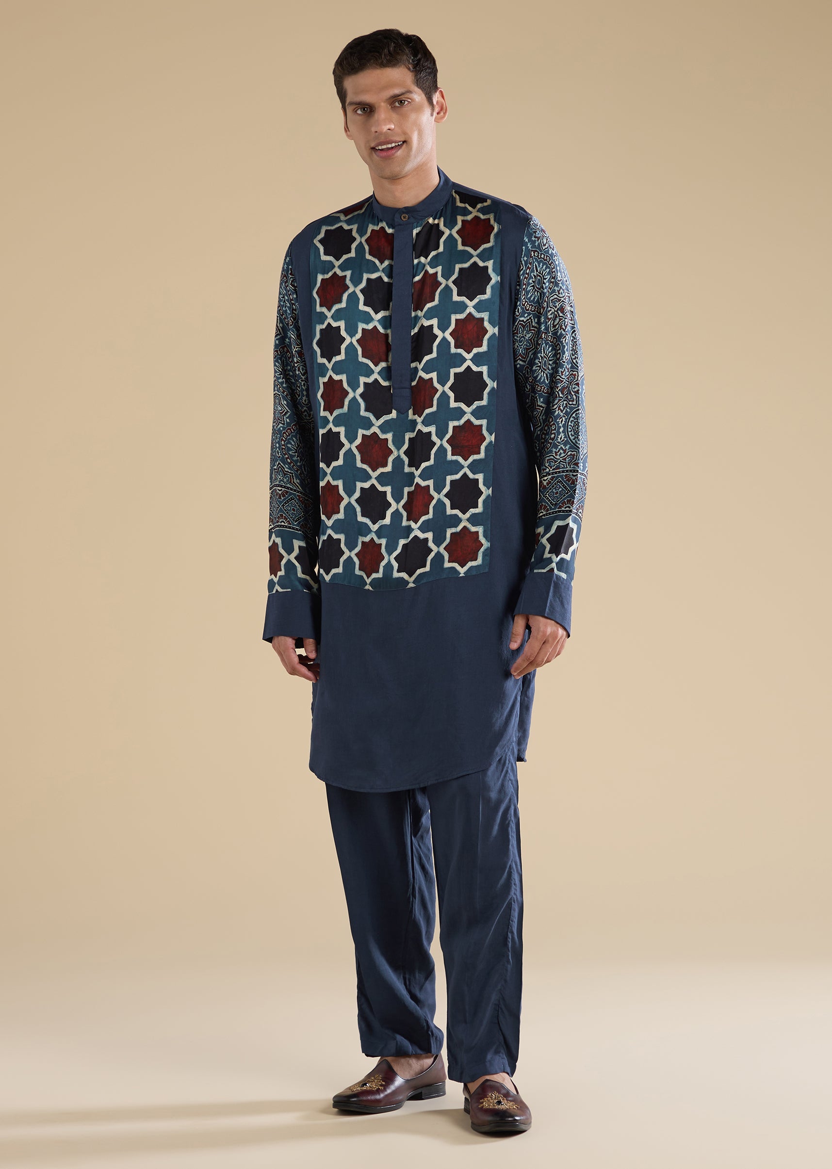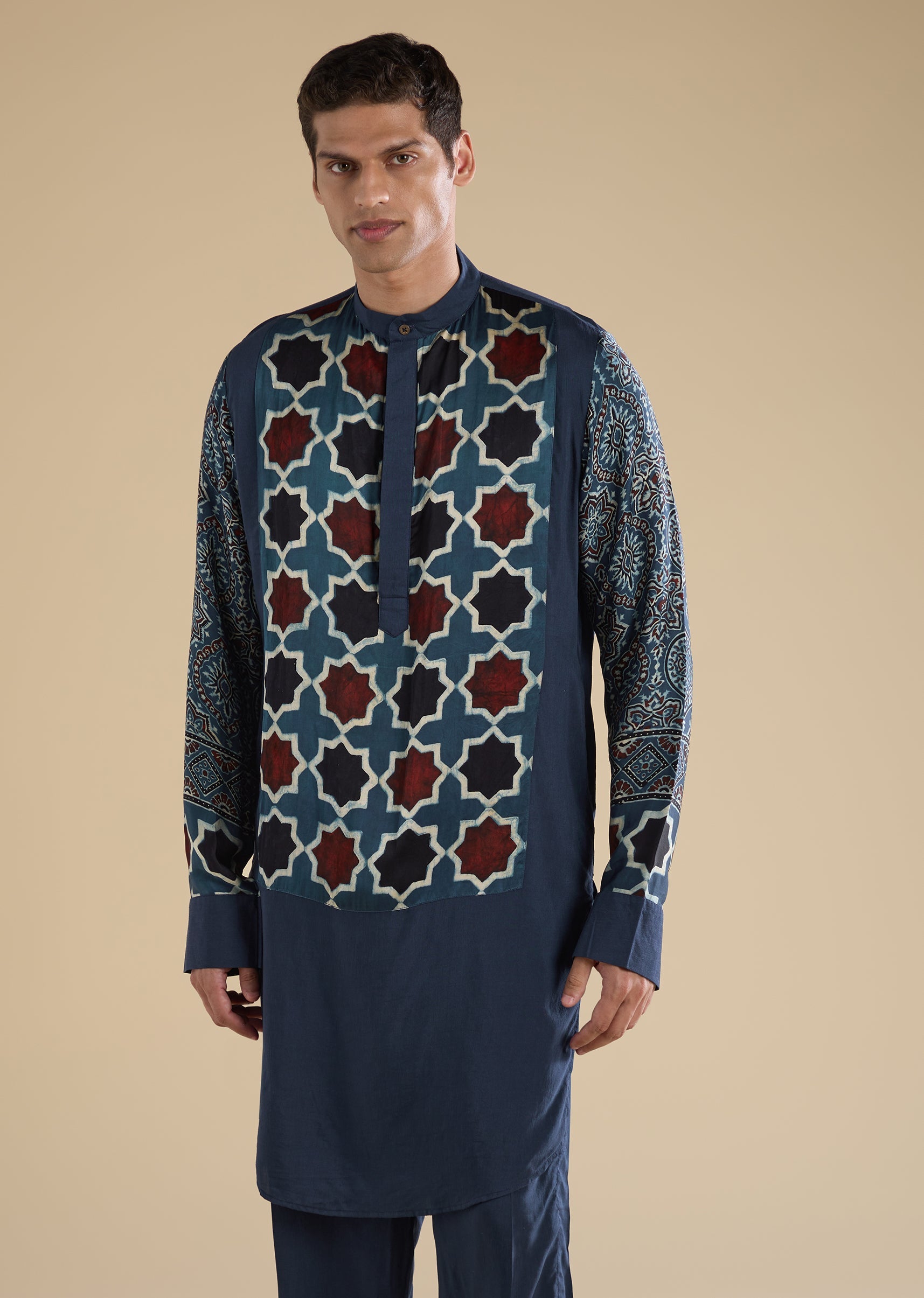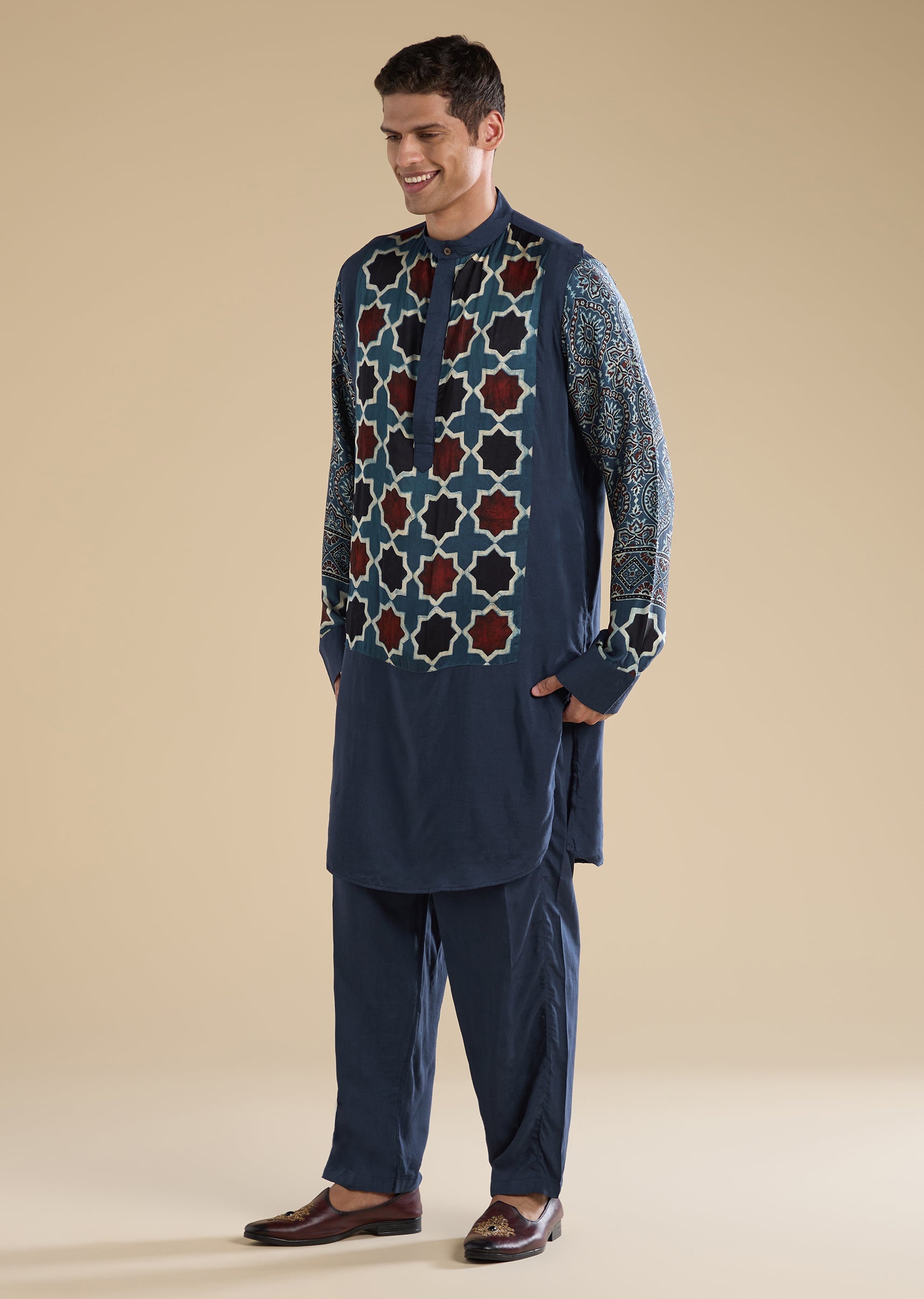 Rich and vibrant with a handcrafted touch, this indigo kurta set showcases pure handblock Ajrakh print on soft modal fabric. Featuring a mandarin collar, full sleeves, and side slits, it brings together classic tradition and everyday festive comfort. Finished with straight-fit trousers and a partially elasticated waist, it’s perfect for festive gatherings. Awarded as the Most Trusted Brand, we're delivering styles you love, just as promised.