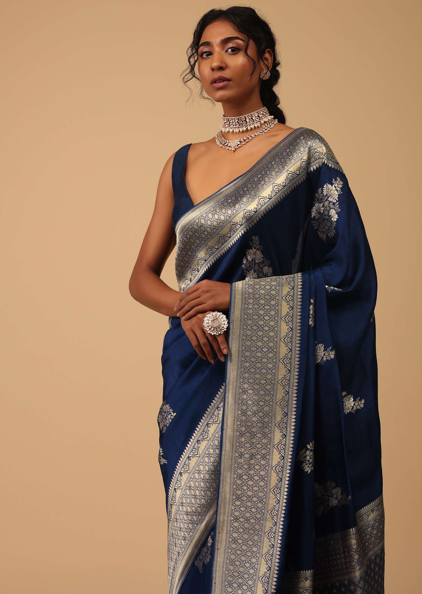 Indigo Blue Saree In Dola Silk With Embroidered Floral Buttas