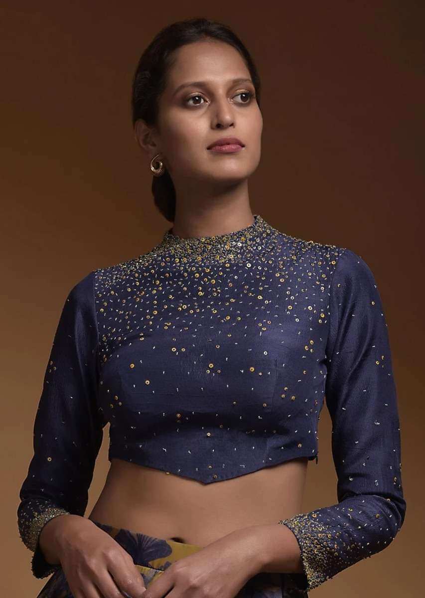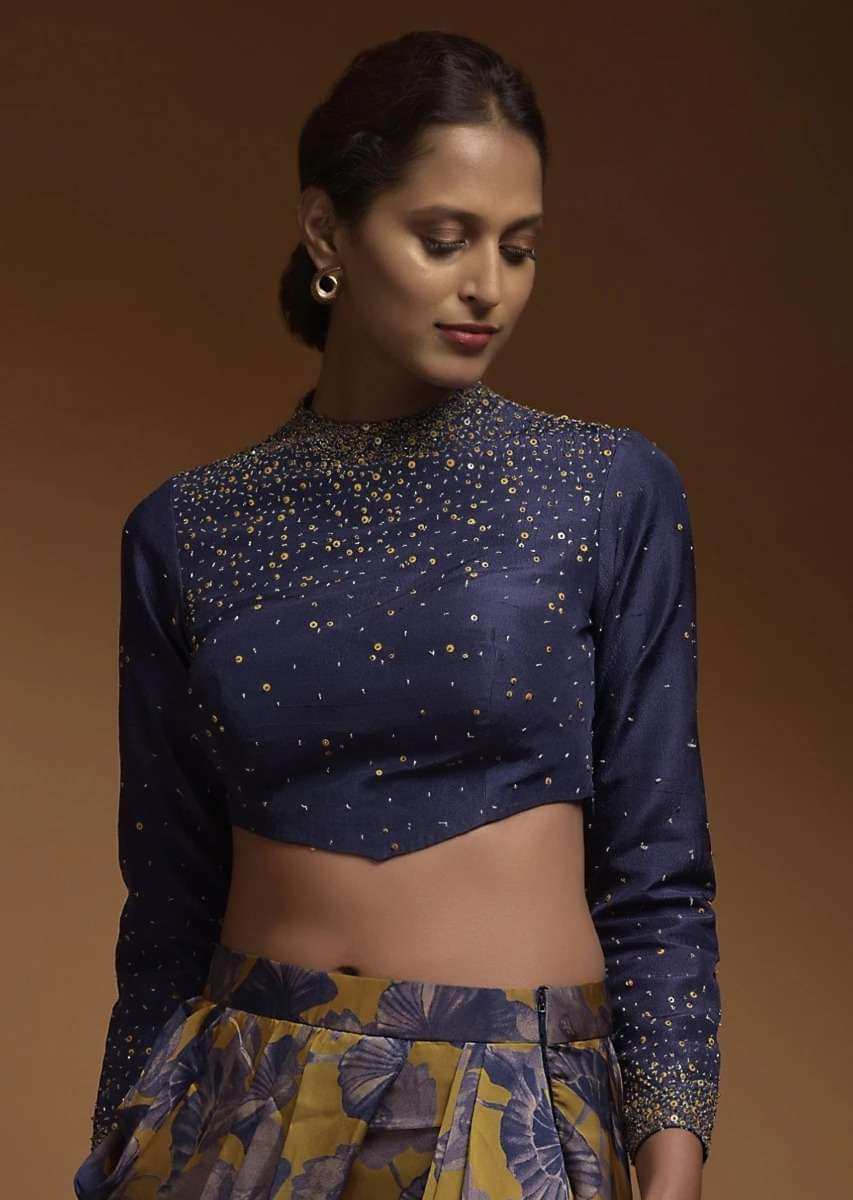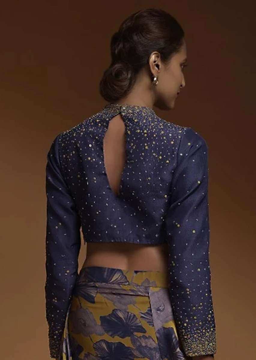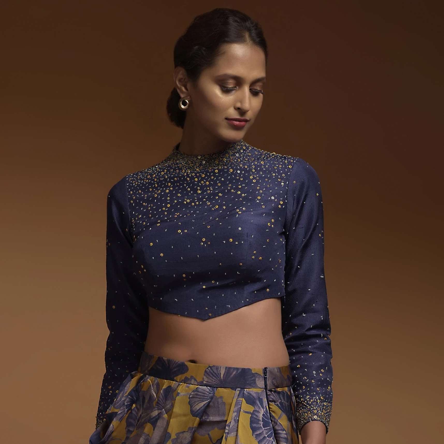 Indigo crop top in silk blend with sequins and beads work in gradient pattern.Crafted with round neckline, full sleeves and V cut hemline.The length of the top is 16 inches. Awarded As The Most Trusted Brand We'Re Delivering Styles You Love Just As Promised.