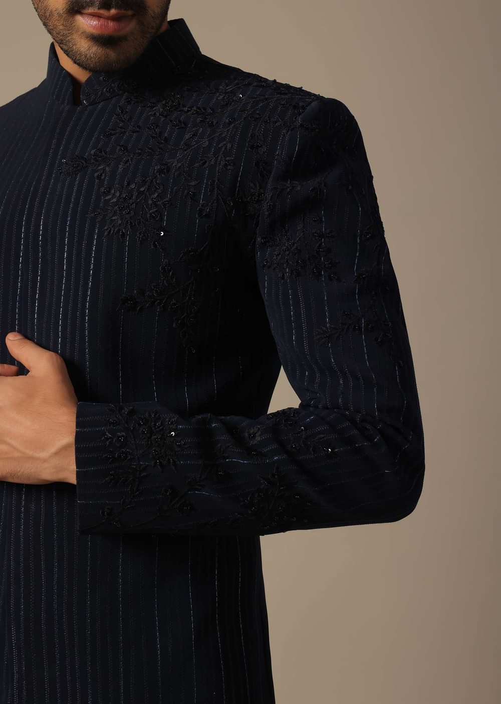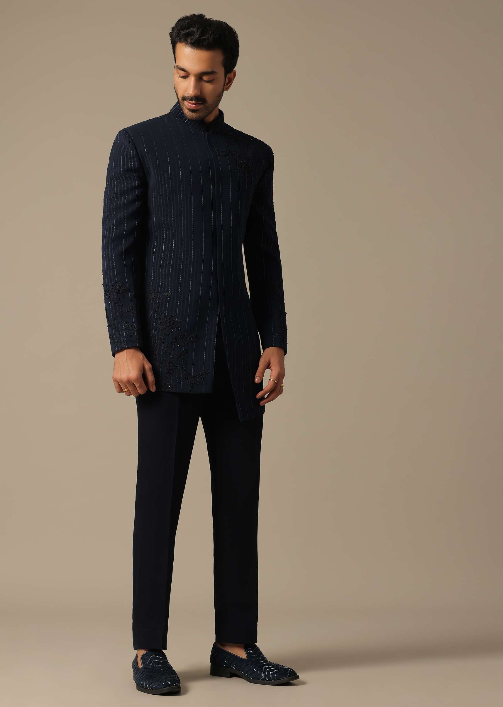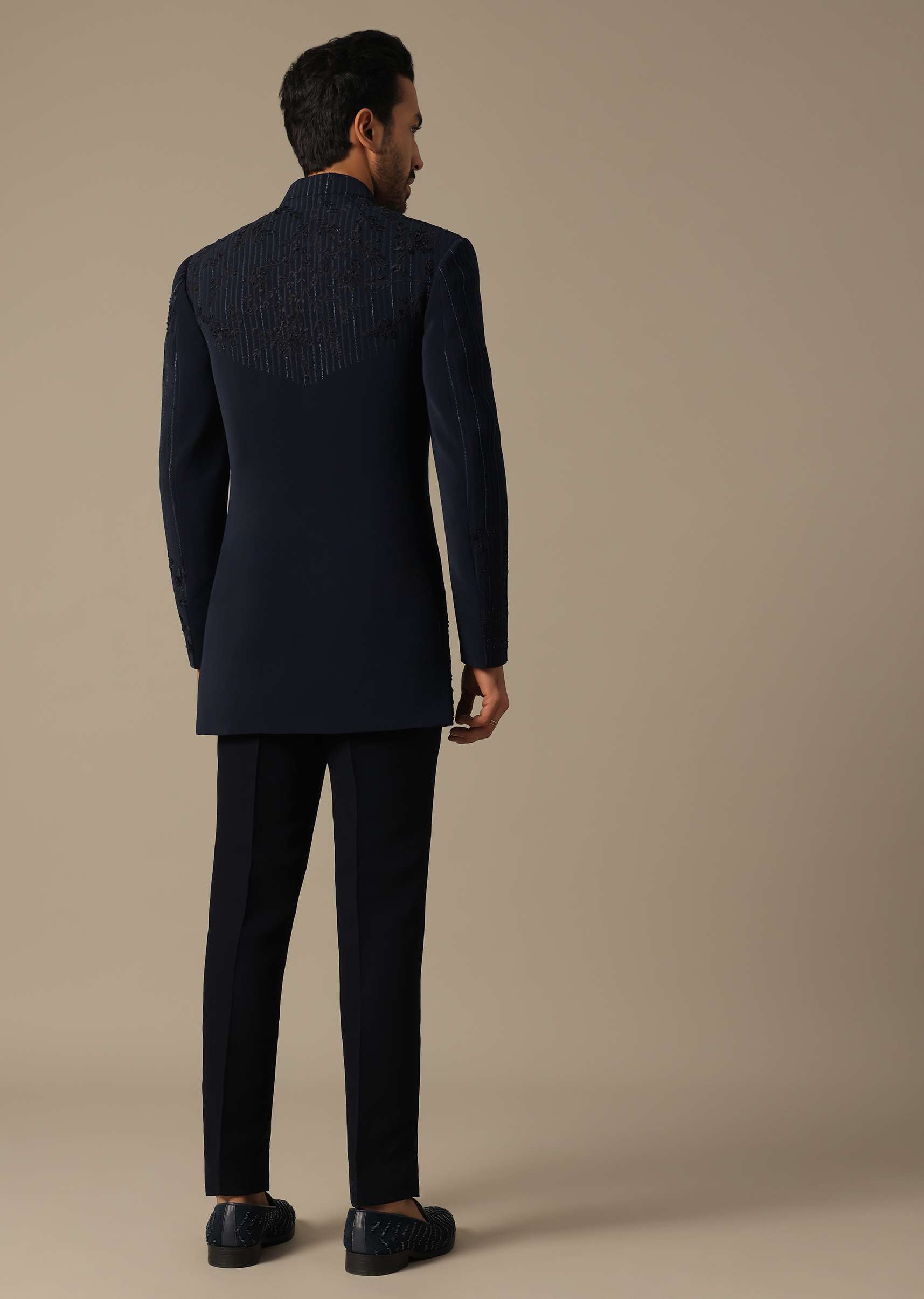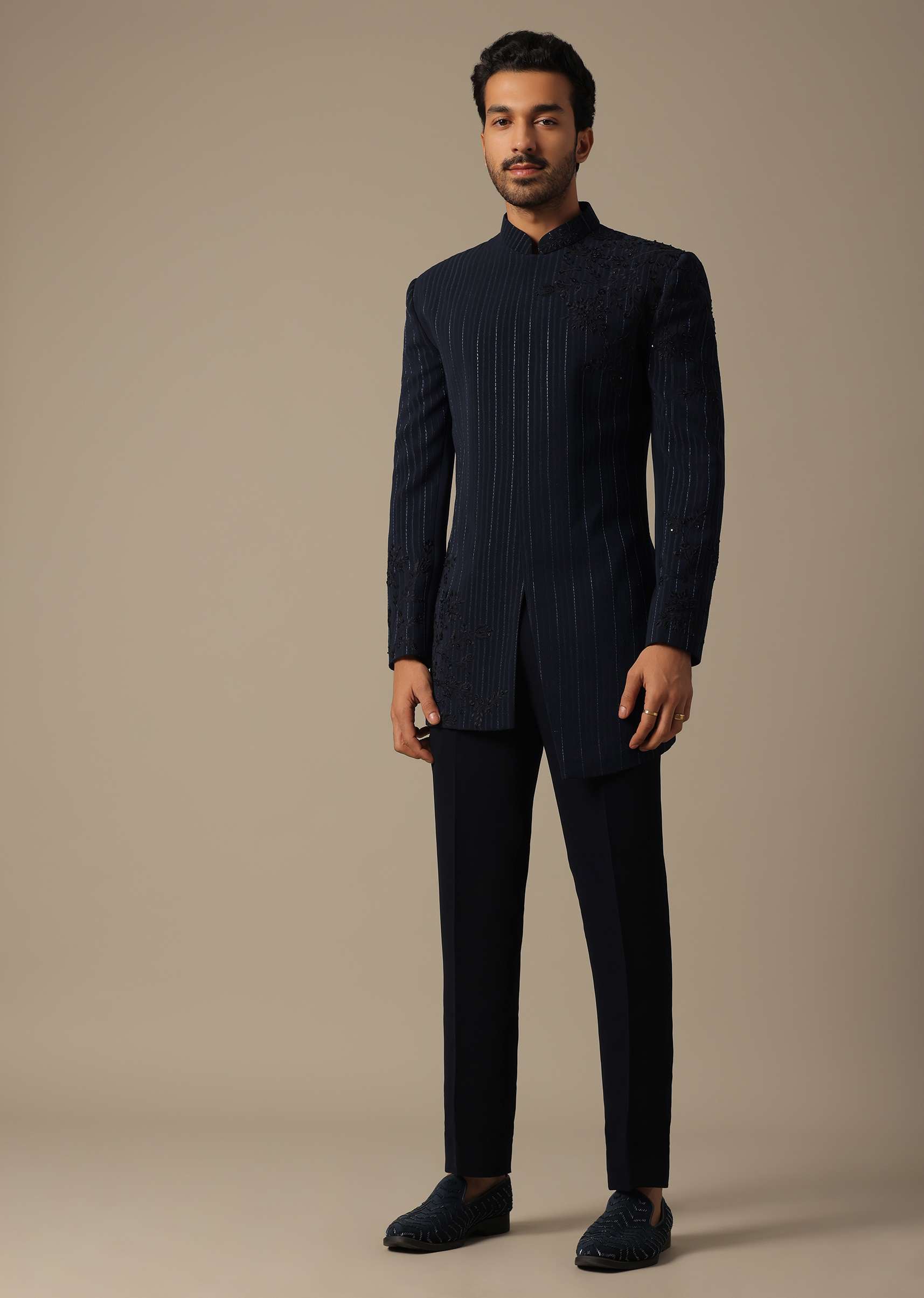 Elevate your reception look with our Blue Suiting Indowestern. It showcases floral cutwork embroidery detailing on the shoulder. The thread jaal work with cut-dana adds a touch of sophistication to this ensemble. This pack includes an indowestern and trouser, offering a classic silhouette. Awarded as the Most Trusted Brand, we're delivering styles you love, just as promised.