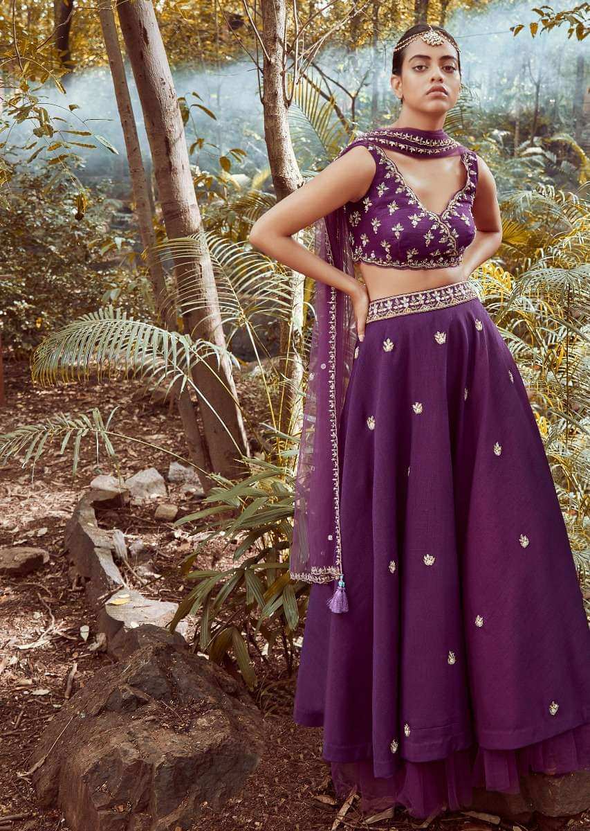 Irish purple lehenga choli in raw silk with cut dana, beads and sequins embroidered buttis. The crop top is enhanced with similar embroidered buttis and border. It is crafted sleeveless... More Product Details