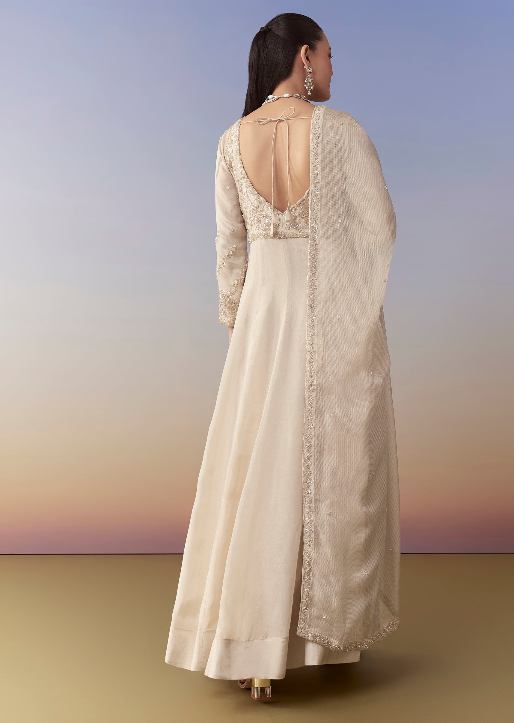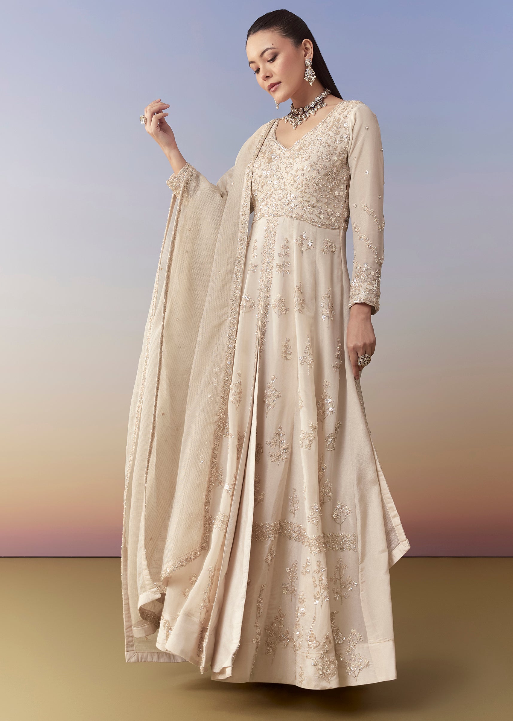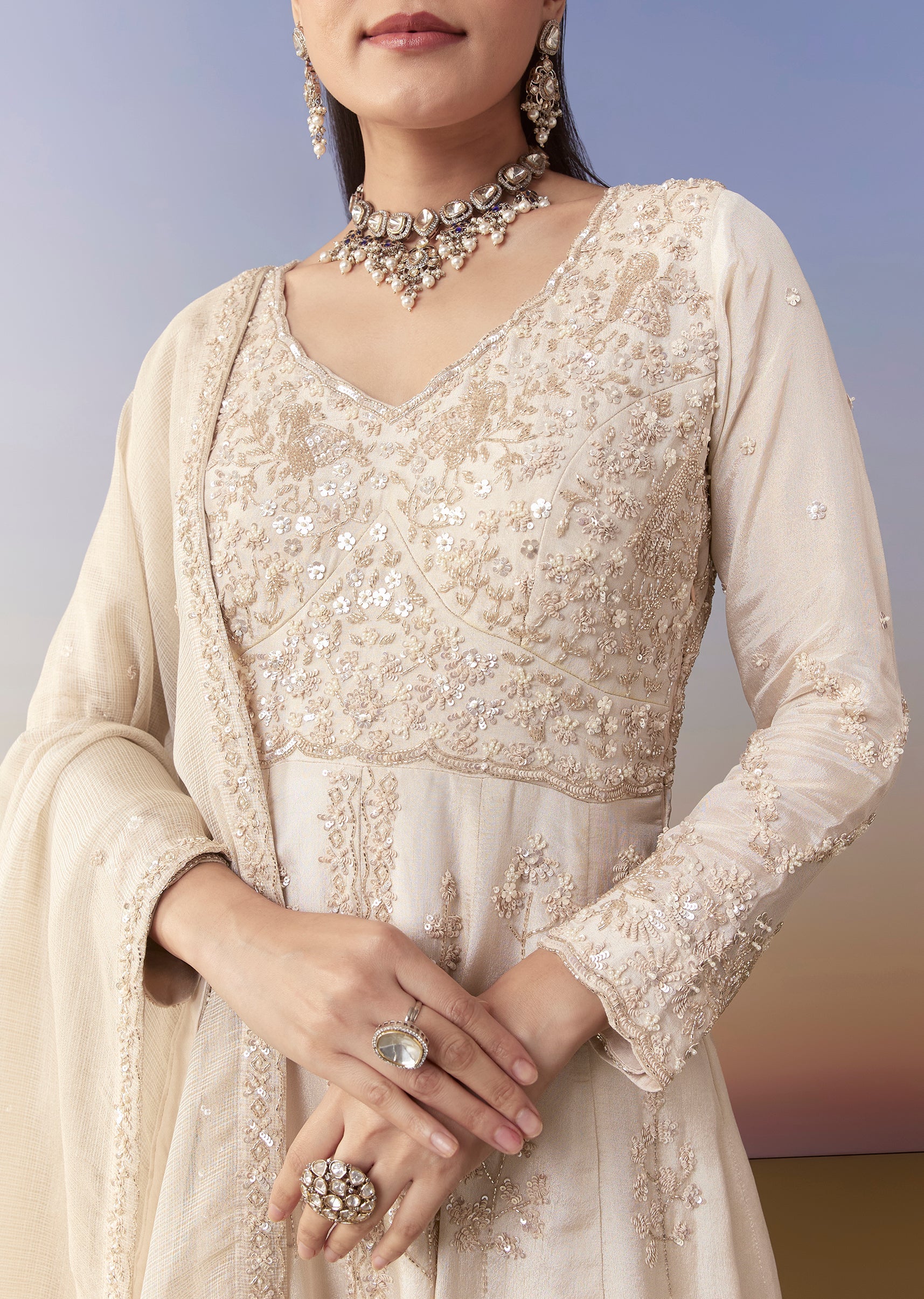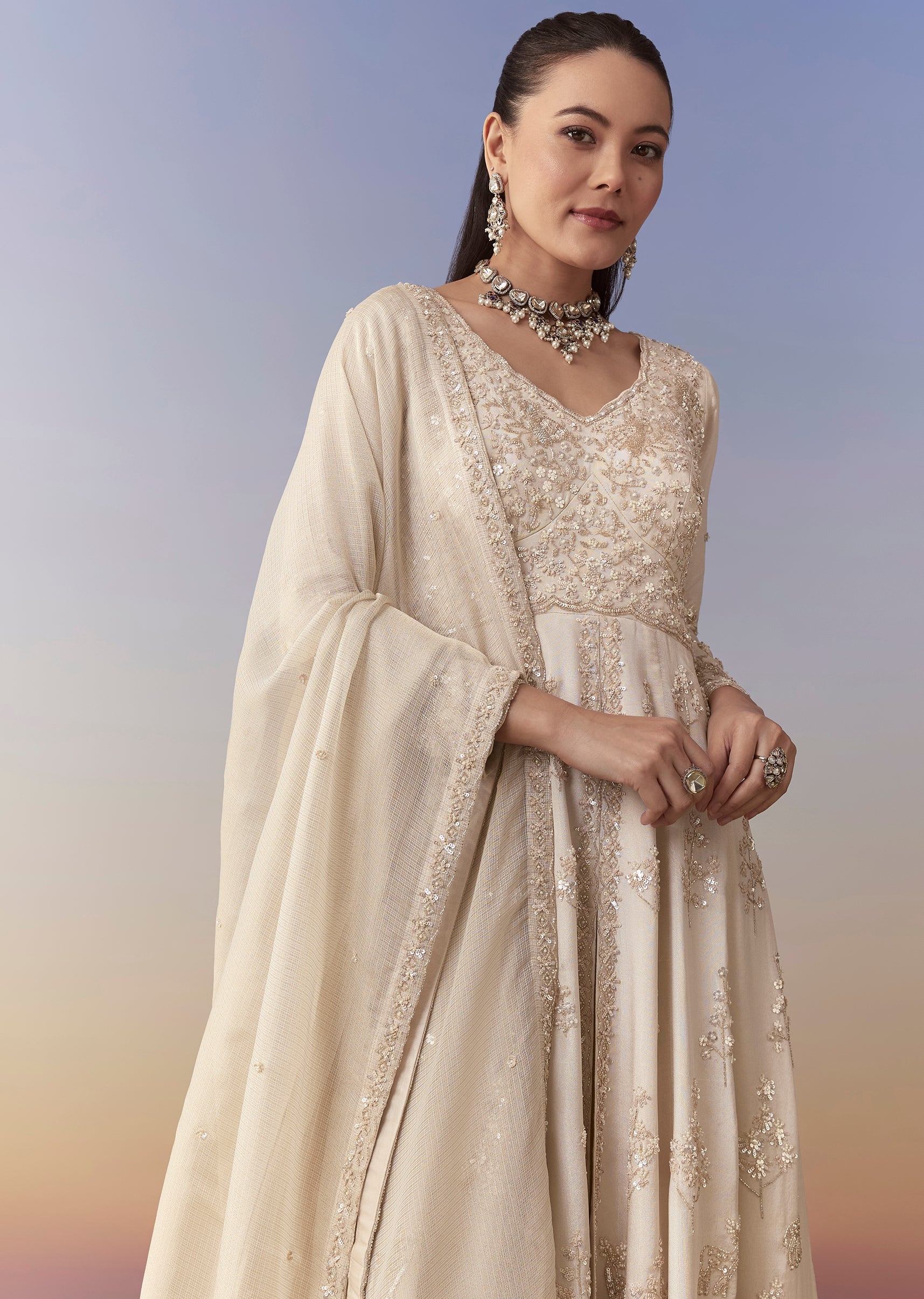 Exude graceful sophistication with this ivory front-slit anarkali set, adorned with intricate cutdana and sequin work that adds a soft, festive shimmer. The flowing tissue dupatta and matching palazzo enhance... More Product Details