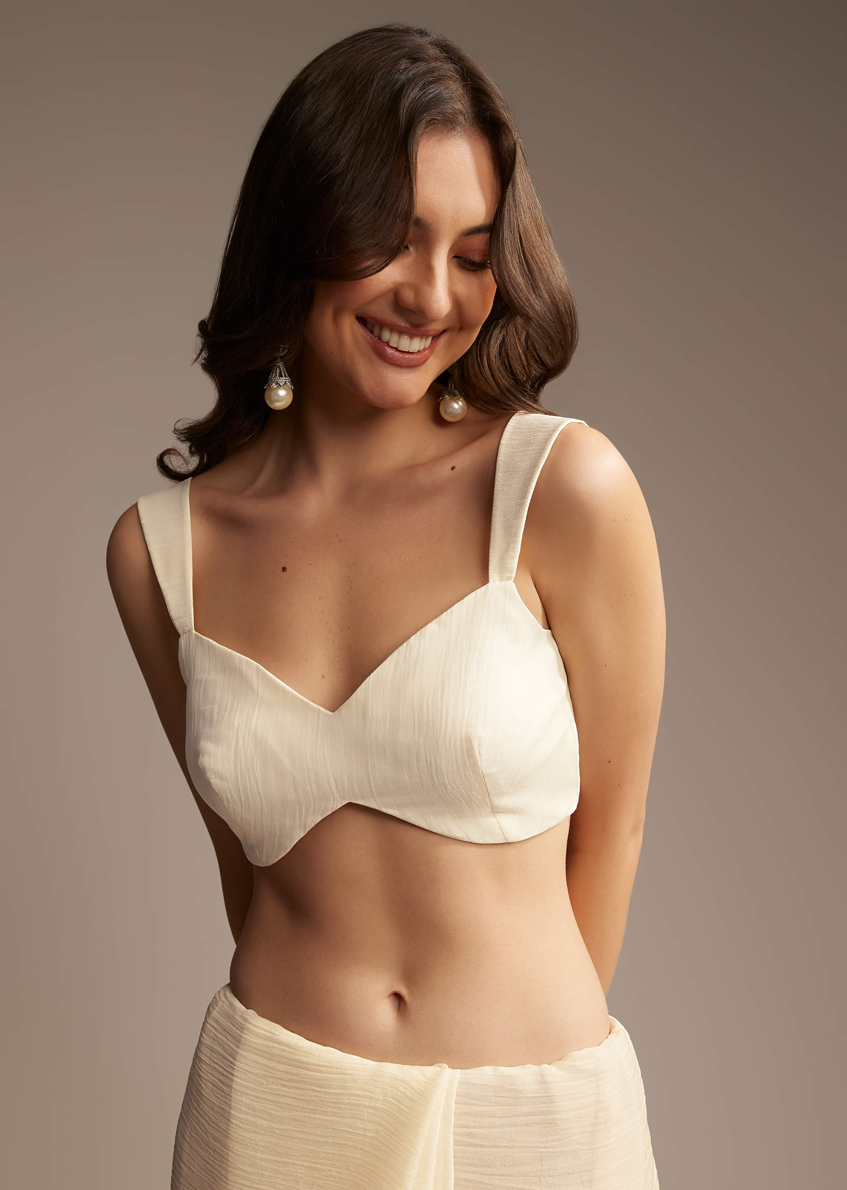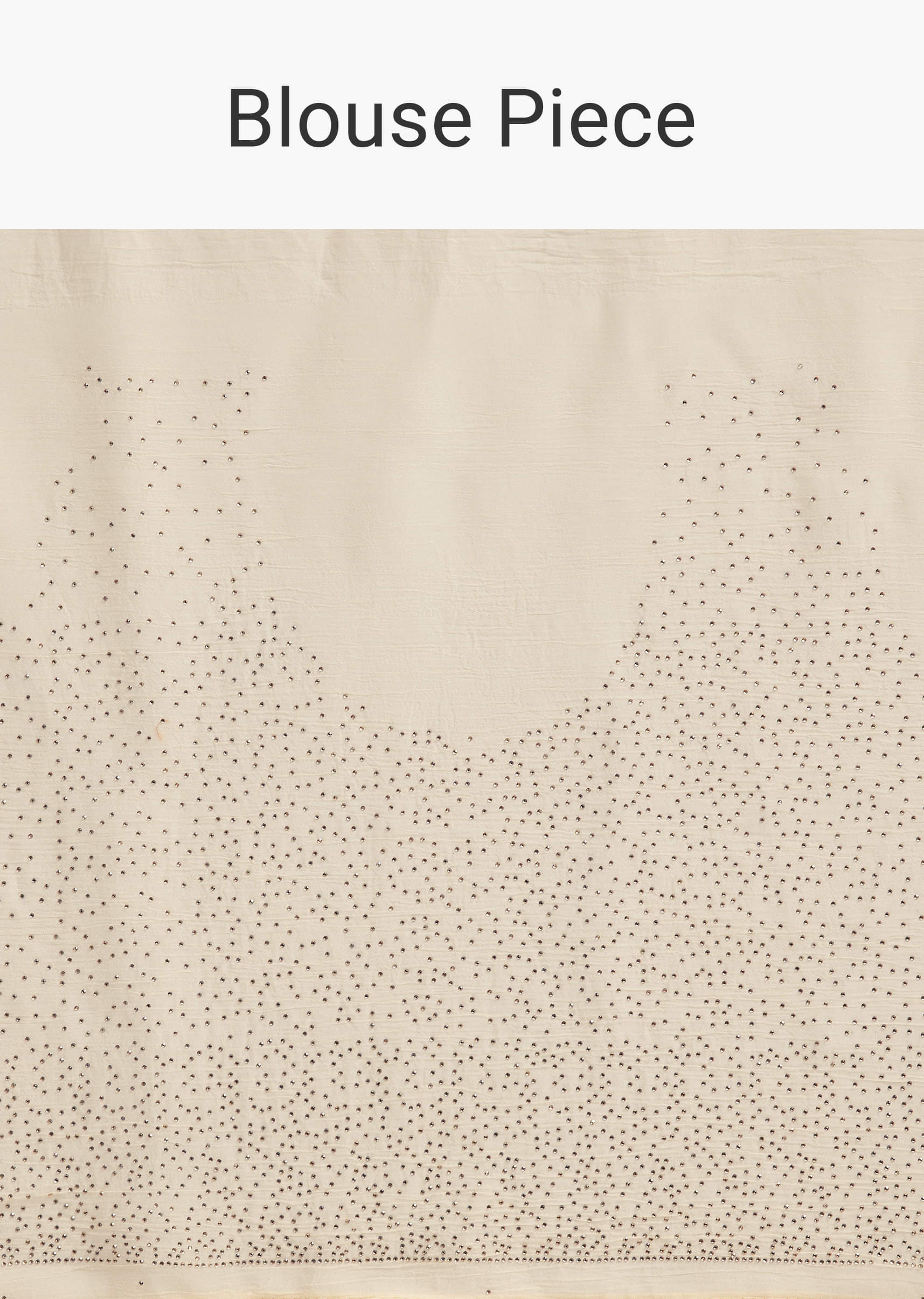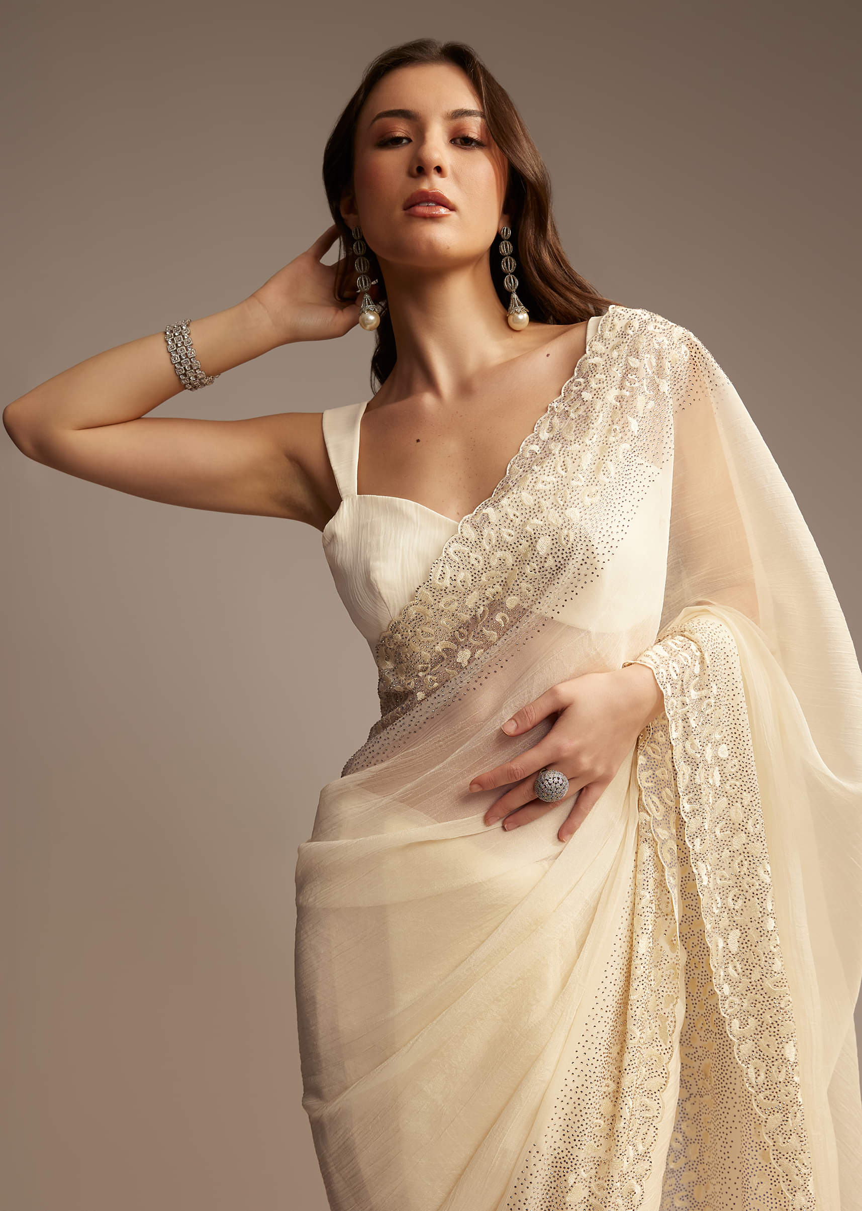 A breezy ivory chiffon saree featuring a resham-embroidered cutwork border, delicately embellished with stones. The shimmer traces the saree’s edges while the blouse fabric lends a graceful highlight to its soft, sheer drape. Understated yet striking, it's perfect for day-to-evening celebrations. Awarded as the Most Trusted Brand, we're delivering styles you love, just as promised.