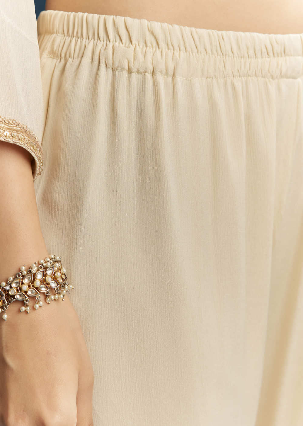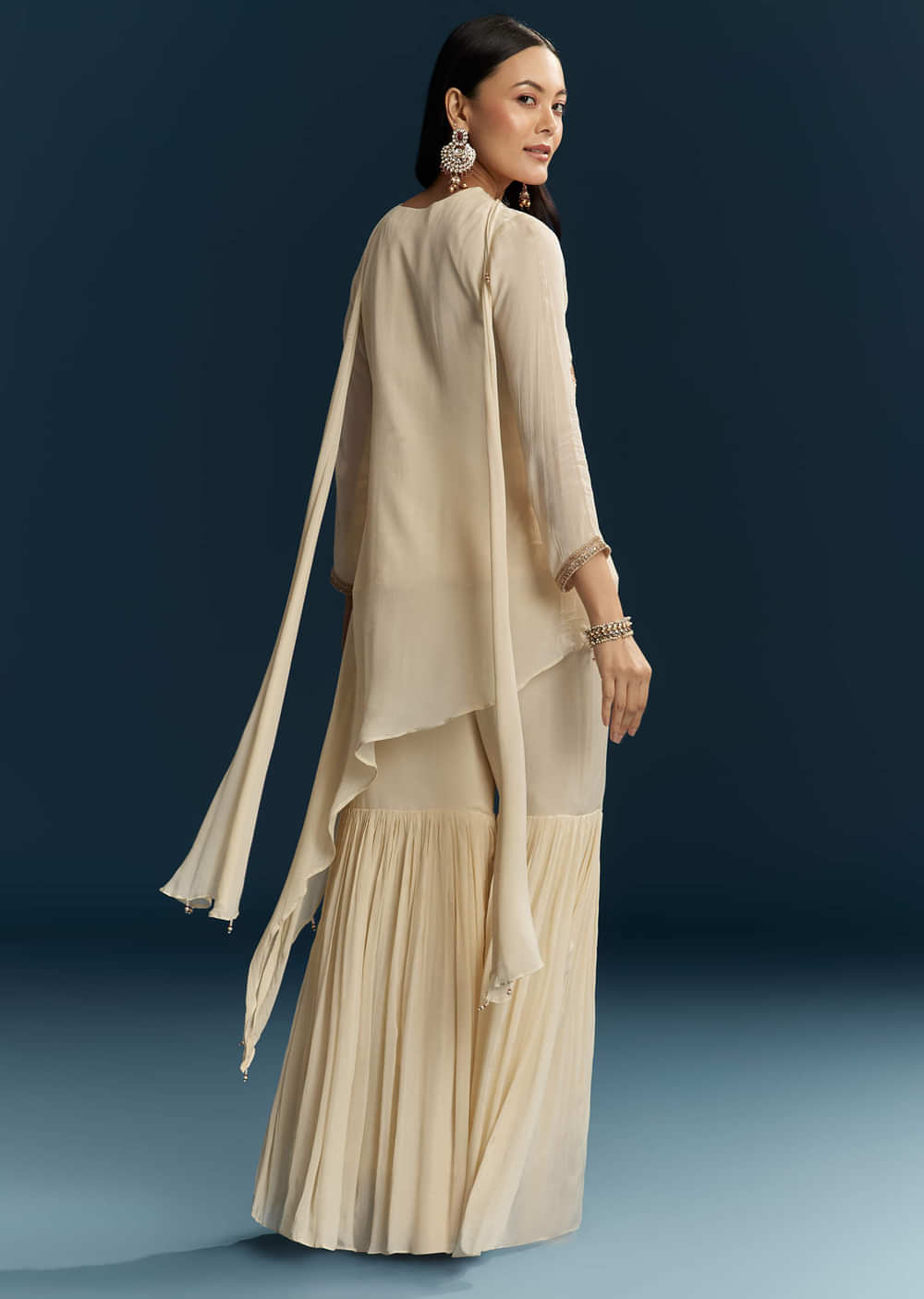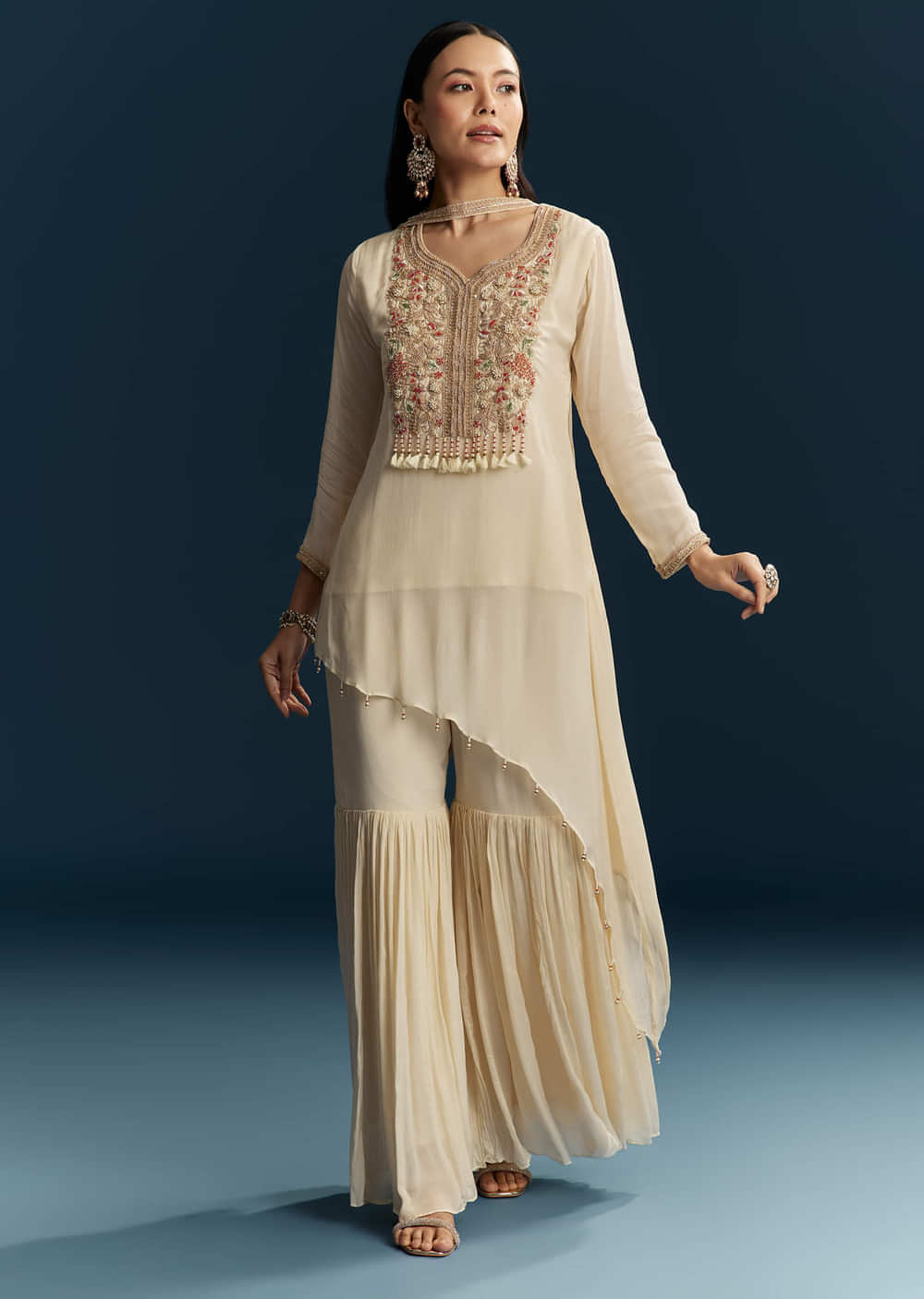 Clean and striking, this ivory chinon sharara suit is lifted with delicate zardosi embroidery and an asymmetrical cut. It’s a statement piece that balances minimal colour with standout detail. Awarded... More Product Details