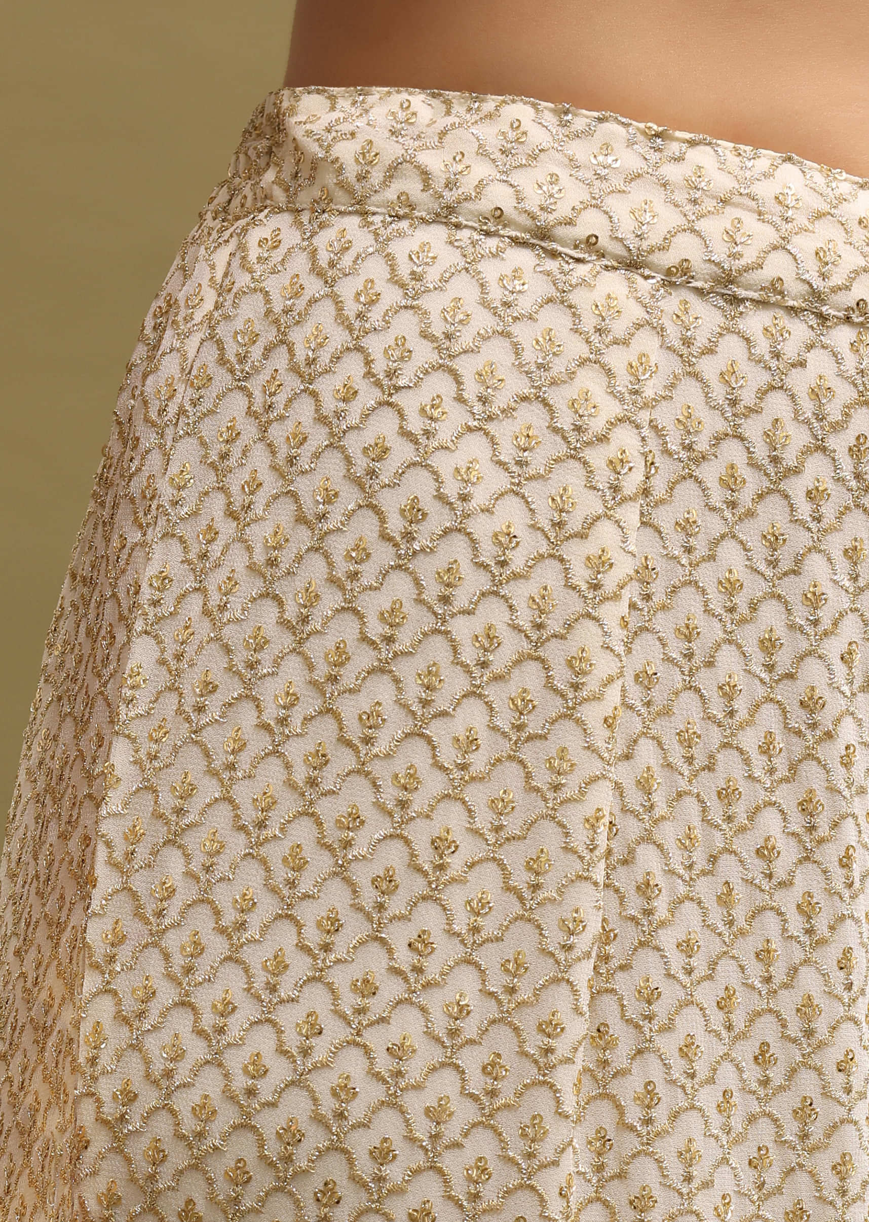 Radiate in our ivory kurta sharara set, designed especially for festive and celebratory occasions. Made from georgette, this ensemble is adorned with mirror, zari, and stone embroidery. The kurta is... More Product Details