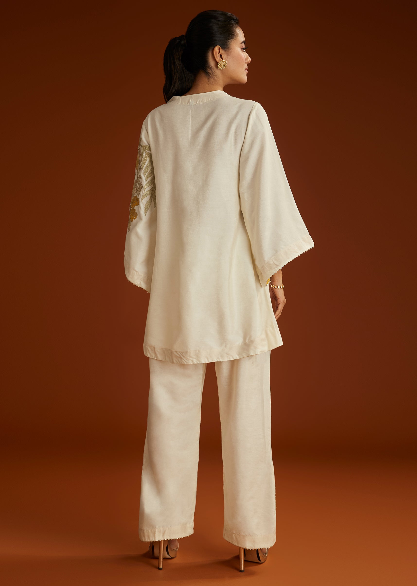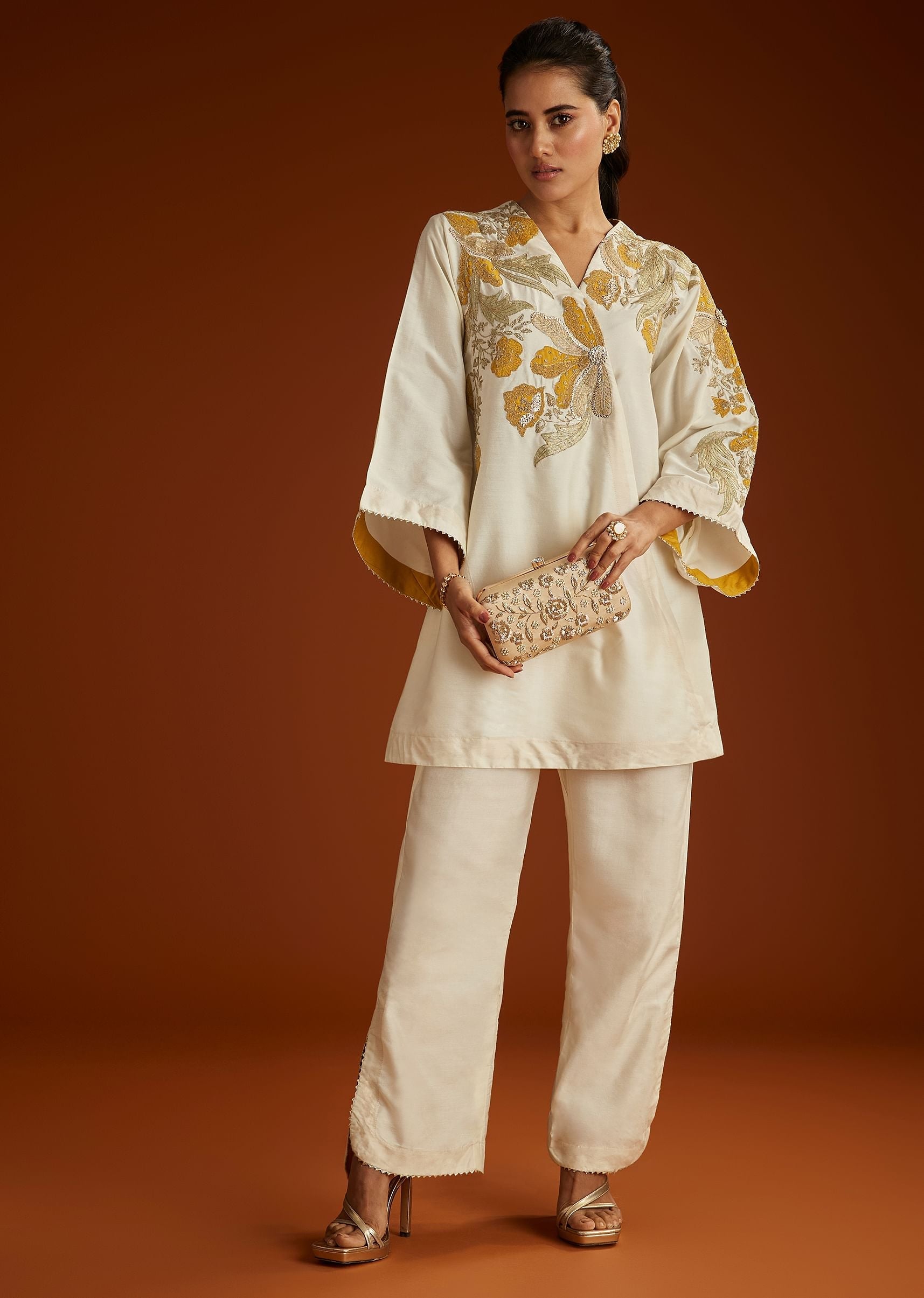 Ivory Floral Applique Work Kurta Pant Set With Gotta Lace