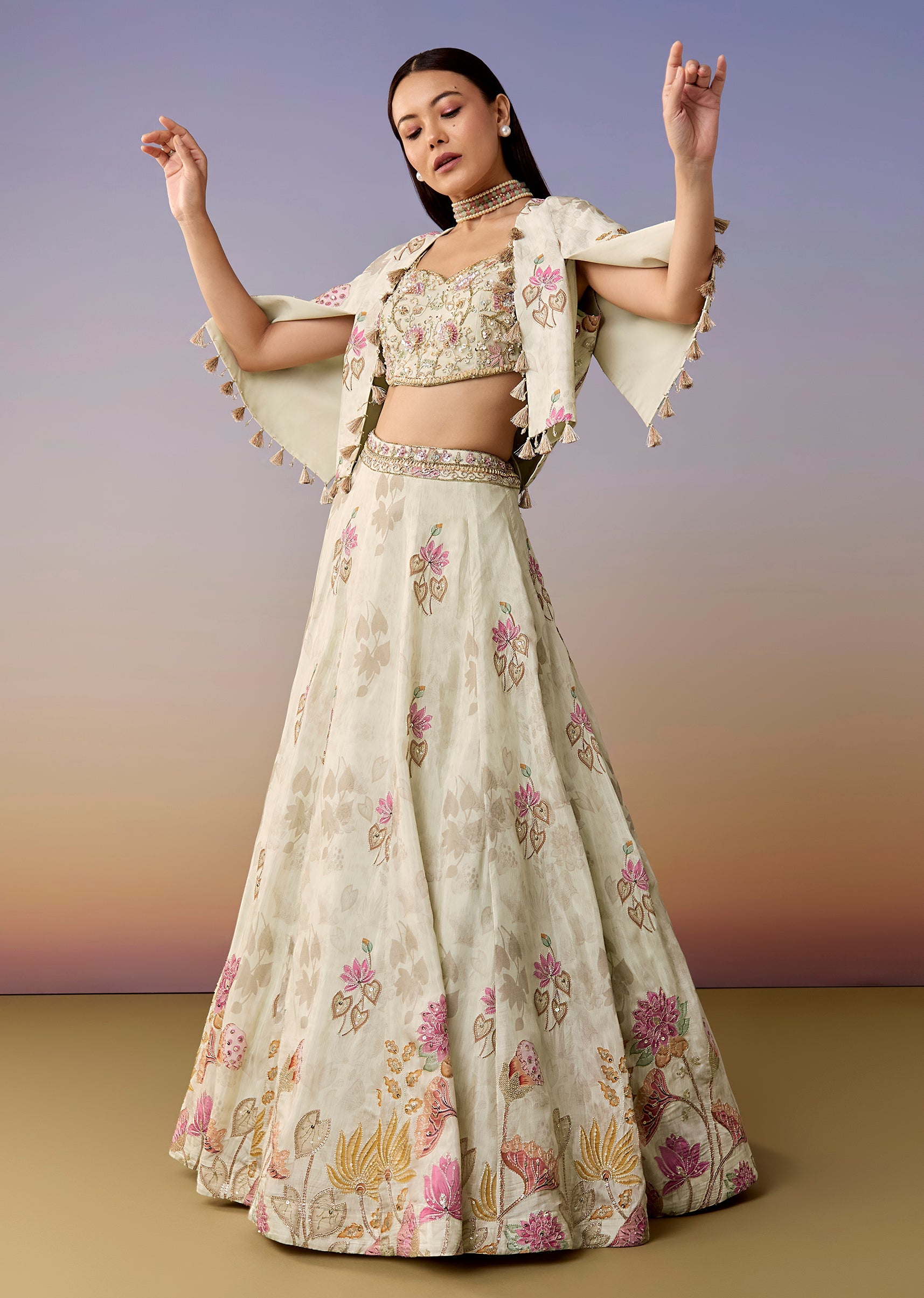 A pastel-multi floral printed crepe lehenga set featuring a sweetheart sequin-work choli, flared lehenga, and a statement cape instead of a dupatta. A fresh pick for haldi, mehendi, and sangeet.... More Product Details